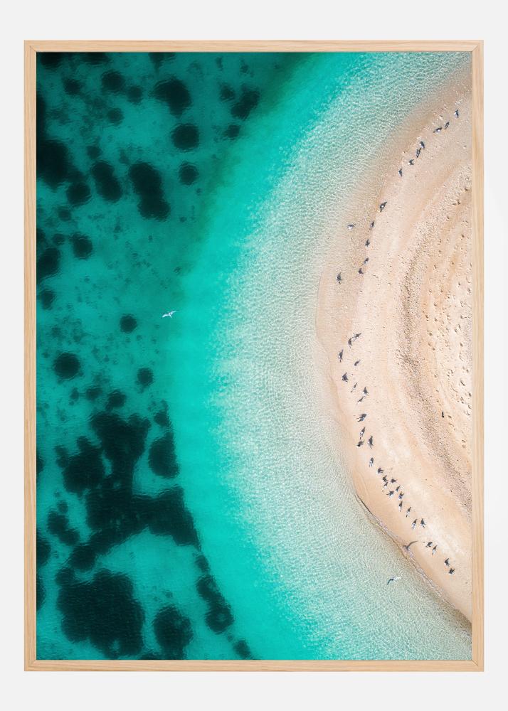 Zračna fotografija prekrasne plaže. Veličanstveno tirkizno more savršeno se stapa s ružičastim pijeskom. Tamno kamenje na morskom dnu daje dodatnu boju ovom fantastičnom tisku. Zamislite da se već danas nalazite na ovoj plaži.
