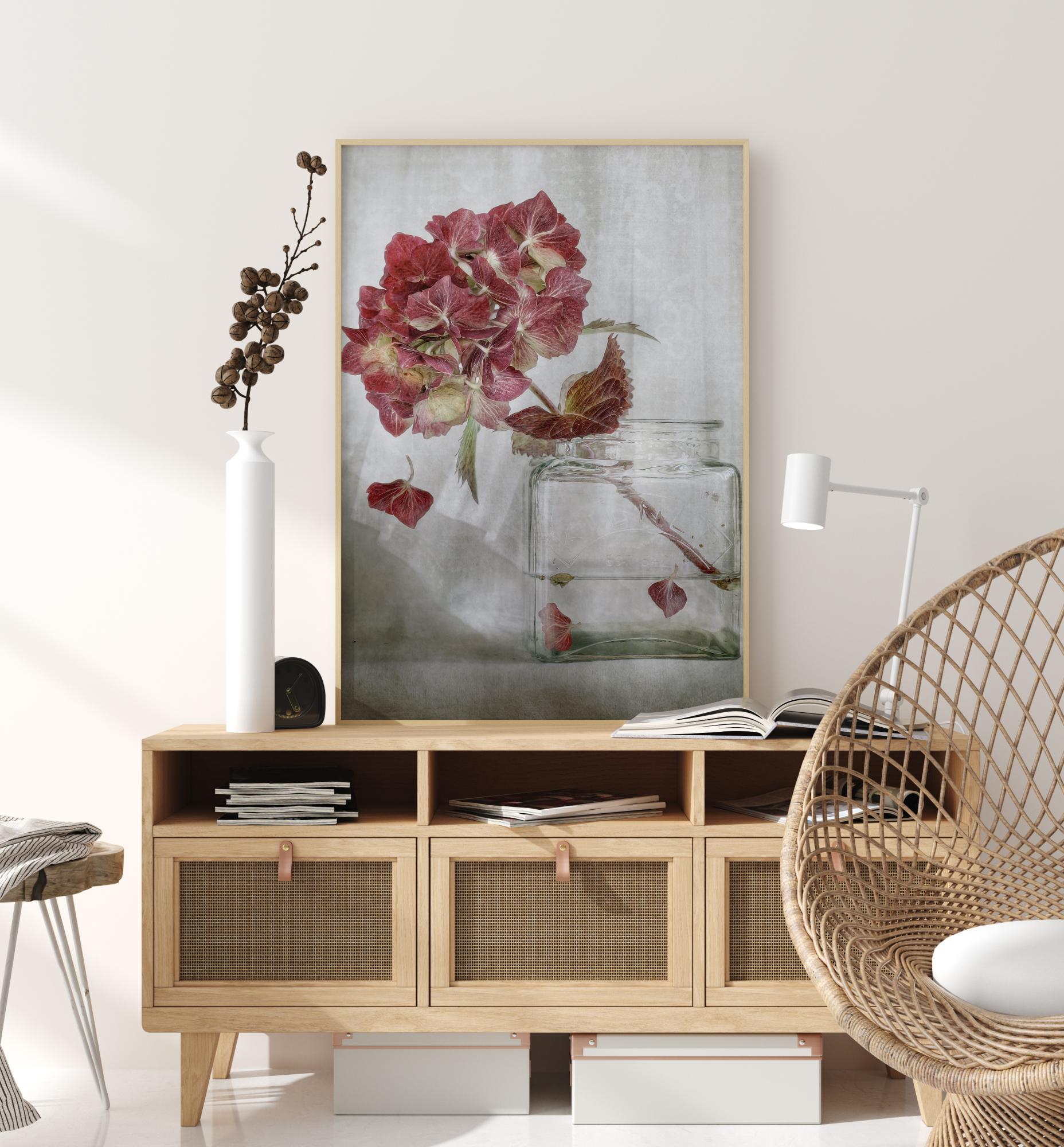 Prekrasan poster prirode s hortenzijom u prozirnoj vazi. Ispred cvjetne bijele zavjese pada nježna ružičasta latica. Zavjesa leprša na laganom povjetarcu. Ova slika gotovo vas tjera da osjetite povjetarac.