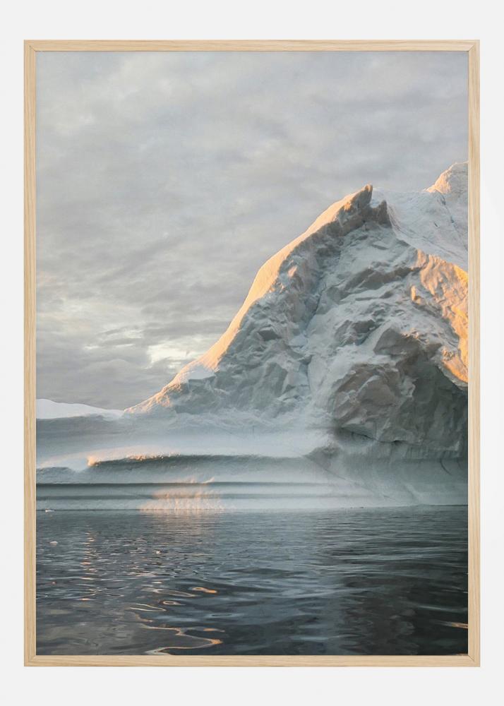 Ovaj zadivljujući poster odražava ledenjak u dubokom, hladnom moru prema oblačnom sivom nebu. Mala snijegom pokrivena planina djelomično je osvijetljena sunčevom svjetlošću. Kristalno plavo more nježno mreška u prvom planu i stvara mirnu sliku. Savršena slika za objesiti iznad kamina u vašoj zimskoj kućici.