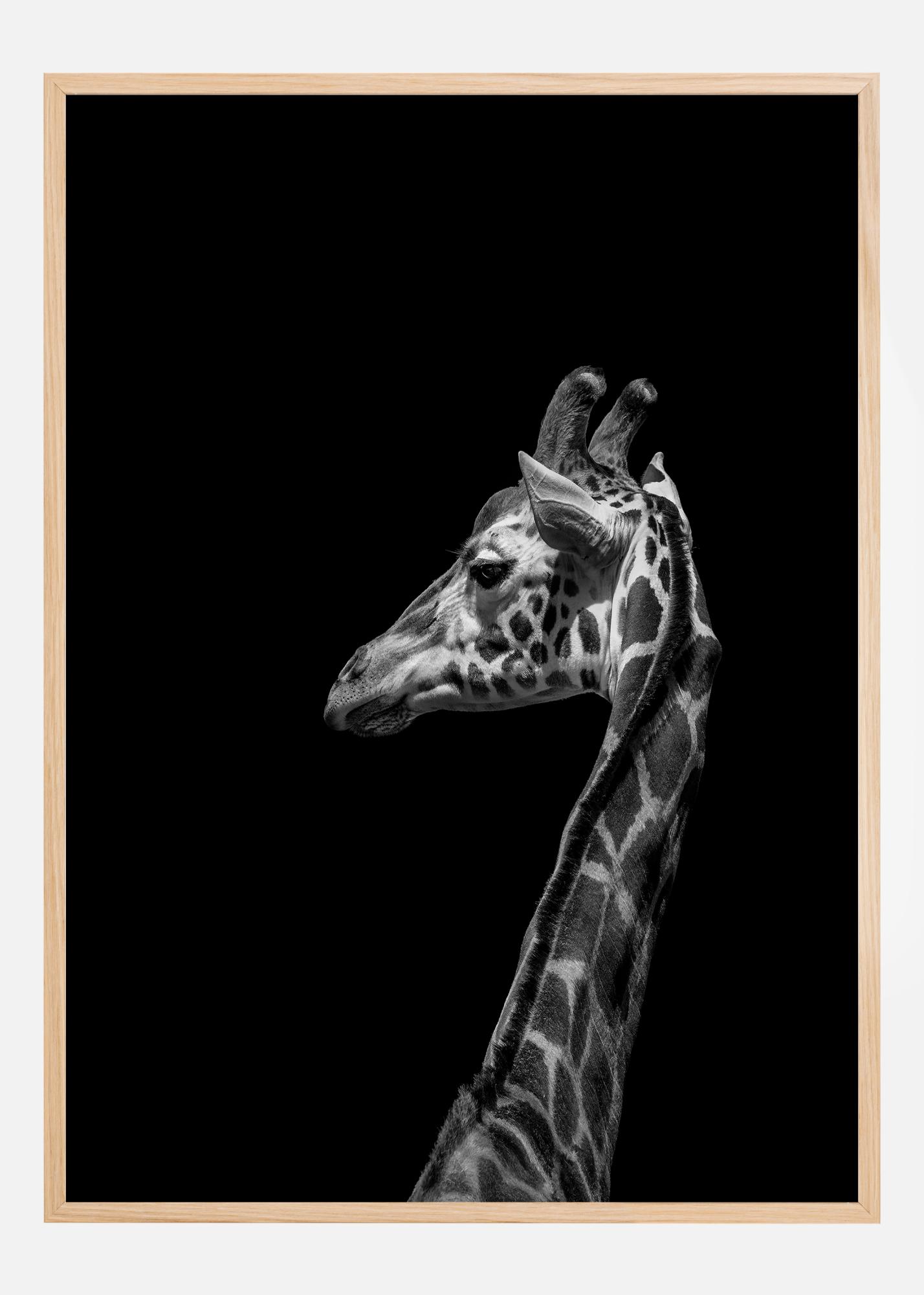 Ovaj smjeli i izražajni poster prikazuje veličanstvenu žirafu na pozadini crnoj kao ugljen, što stvara dramatičan kontrast koja plijeni pogled promatrača. Jedinstveni uzorak žirafe u sivoj skali je vješto uhvaćen, s naglašenim svakim pjegom i linijom u detalje. Detaljna tekstura kože žirafe i nježne nijanse sive na crnoj pozadini stvaraju gotovo trodimenzionalni efekt.