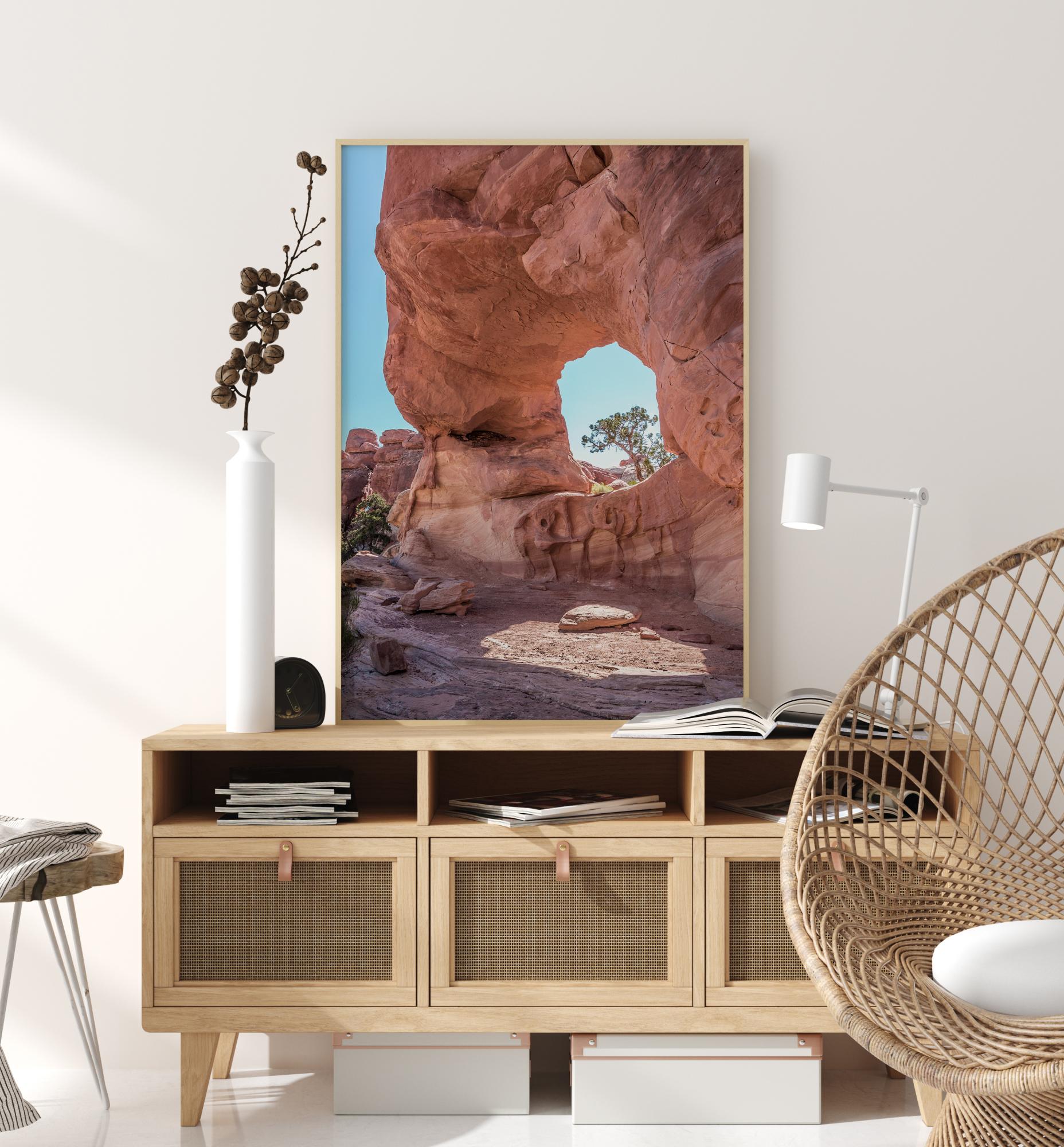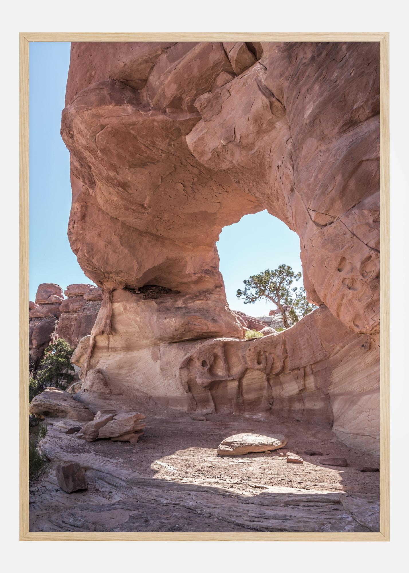 Impresivan plakat prirode s narančastim kamenom koji ima rupu u sredini. Malo stablo pojavljuje se na drugoj strani rupe. Sunce sjaji kroz rupu u stijeni i stvara zasjenjeno područje ispred stijene. Lijepe jarke boje savršene su za osvjetljavanje dosadne sobe.