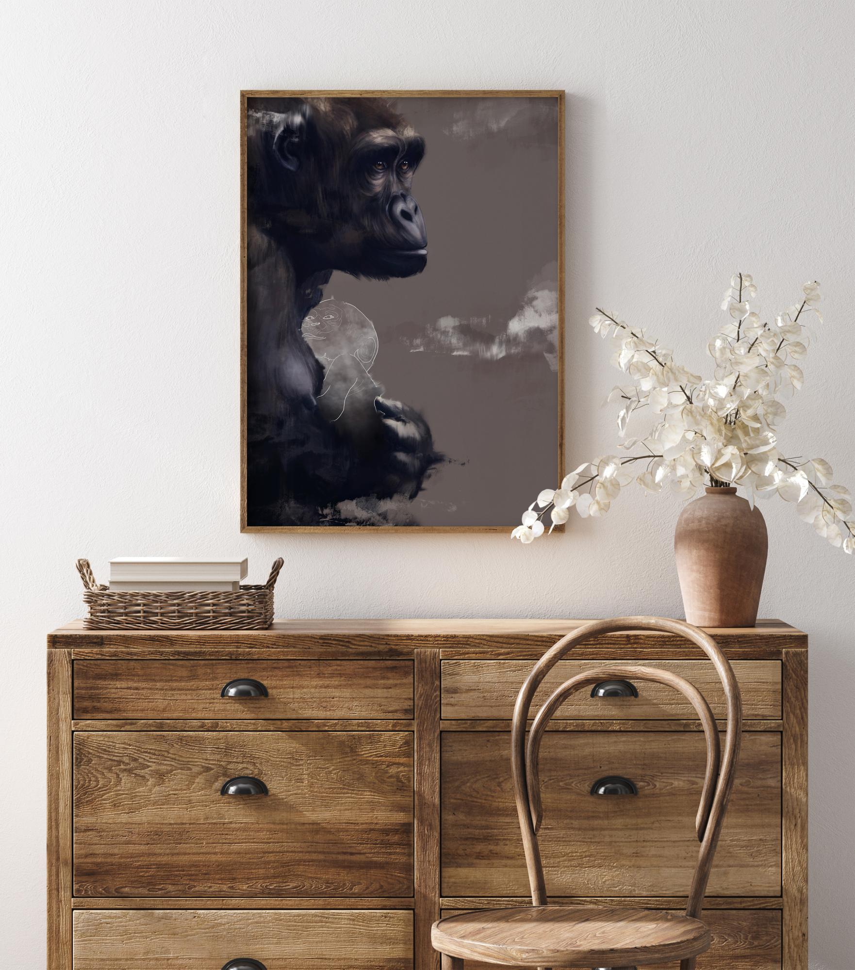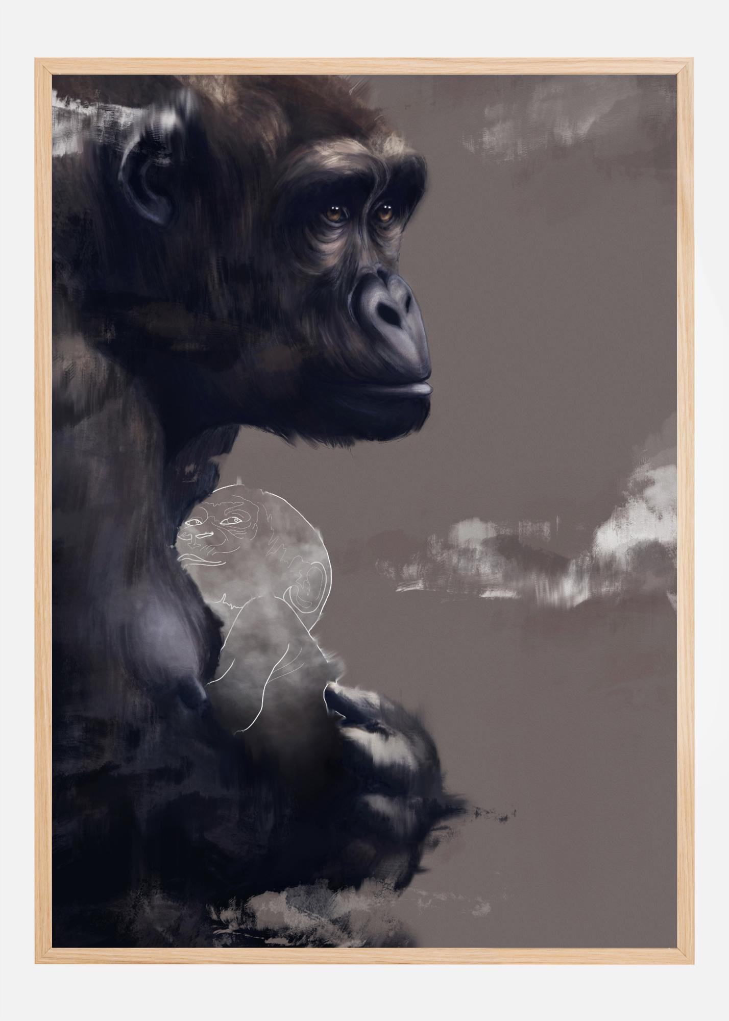 Zapanjujući plakat prirode s gorilom koja drži svoje novorođeno dijete. Na svijetlosmeđoj pozadini, ovaj snažni primat pokazuje snažan, ali ipak blag majčinski instinkt. Ova slika gorile koja štiti novorođeno dijete u svojim nježnim rukama savršen je tiskani motiv za sve ljubitelje životinja.