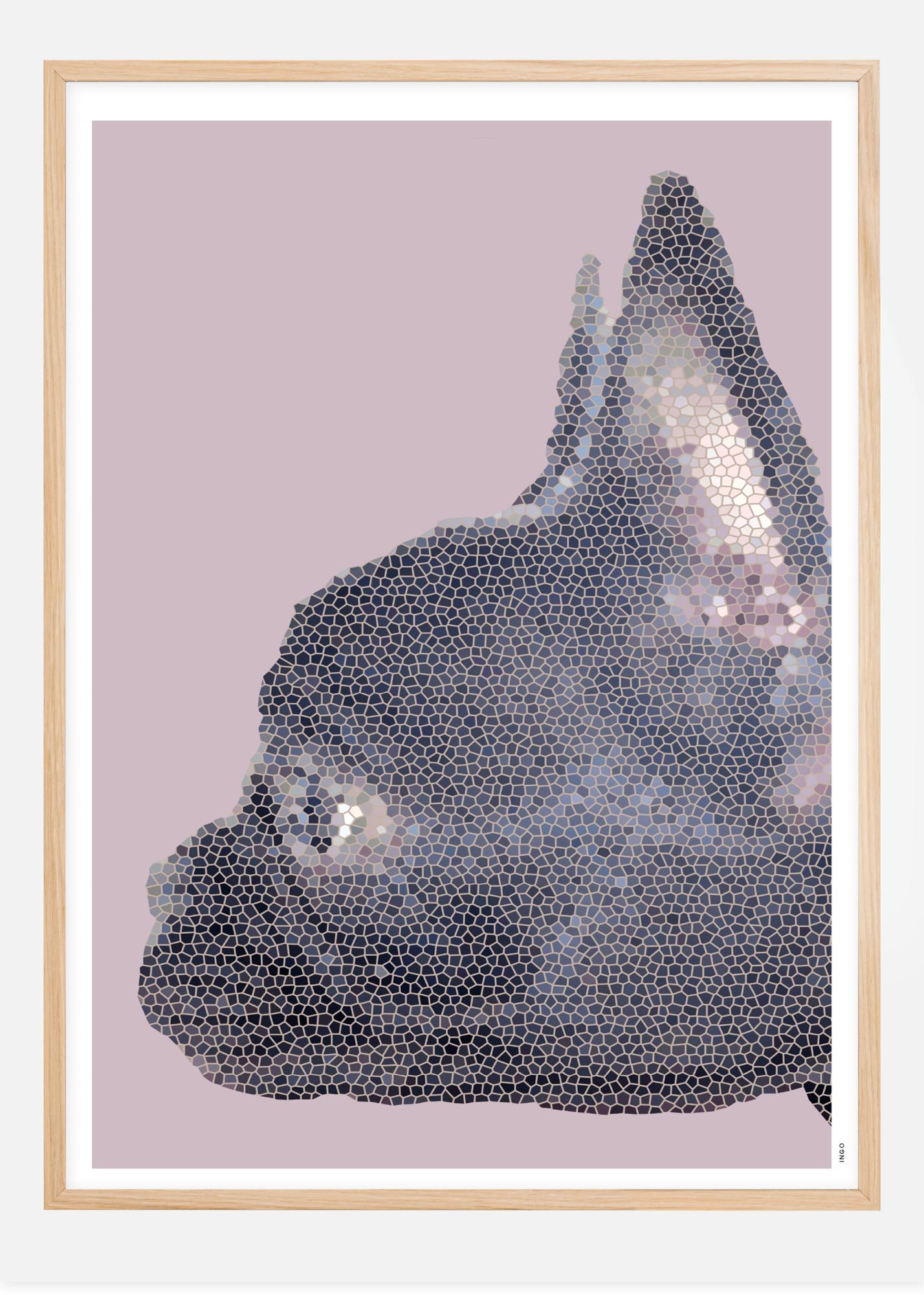 Mozaik otisak u crno-bijeloj boji s karoliner psom. Na ružičastoj pozadini prirodna svjetlost reflektira se na uho i oko psa. Sa svojom snažnom čeljusnom linijom i šiljastim ušima pas gleda ulijevo od otiska kao da gleda nekoga. Prekrasan poster koji je savršen za ljubitelje životinja.