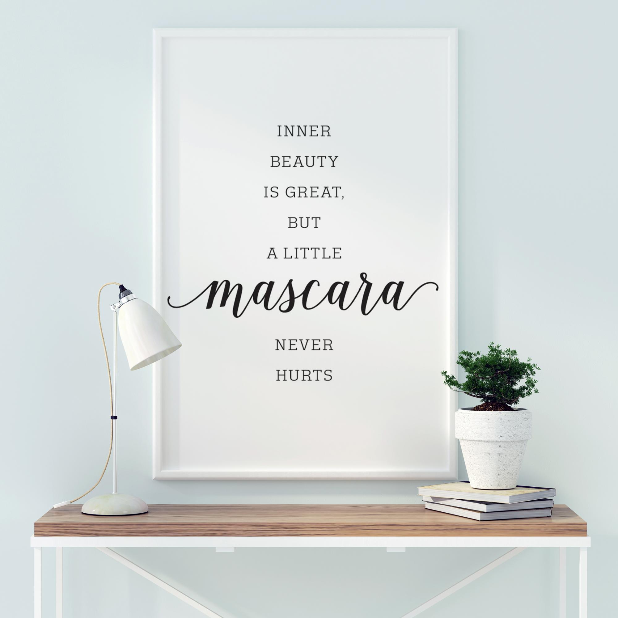 Inspirativni poster koji prenosi poruku za sve koji vole izgledati dobro. Unutarnja ljepota je dobra, ali malo maskare nikad ne škodi. Poruka koju treba slijediti za taj dodatni poseban izgled. Prekrasan tisak za objesiti pored vašeg stolića za šminkanje.
