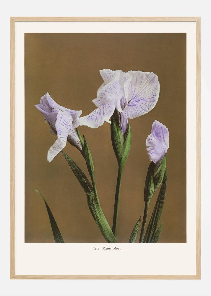 Ovaj izvrstan poster prikazuje veličanstvenu Iris Kaempferi, često poznatu kao japanski iris, koja ponosno pokazuje svoje osebujne ljubičaste i bijele latice. Prozirni cvjetovi u varijantama ljubičaste boje, od pastelnih nijansi do dubljih tragova ljubičaste, upotpunjeni su tankim linijama i uzorcima koji pridodaju osjećaj elegancije i detaljnosti. Na jednoličnoj smeđoj pozadini, graciozan oblik biljke ističe se, čineći ovaj print upadljivim dodatkom svakom dizajnu interijera.