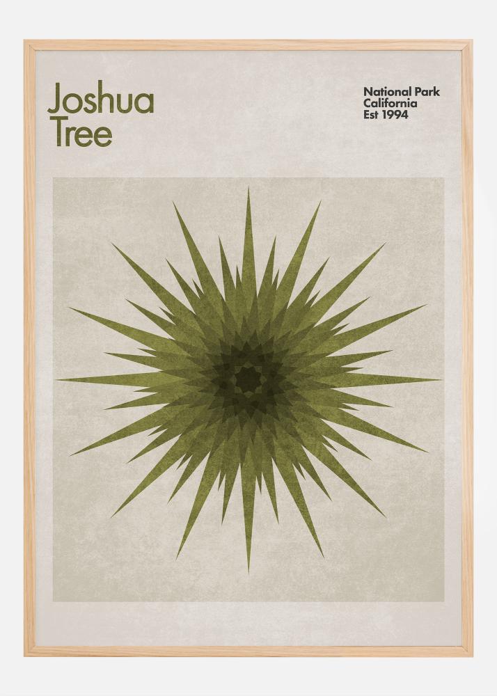 Ovaj dojmljivi poster prikazuje apstraktnu interpretaciju ikoničnog Joshuinog stabla, centriranu i istaknutu u sredini slike. Duboka zelena boja u motivu asocira na umirujuću prirodu i čvrsti pustinjski krajolik kojem je stablo dom. Apstrakcija stabla, s proširenim vrhovima, stvara gotovo hipnotizirajući uzorak koji je istodobno suvremen i bezvremenski.