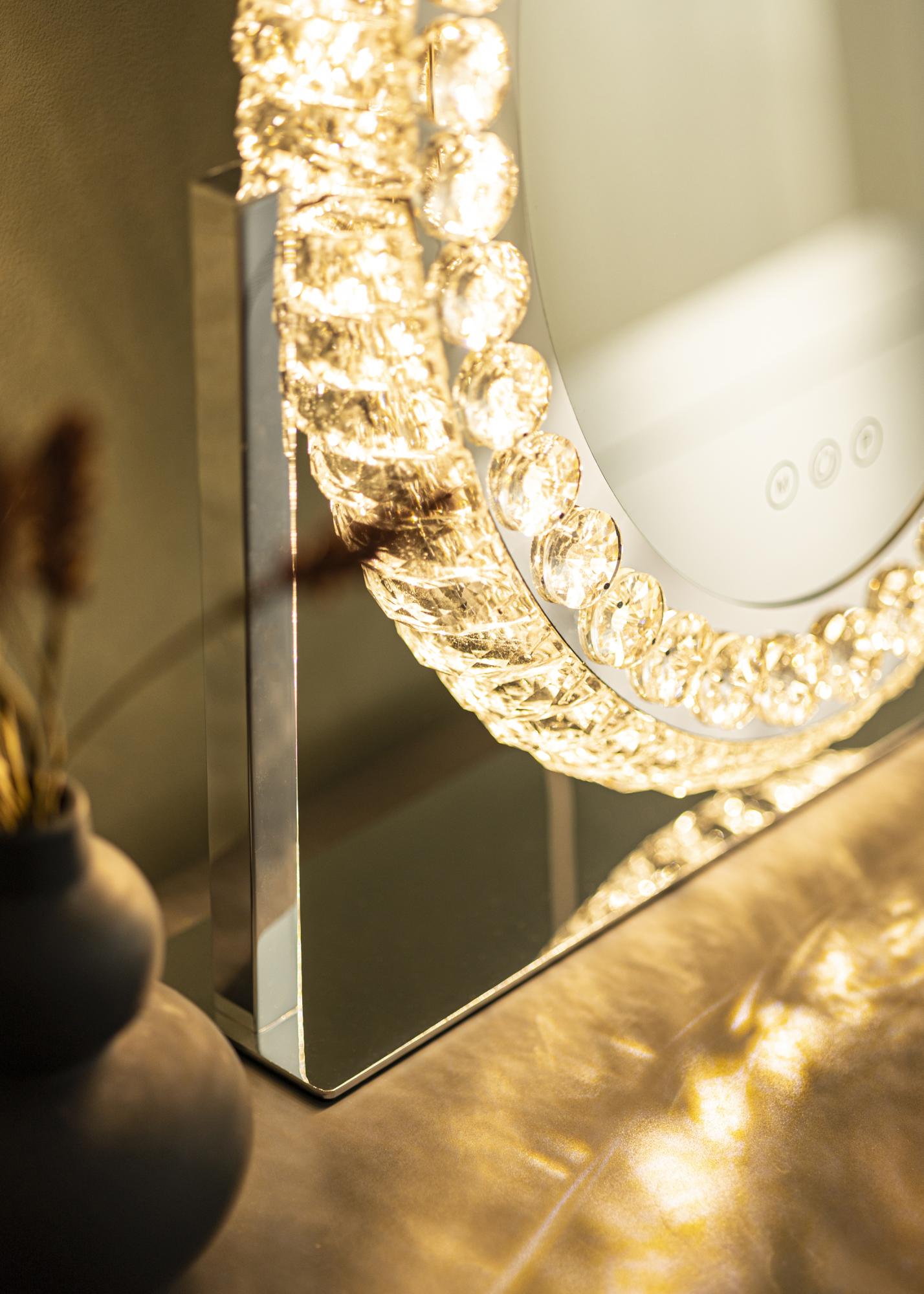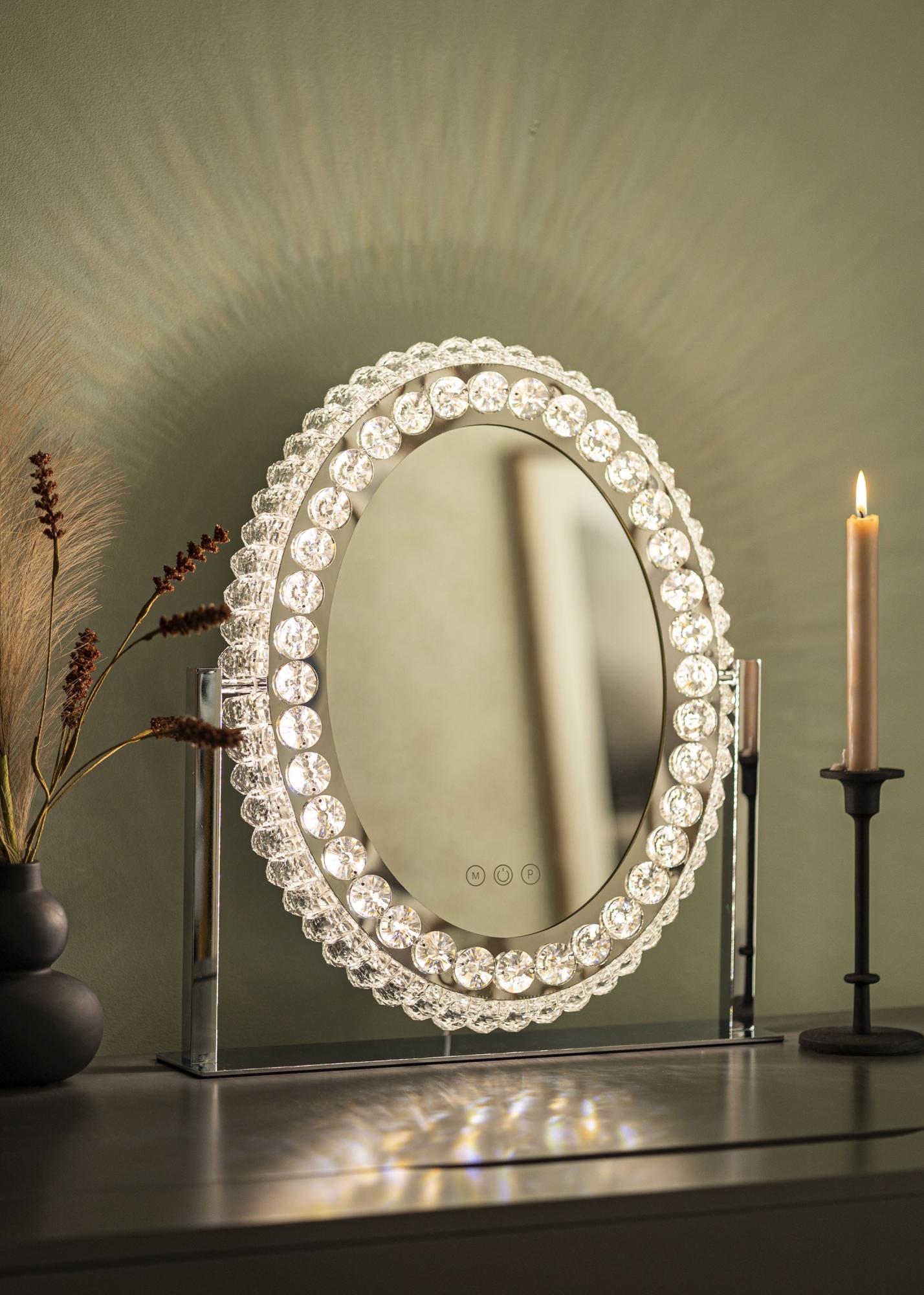 Ovo je ogledalo za Å¡minkanje u klasiÄnom stilu, s dekorativnim okvirom i LED osvjetljenjem. Ovalni oblik ogledala i okvir s ukrasima nalik kristalu daju mu luksuzan izgled koji se lijepo uklapa kako u spavaÄu sobu, tako i u dnevni boravak. IzraÄeno je od nehrÄajuÄeg Äelika i ima stojeÄi dizajn.