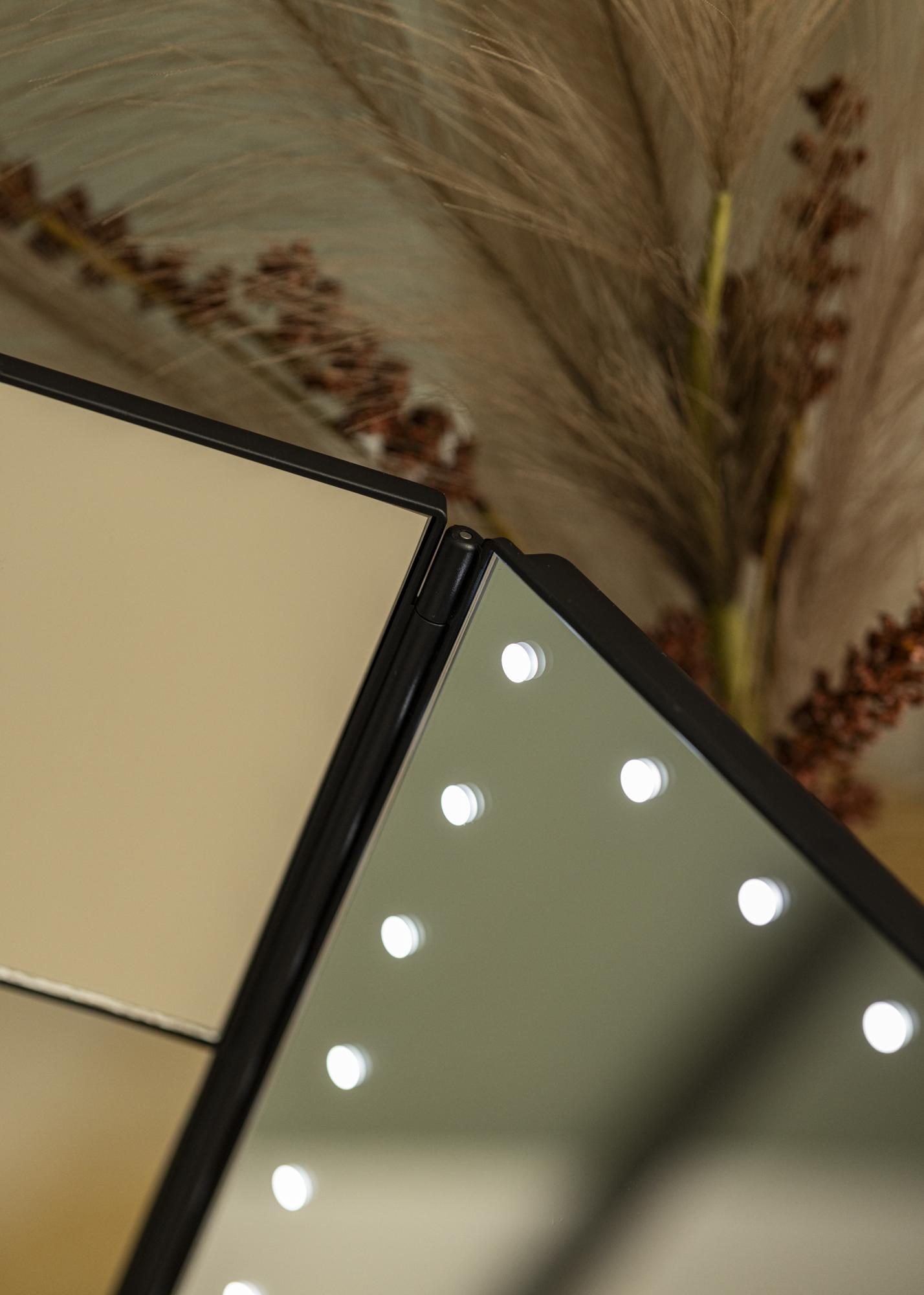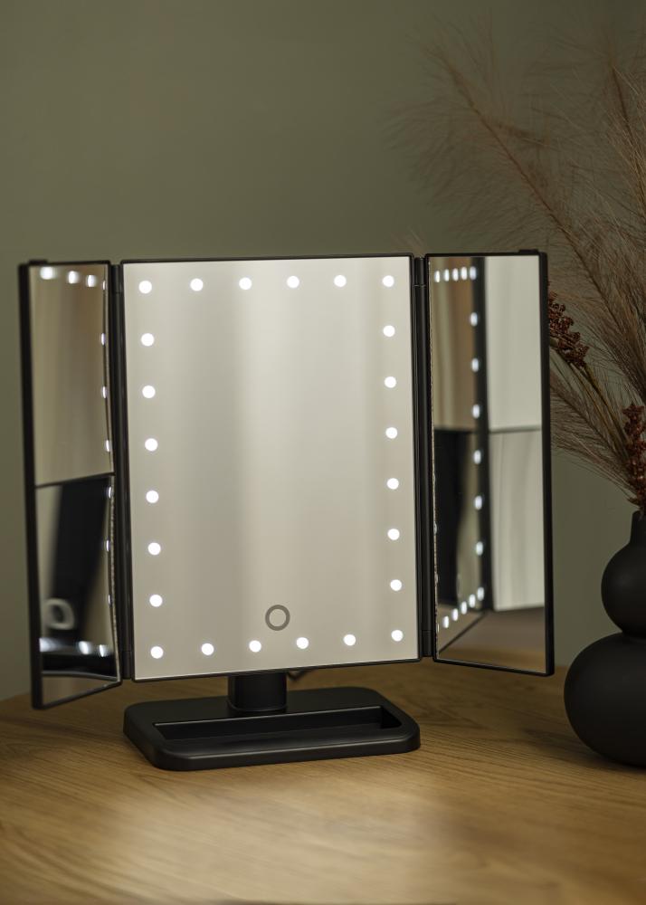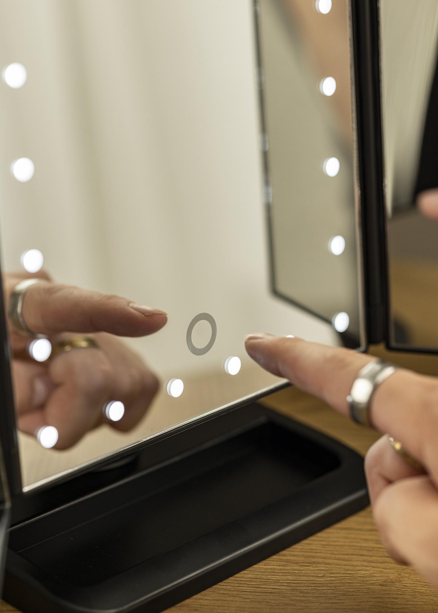 Trendovsko crno 4-u-1 ogledalo za šminkanje u švedskom dizajnu iz KAILA-e. Ovo ogledalo za šminkanje omogućuje vam da se ogledate iz različitih kutova s tri strane ogledala i ima prilagodljivu podlogu koja omogućuje rotaciju ogledala u 180°. Lijeva strana ogledala ima povećavajuće staklo s 2x i 3x zumom. Oko velike površine ogledala u sredini nalazi se 24 dekorativne LED lampice koje pružaju ugodnu toplu bijelu svjetlost od 3000K. Integrirano LED osvjetljenje uključuje se pritiskom na touch-tipku i jednostavno se podešava držanjem tipke barem dvije sekunde. Ogledalo za šminkanje mjeri 38x25 cm i lako se sklapa kada se ne koristi.