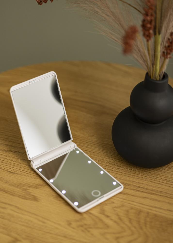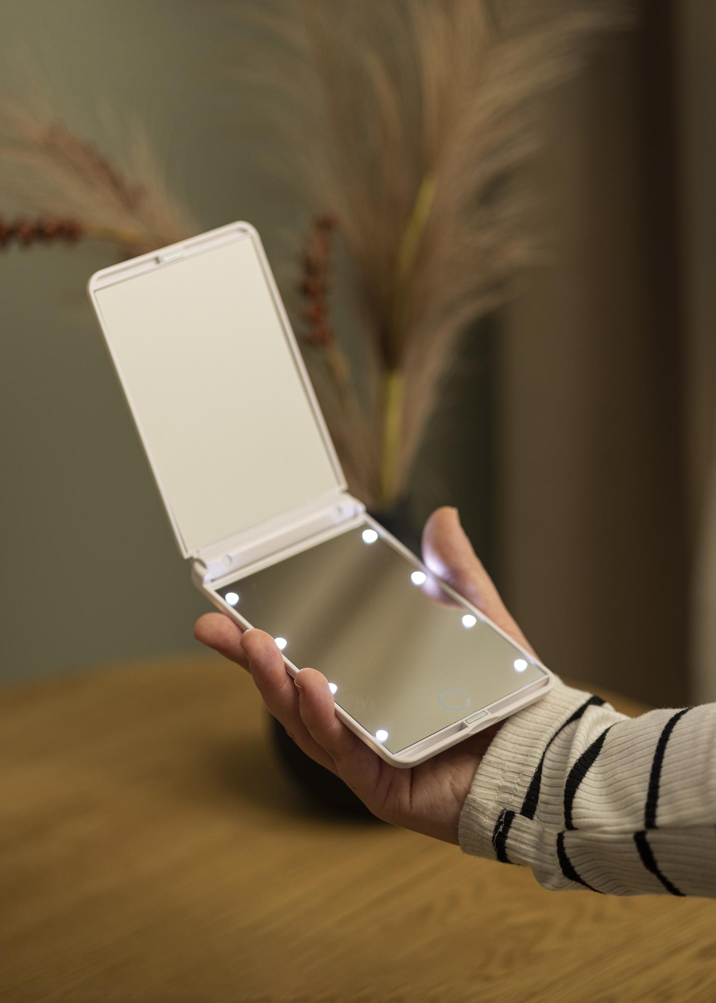 Ovo je sklopivo ogledalo za Å¡minkanje u bijelom elegantnom dizajnu koje vam omoguÄava jednostavno ogledanje gdje god se nalazili. Ogledalo za Å¡minkanje ima integriranu rasvjetu oko kristalno bistrog stakla u obliku 8 jakih LED svjetala. Gornje ogledalo ima poveÄavajuÄe staklo s x2 zoomom. LED rasvjeta je priguÅ¡iva i daje ugodnu toplu bijelu svjetlost od 3000K koja se lako podeÅ¡ava držanjem touch gumba na ekranu.