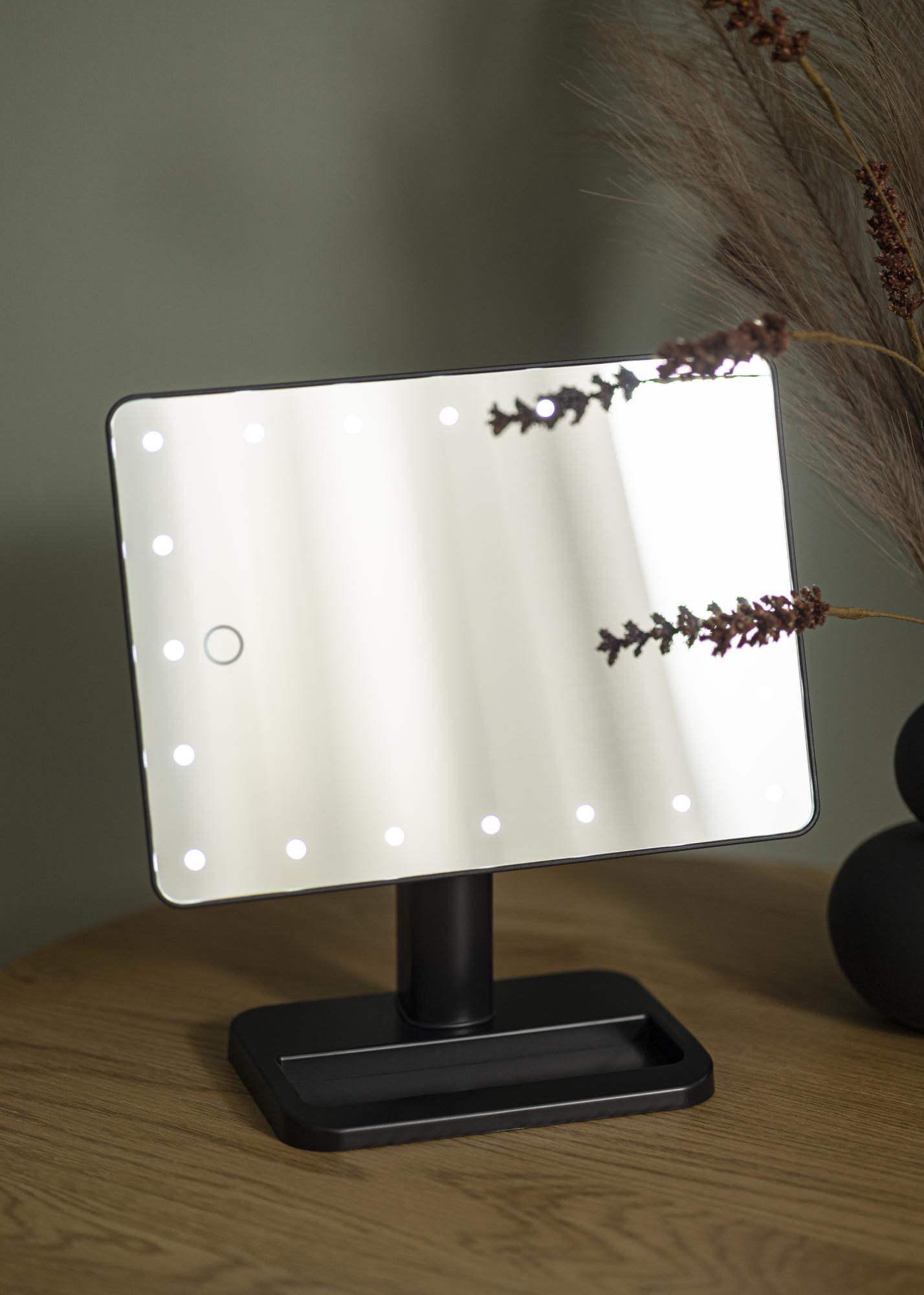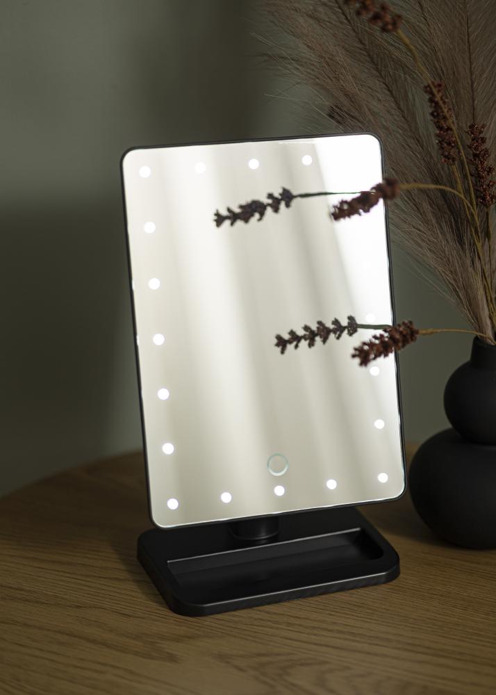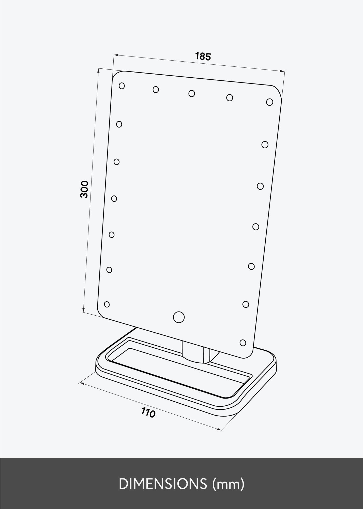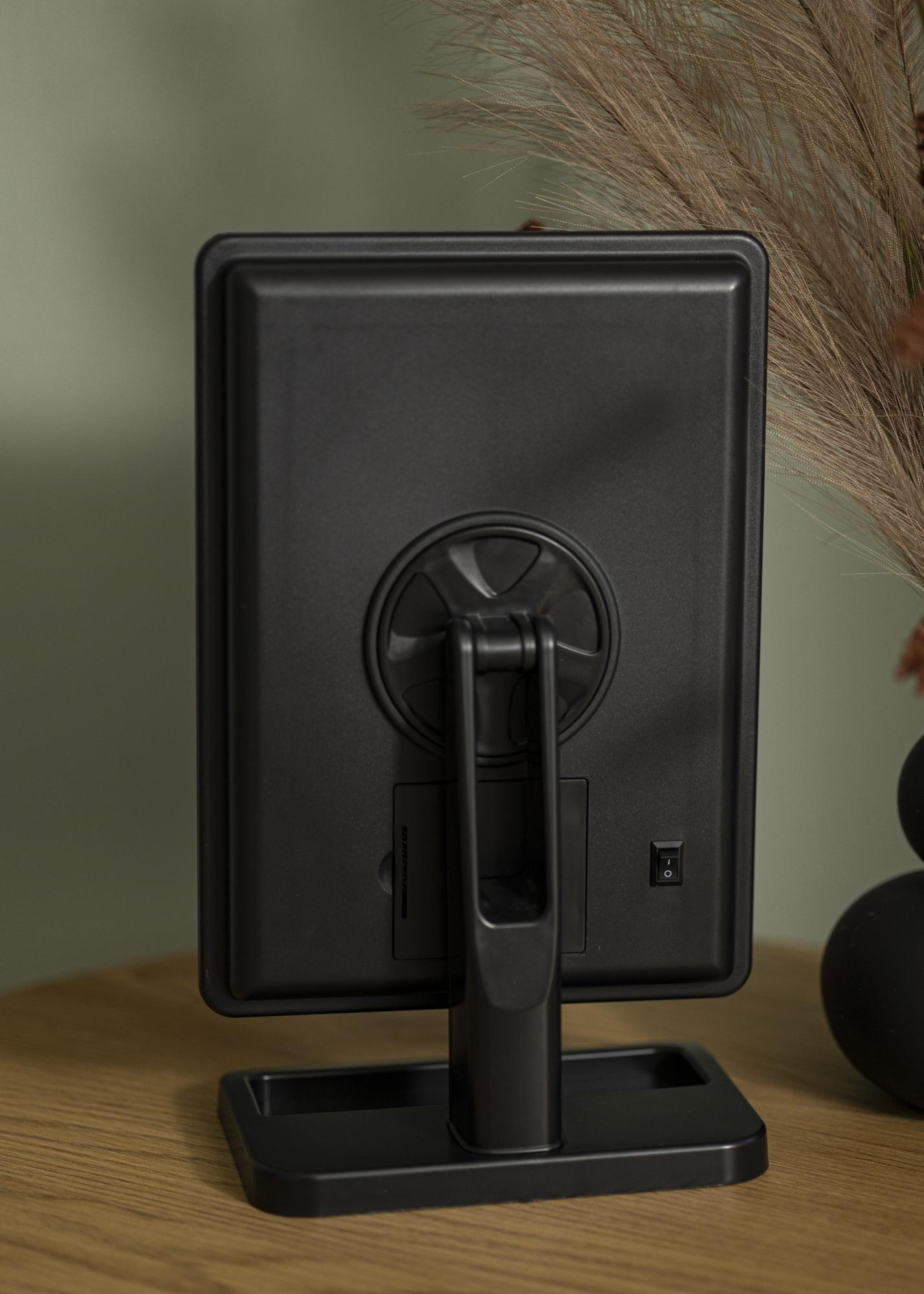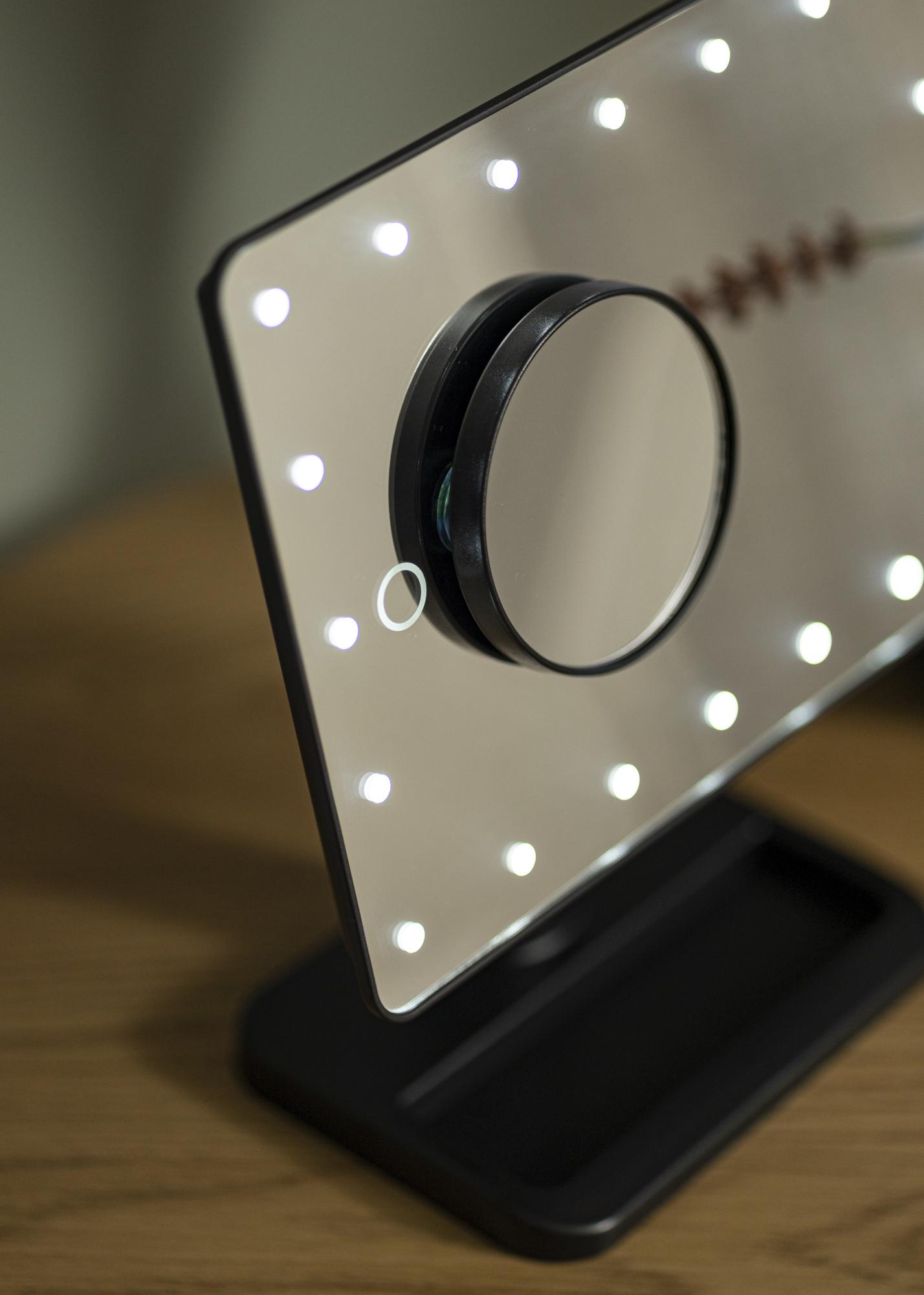 Kompaktni dizajn, elegantan izgled i ravnomjerno osvjetljenje – Foot Crni vam nudi sve što želite u ogledalu za šminkanje! Površina ogledala od 16,5x25 cm okružena je LED osvjetljenjem, što je izvor svjetla koji je energetski učinkovit i ima dugu izdržljivost. Ogledalo se uključuje putem tipke na stražnjoj strani. Možete podesiti svjetlinu hladnog bijelog svjetla držeći touch-tipku na prednjoj strani ogledala nekoliko sekundi.