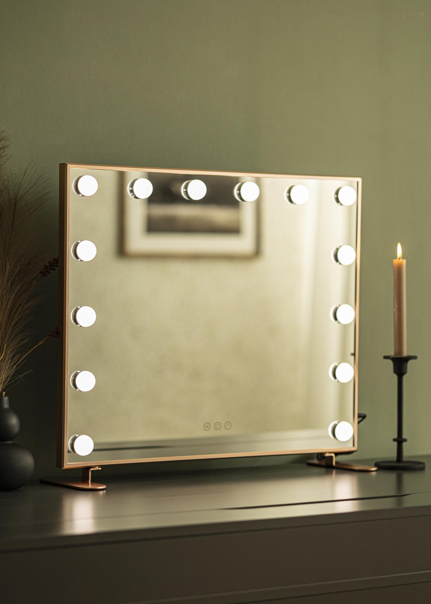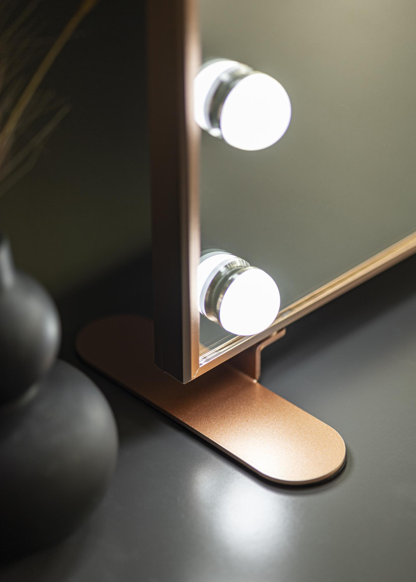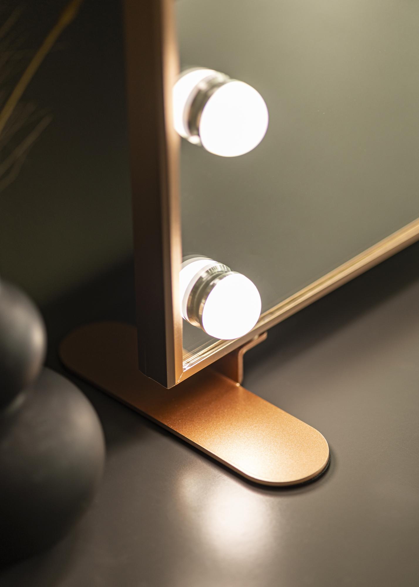 Ovo luksuzno ogledalo za šminkanje ima tanki metalni okvir u roza zlatu i LED rasvjetu u obliku 14 velikih lampi. To daje ogledalu glamurozan izgled inspiriran Hollywoodom koji postavlja stil u svakoj sobi. Ima elegantno postolje, također u nijansi roza zlata, koje se može ukloniti ako želite objesiti ogledalo na zid.
