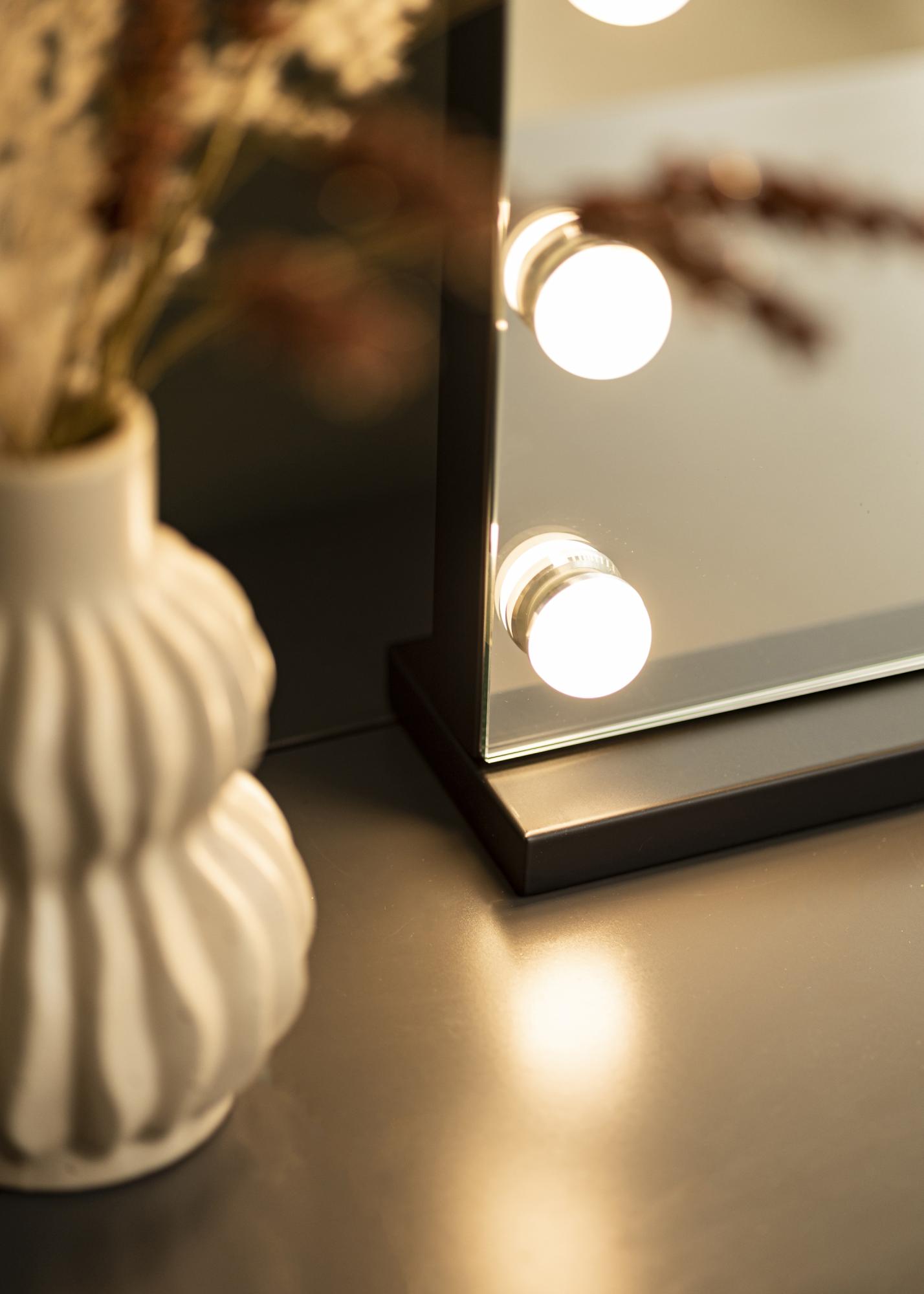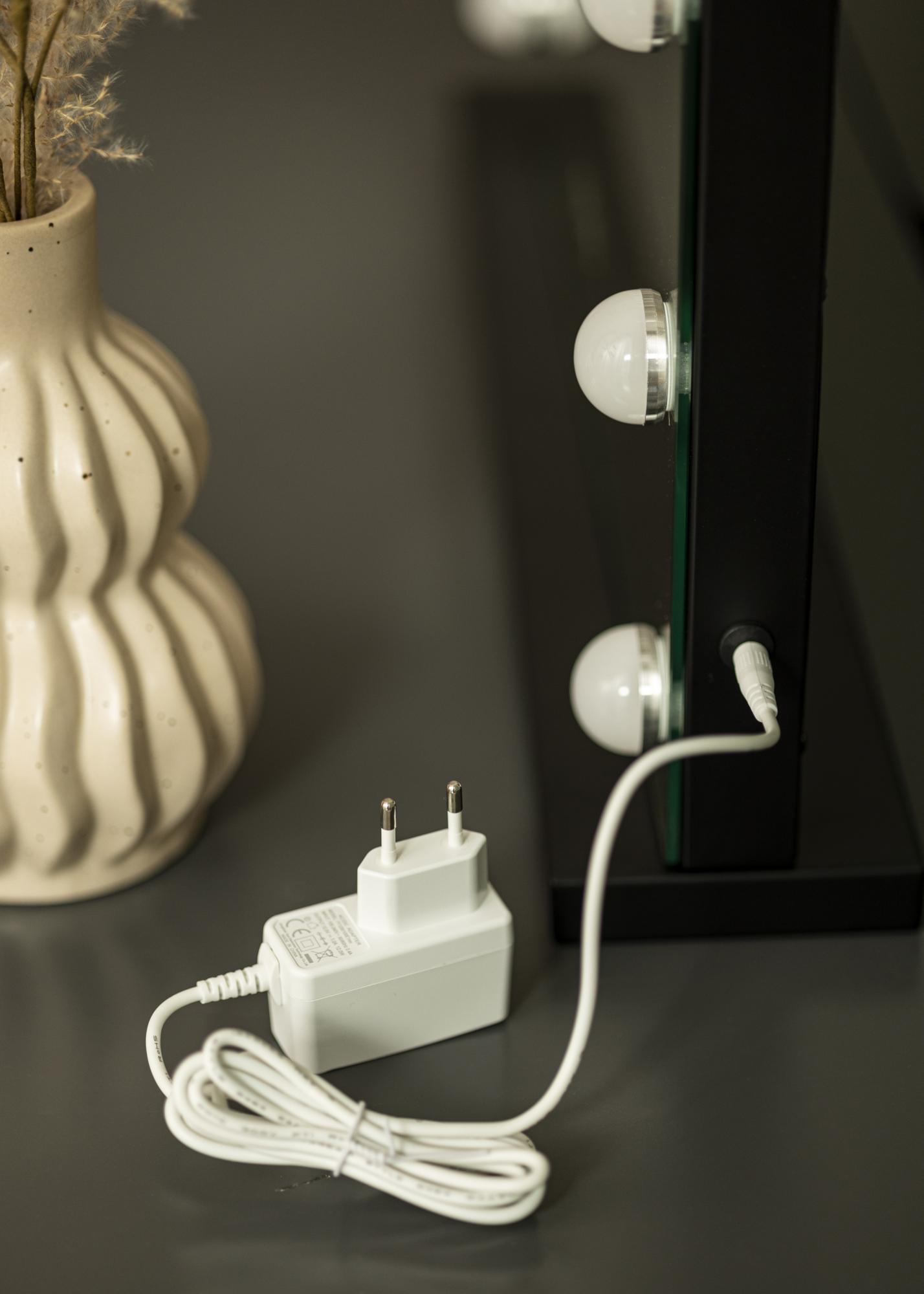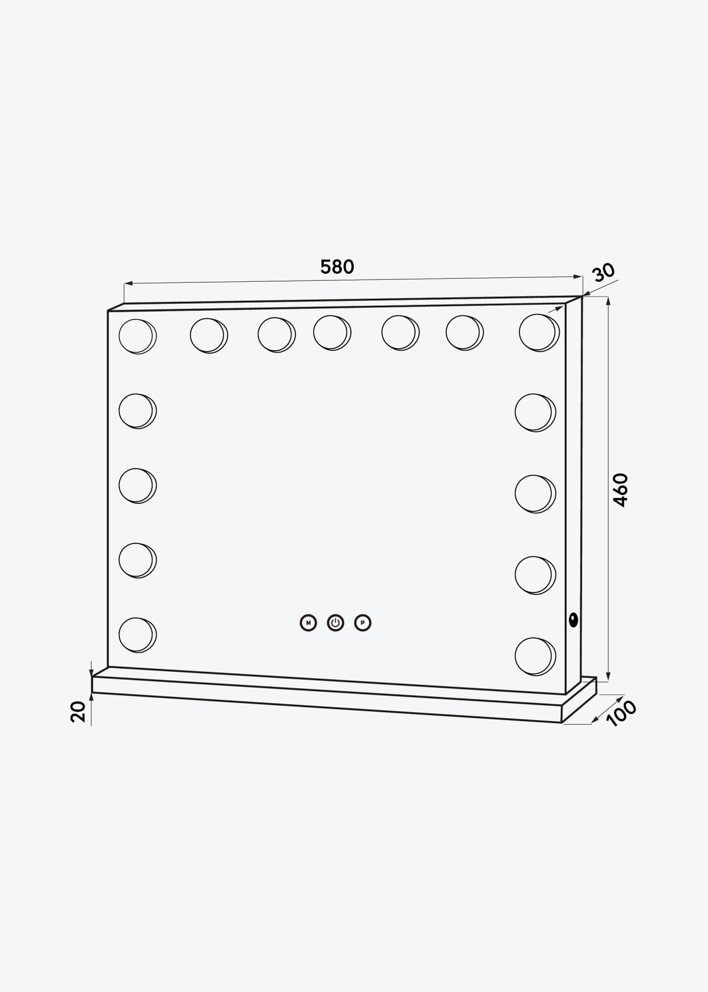 Osvježite kutak za šminkanje, dnevni boravak ili hodnik elegantnim ogledalom za šminkanje s ugrađenom rasvjetom! Ogledalo nema tradicionalni okvir, već je površina ogledala uokvirena sa 15 LED lampi smještenih uz rubove ogledala. Rasvjeta je podesiva i možete namjestiti i svjetlinu i temperaturu boje. Postavke svjetla podešavaju se putem tipki na dodir na donjem rubu ogledala, gdje gumb "P" mijenja svjetlinu, a gumb "M" podešava temperaturu boje. Tu se nalazi i tipka na dodir za uključivanje ili isključivanje rasvjete. Električno napajanje vrši se putem utičnice.