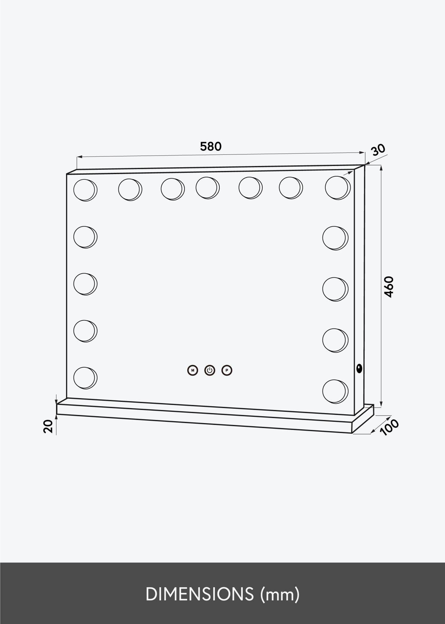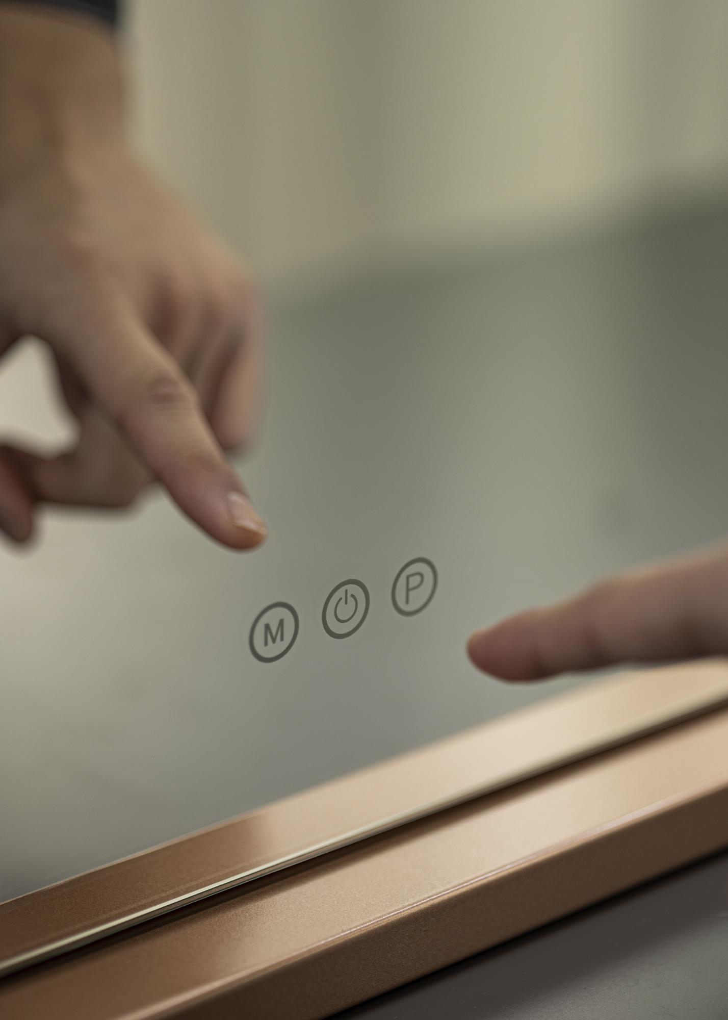 PovrÅ¡ina zrcala mjeri 58x46 cm i na donjem rubu povrÅ¡ine nalaze se tri dodirne tipke. Jedna za paljenje i gaÅ¡enje rasvjete i dvije za promjenu postavki osvjetljenja. Držite "M" tipku kako biste podesili temperaturu boje svjetla, a uz pomoÄ "P" tipke možete lako priguÅ¡iti rasvjetu do željene svjetline. ElektriÄno spajanje se vrÅ¡i putem utiÄnice.