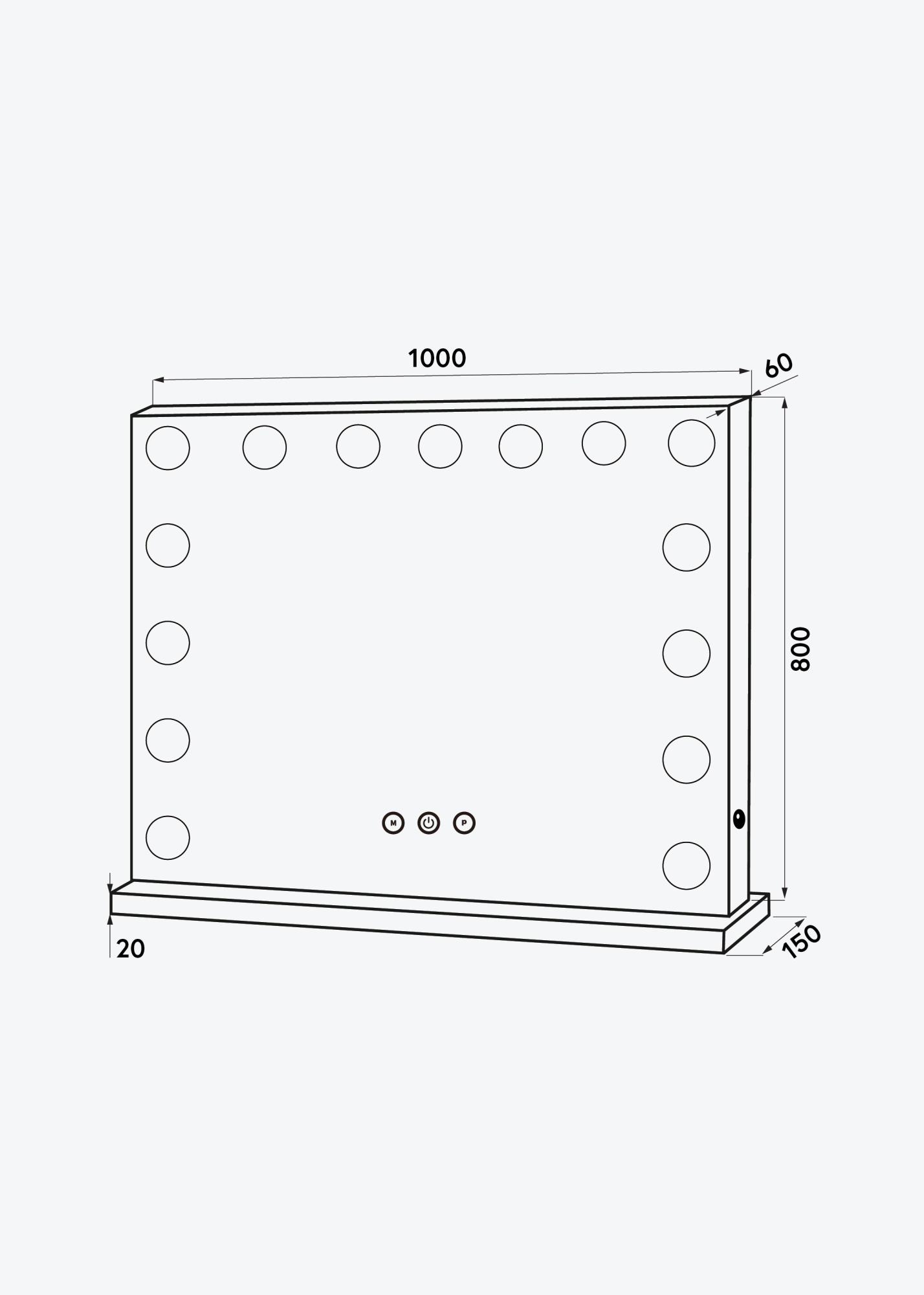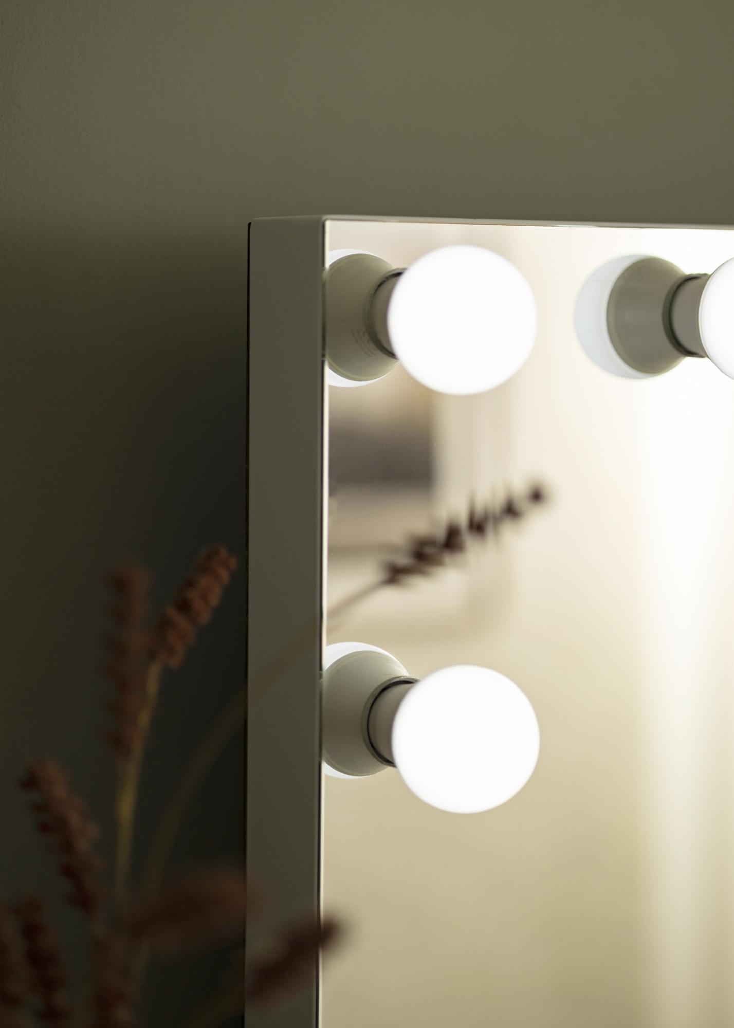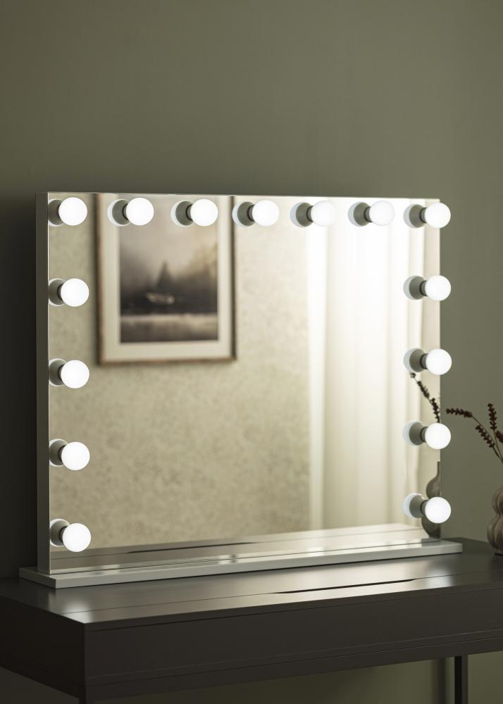 Ovo ogledalo nadahnuto Hollywoodom dodat će glamur vašem kutku za šminkanje. Dizajn daje luksuzni izgled zahvaljujući velikoj površini ogledala od 100x80 cm i ugrađenom osvjetljenju koje se sastoji od 15 žarulja koje okružuju rubove ogledala. Žarulje imaju E27 grlo i mogu se zamijeniti prema potrebi. Ogledalo se može postaviti uspravno, što ga čini izvrsnim za komodu u spavaćoj sobi, komodu u dnevnoj sobi ili bilo kojoj drugoj prostoriji gdje želite stilizirano ogledalo. Ako želite postaviti ogledalo na zid, postolje se može ukloniti.