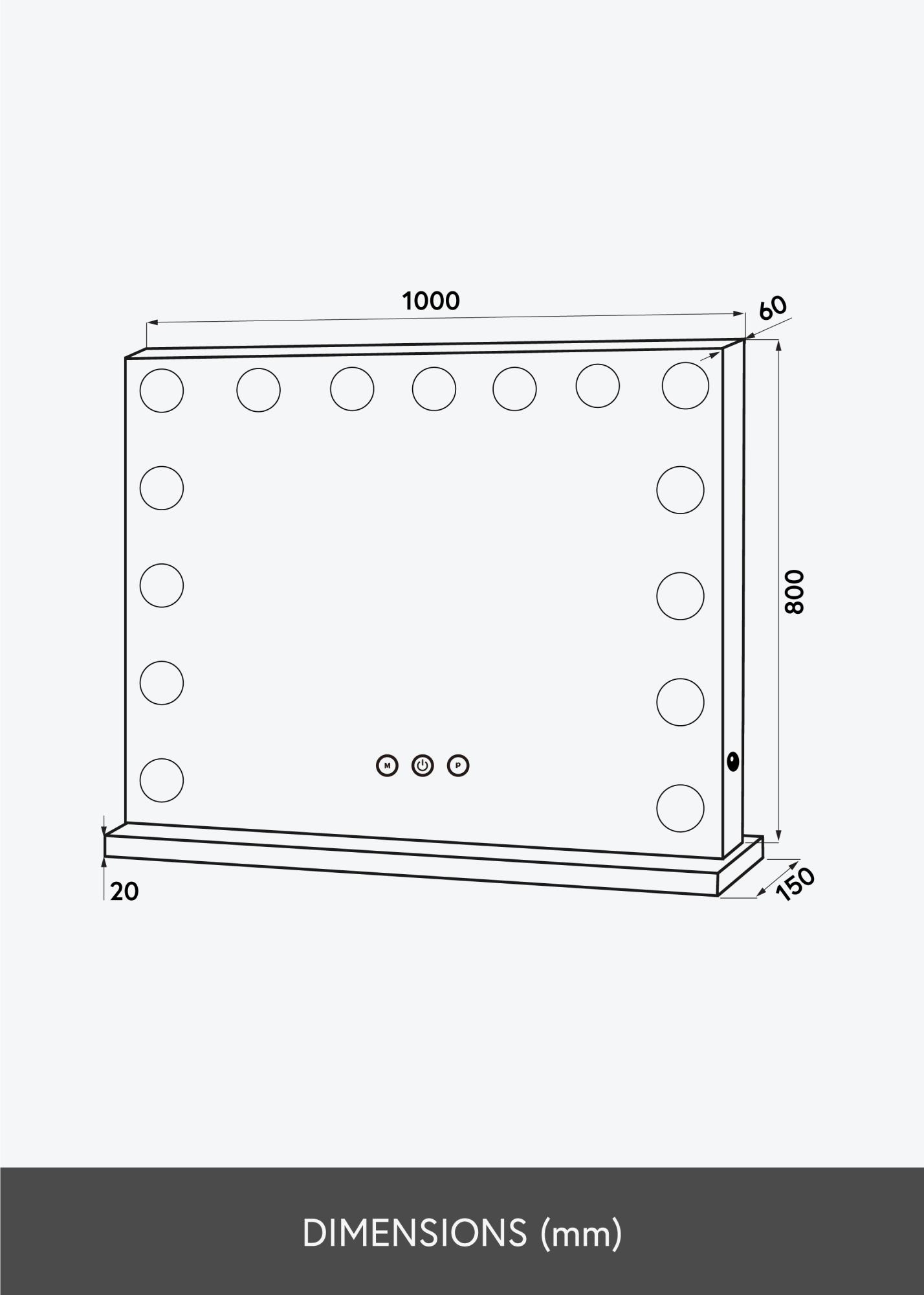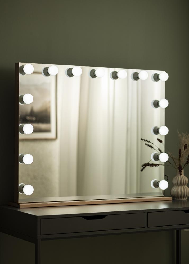 Ovo ogledalo za šminkanje ima ugrađenu rasvjetu u obliku 15 žarulja s E27 grlom, koje emitiraju hladno bijelo svjetlo. Žarulje su zamjenjive. Rasvjeta se može prigušiti pomoću okretne tipke na jednoj kraćoj strani ogledala. Električna veza je putem utičnice.