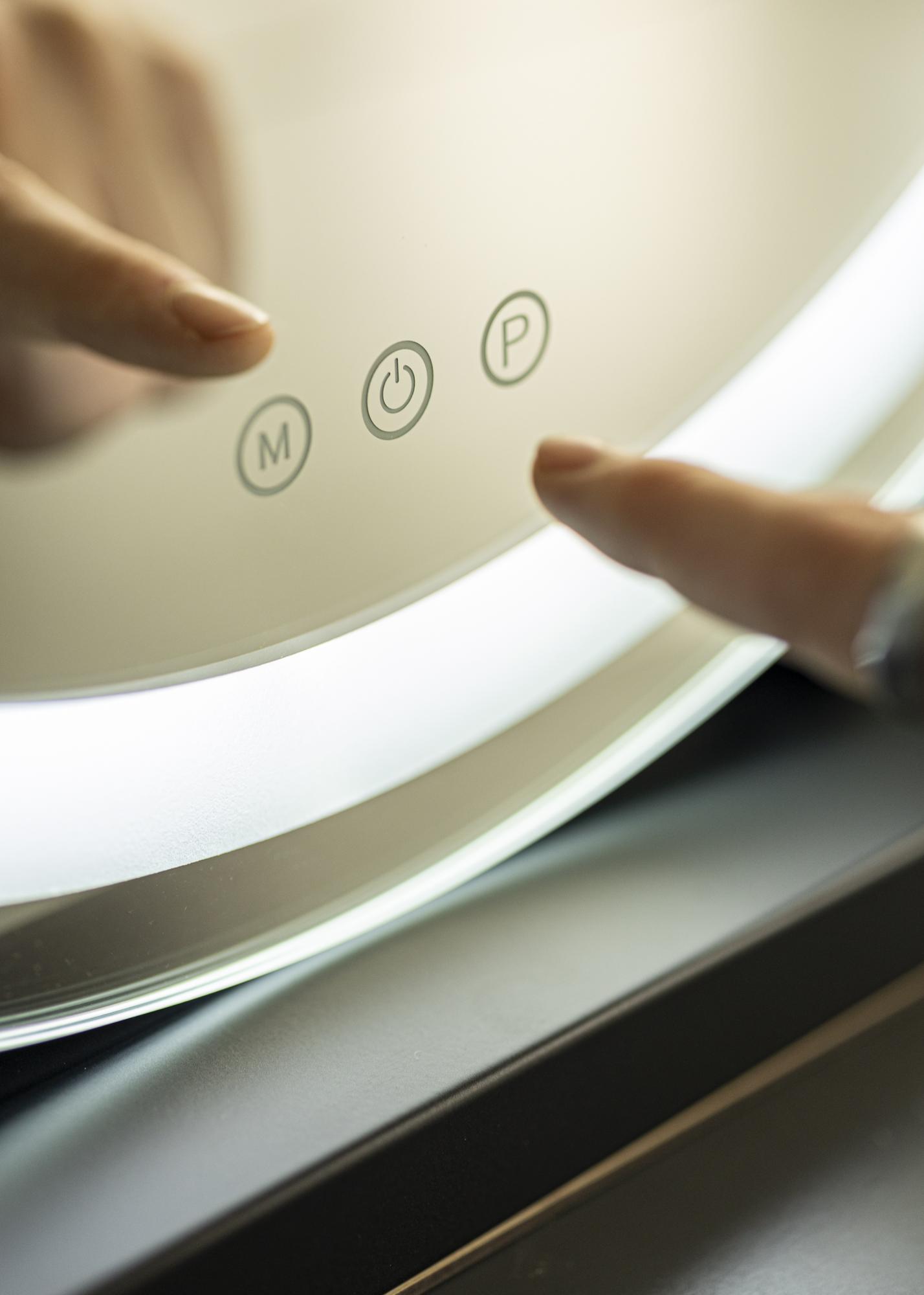 Ovo je kozmetiÄko ogledalo u uspravnom modelu, s postoljem u neutralnoj crnoj boji koje se lako može uklopiti s ostatkom unutarnjeg ureÄenja. PovrÅ¡ina ogledala ima klasiÄan okrugli oblik s promjerom od 50 cm, koja je lijepo uokvirena integriranom LED trakom. Postoje tri touch-gumba na donjem rubu povrÅ¡ine ogledala – jedan ukljuÄuje/iskljuÄuje svjetlost, tipka "M" koja podeÅ¡ava temperaturu boje svjetla i tipka "P" koja vam omoguÄuje podeÅ¡avanje svjetline svjetlosti prema želji. PrikljuÄivanje na struju vrÅ¡i se putem utiÄnice.