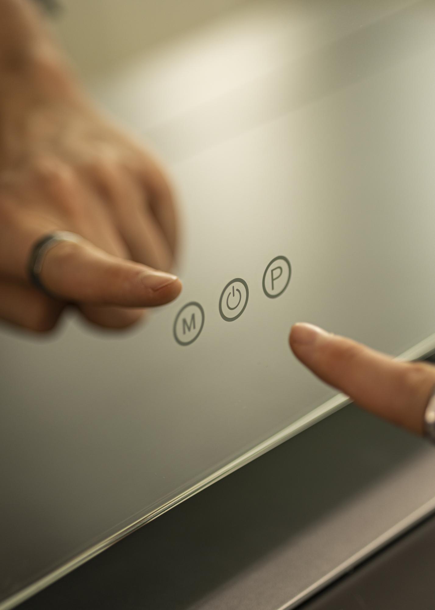 S elegantnim zrcalom za šminkanje možete stvoriti luksuzniju atmosferu u svakoj sobi. Ovo zrcalo ima ugrađenu LED rasvjetu koju možete prilagoditi ovisno o tome želite li ugodnu pozadinsku rasvjetu u dnevnom boravku ili jako svjetlo za kutak za šminkanje. Za prilagodbu rasvjete koristite dodirne tipke na donjem rubu zrcala; tipka "M" podešava temperaturu boje svjetla, a tipka "P" mijenja svjetlinu. Također, postoji i tipka za uključivanje/isključivanje za paljenje i gašenje rasvjete zrcala. Električni priključak se vrši putem utičnice.