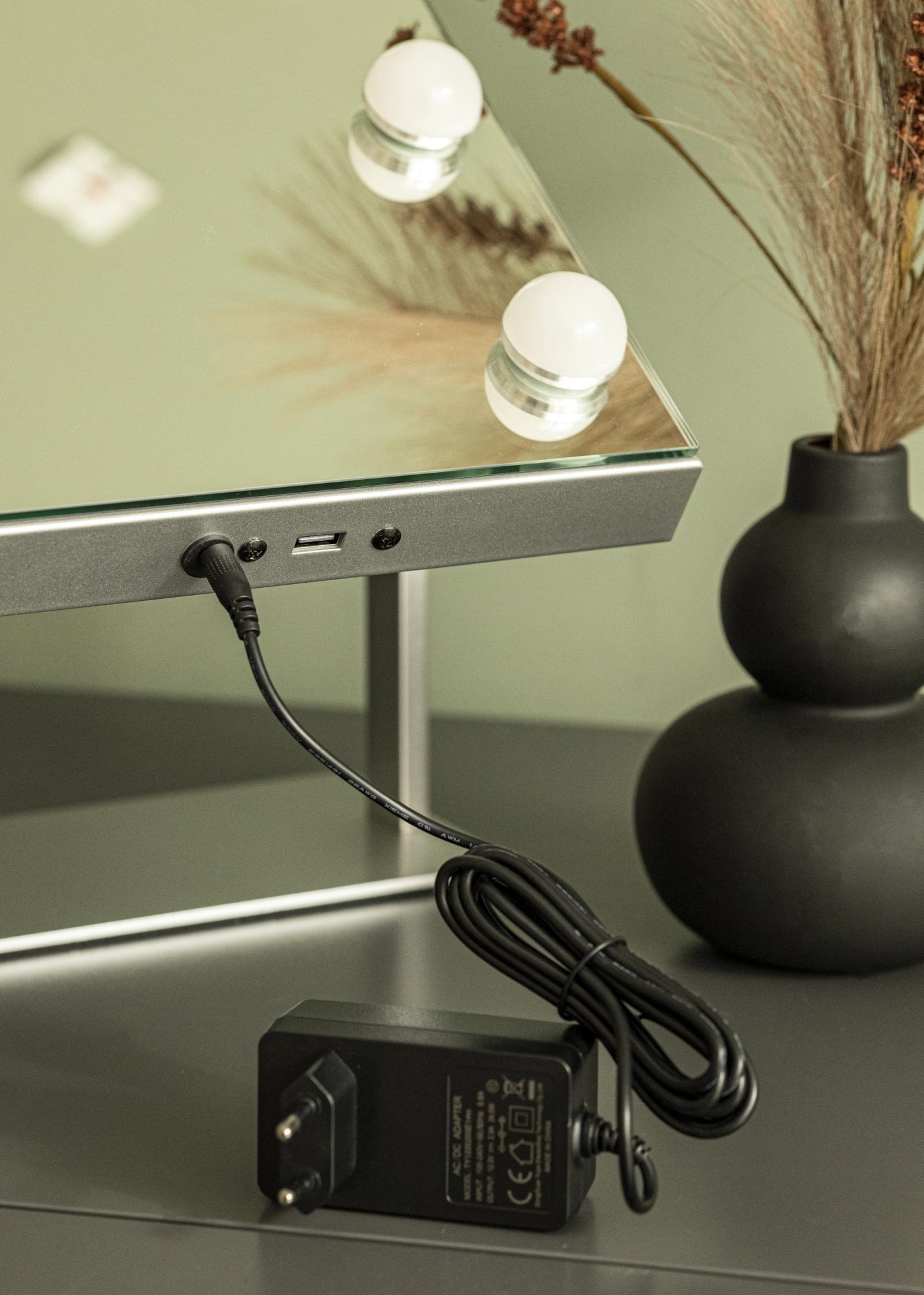 Ovo zrcalo ima srebrno postolje koje pruža elegantan izgled i omogućuje vam naginjanje površine zrcala. Na donjem rubu zrcala nalazi se USB priključak za punjenje vaših pametnih uređaja.