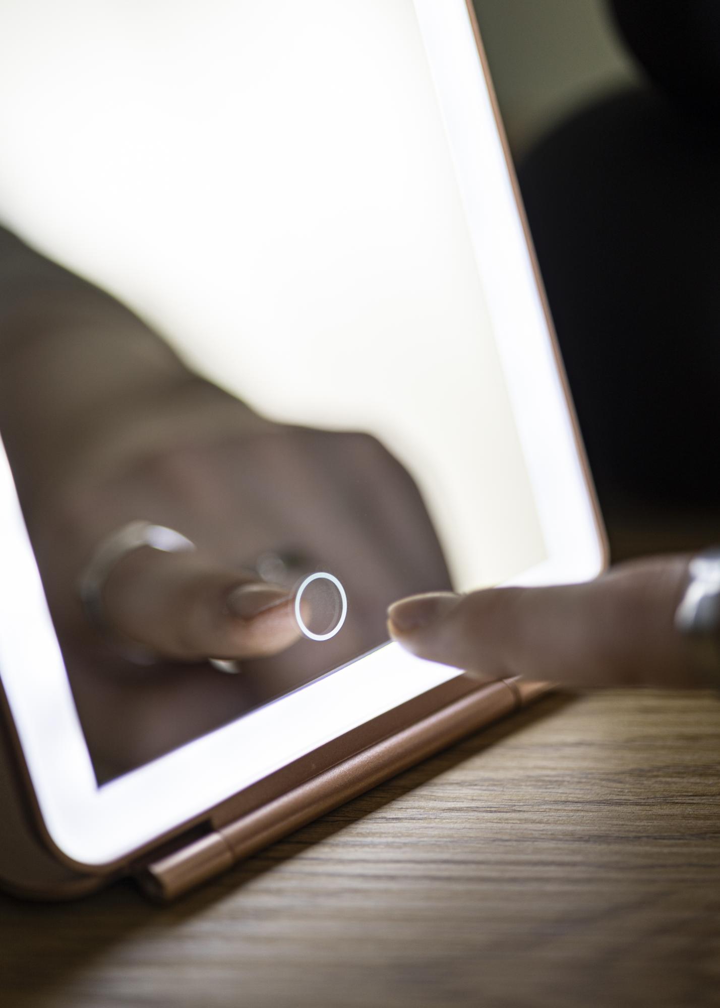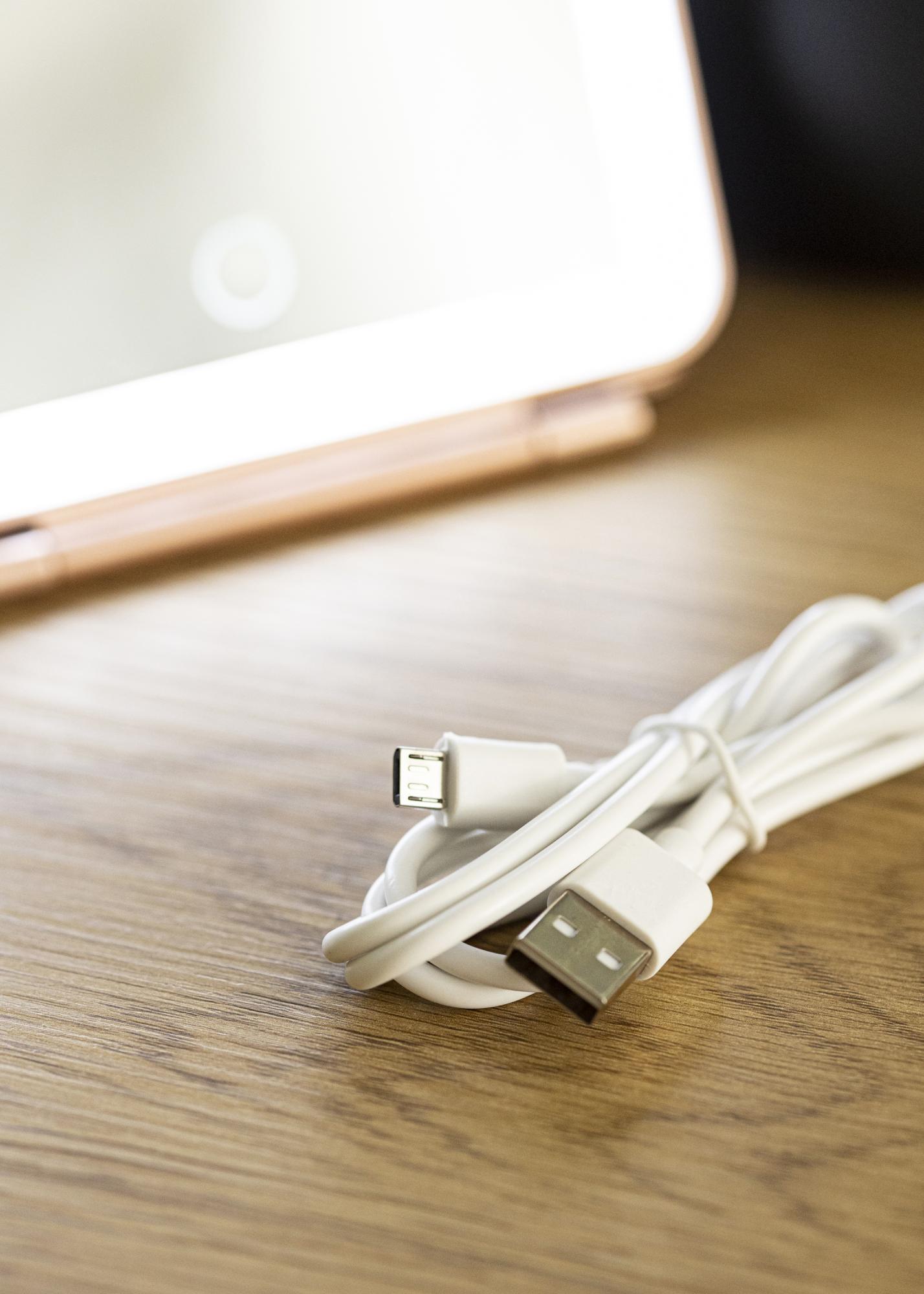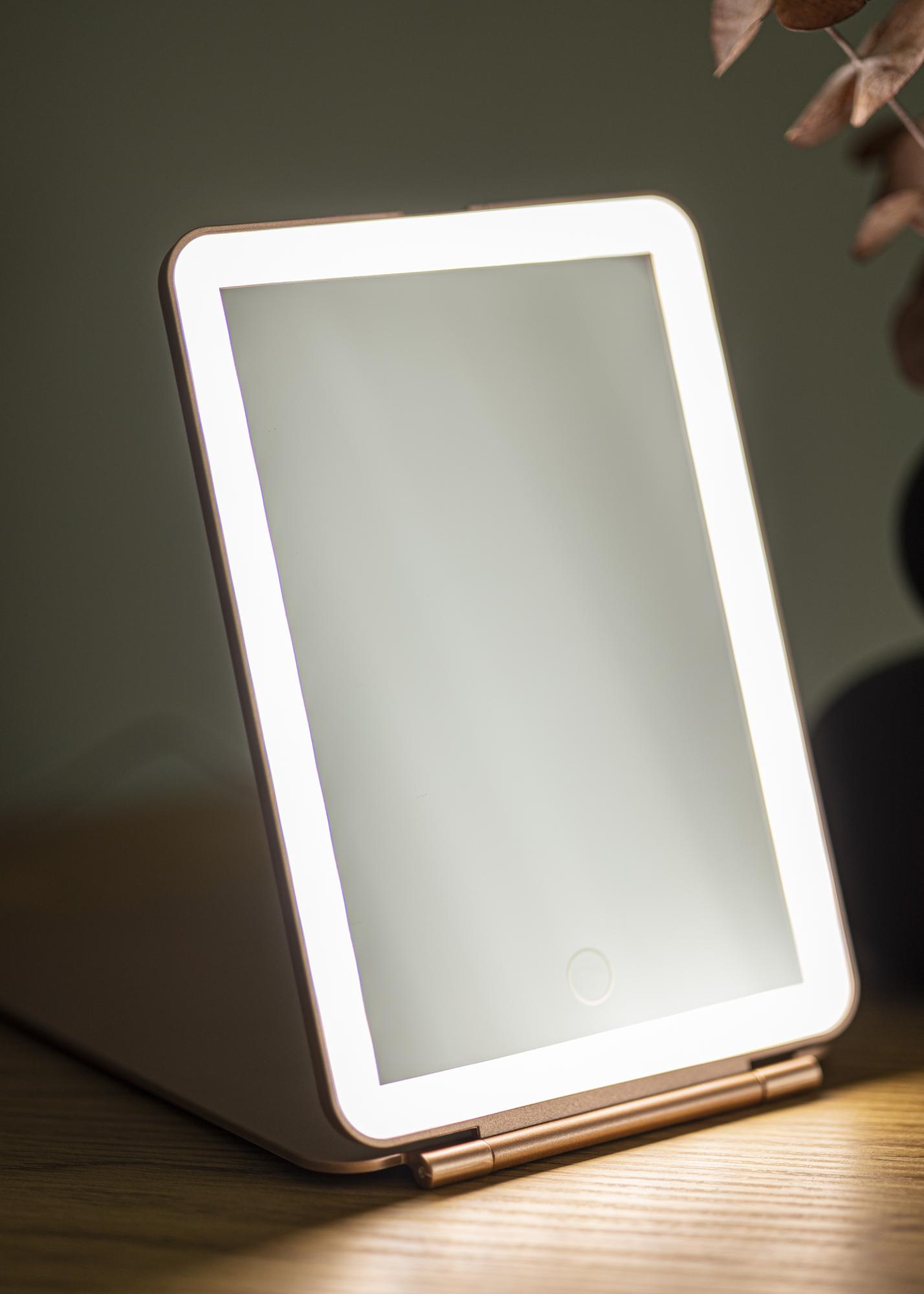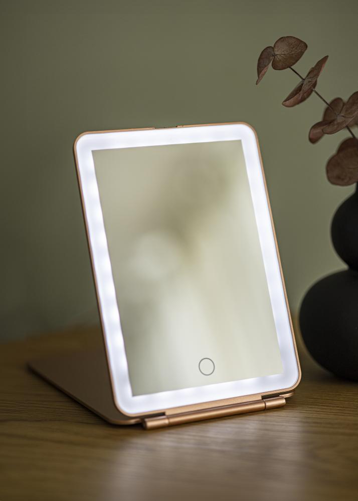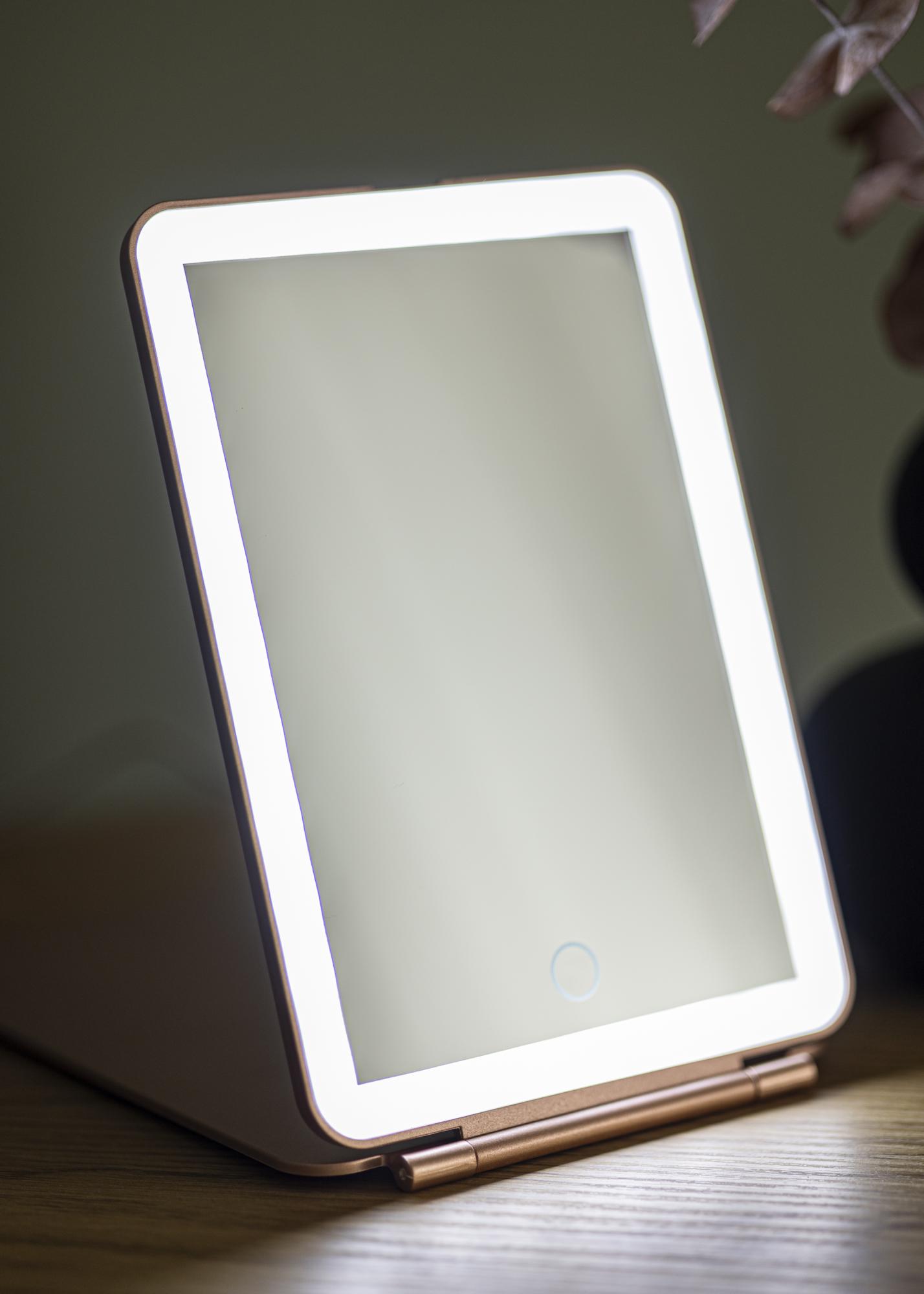 Ovo trendi ogledalo za šminkanje u ružičastom zlatu postat će vaš vjerni pratitelj tijekom svih putovanja. Preklopni dizajn omogućuje vam postavljanje ogledala pod kutom koji preferirate - a također ga možete potpuno sklopiti kada se ne koristi. Ogledalo također ima ugrađeno LED osvjetljenje, što je energetski učinkovita svjetlosna izvor koja se ne mora mijenjati s vremenom. Ako se baterija ovog ogledala počne prazniti, umjesto toga se puni putem USB priključka. Uključujete ogledalo pomoću dodirnog gumba na prednjem dijelu ogledala. Tu je također dodirni gumb za podešavanje osvjetljenja, koji možete držati za prigušivanje svjetla i podešavanje temperature boje.