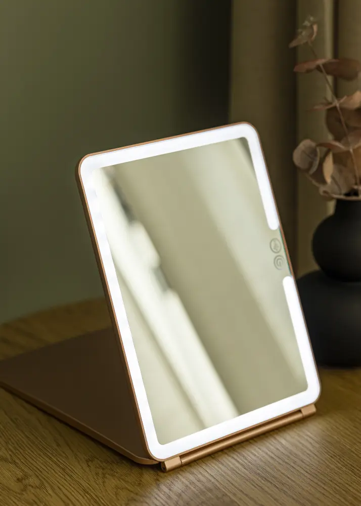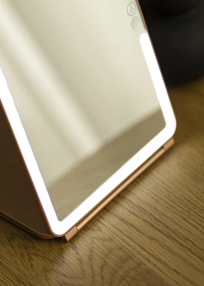 Ovo je ogledalo za Å¡minkanje koje je savrÅ¡eno za koriÅ¡tenje kad ste u pokretu, zahvaljujuÄi njegovoj kompaktnoj veliÄini, sklopivom dizajnu i ugraÄenom LED rasvjetom. TakoÄer ima trendovsku nijansu u ružiÄasto-zlatnoj boji. Ogledalo za Å¡minkanje lako stane u vaÅ¡u torbu, kako za svakodnevnu uporabu tako i kad putujete. Sklopivi dizajn Å¡titi povrÅ¡inu ogledala od ogrebotina i prljavÅ¡tine te vam omoguÄuje da podesite ogledalo u željeni položaj. Ogledalo je opremljeno obiÄnim staklom za ogledalo i dvije manje povrÅ¡ine za ogledanje; jedno s 5x poveÄalom i jedno s 3x poveÄalom.