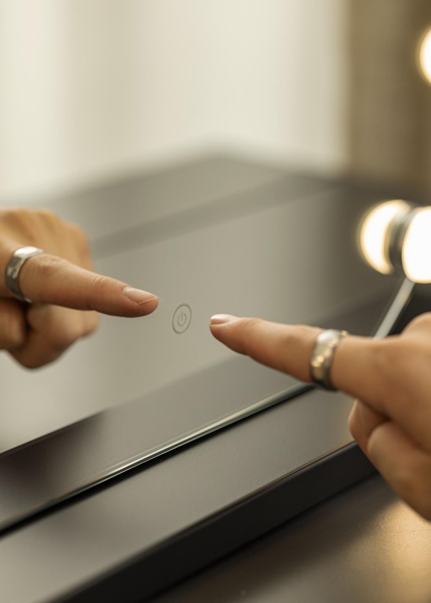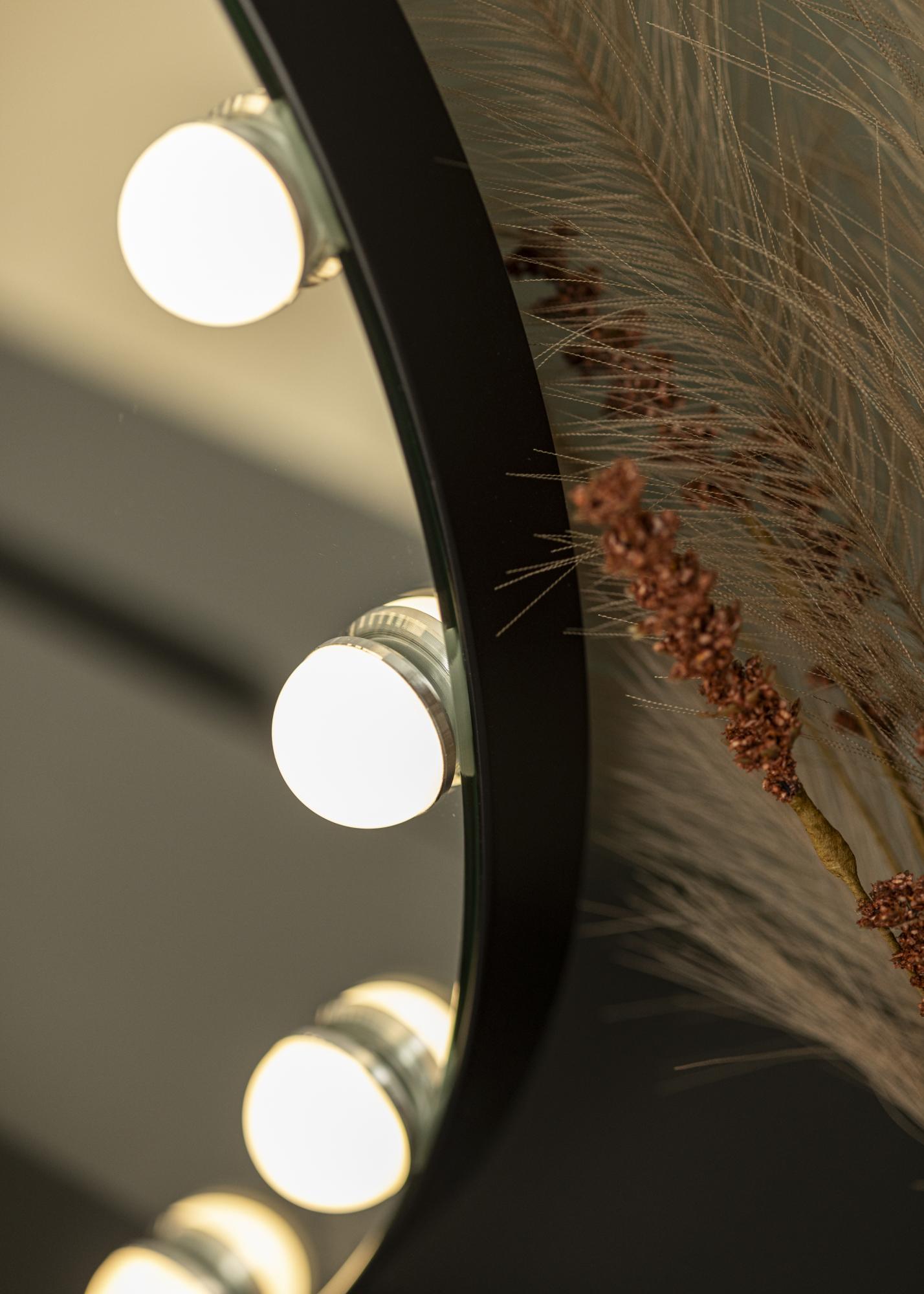 Doživite ultimativni osjećaj luksuza i holivudskog glamura s našim kozmetičkim ogledalom s osvjetljenjem u elegantnoj crnoj nijansi. Ovo kozmetičko ogledalo opremljeno je s 12 dekorativnih LED žarulja koje šire ravnomjerno i toplo bijelo svjetlo na 3000K, što je optimalno za nanošenje šminke. Osvjetljenje se aktivira dodirom gumba i lako se podešava u jačini pritiskom i držanjem gumba. Osim toga, LED žarulje su energetski učinkovite, što osigurava održivo i prirodno svjetlo. Naše kozmetičko ogledalo kombinira praktičnu funkciju s trendi dizajnom, što ga čini savršenim dodatkom u vašem domu, bilo u vašoj sobi za šminkanje ili spavaćoj sobi.