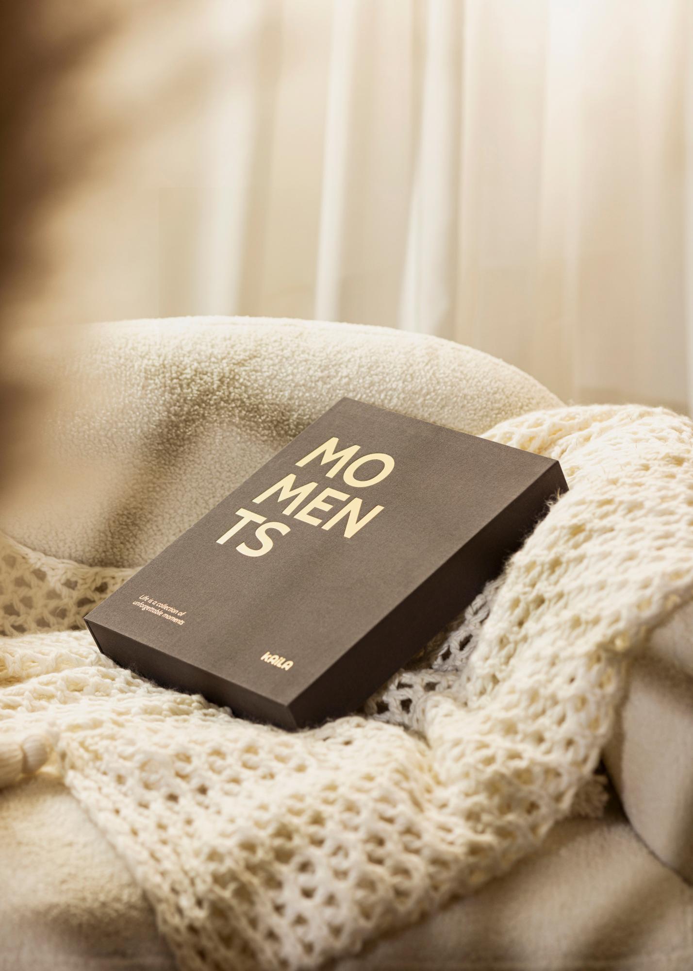 Fotoalbum je dizajniran kao kutija koju možeš otvoriti da bi došao do svojih slika. Omot je ukrašen crnim tekstilom, što daje luksuzan osjećaj. Na prednjoj i bočnoj strani nalazi se tekst „MOMENTS”. U lijevom kutu na gornjoj strani vidi se prekrasan podnaslov „Life is a collection of unforgettable moments”.