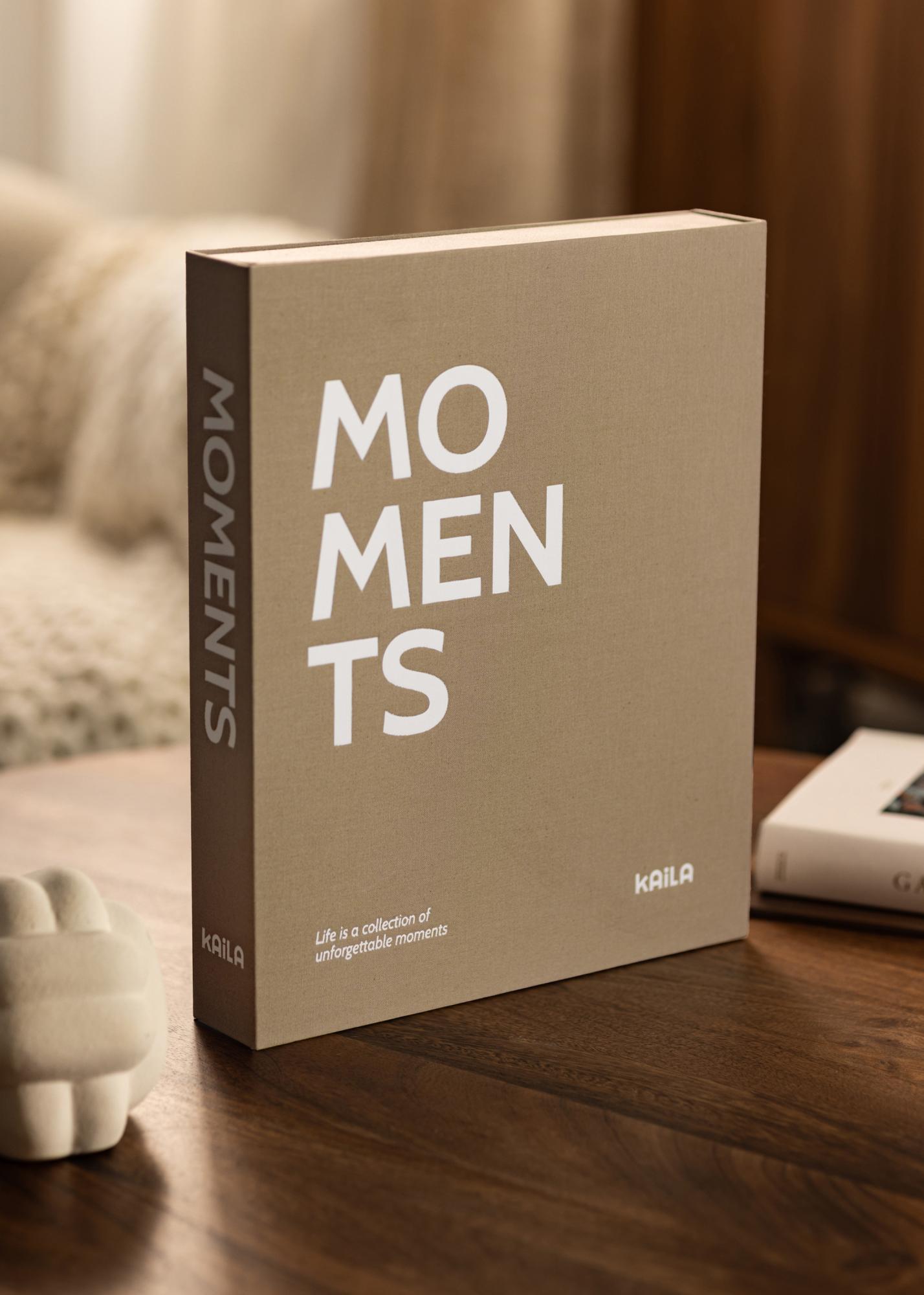 Fotoalbum je dizajniran kao kutija koju možete otvoriti kako biste pristupili svojim slikama. Korice su ukrašene sivim tekstilom, što daje luksuzan osjećaj. Na prednjoj strani i kratkoj strani nalazi se tekst "MOMENTS". U lijevom kutu na vrhu nalazi se prekrasan podnaslov "Life is a collection of unforgettable moments".