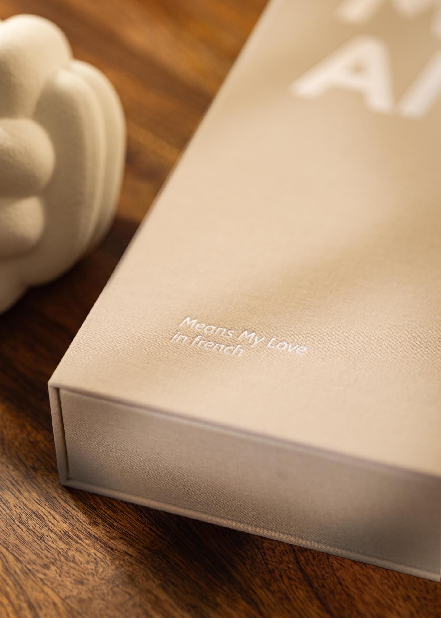 Želite li moderni fotoalbum koji djeluje kao luksuzni element u vašem kućnom uređenju? Onda je ovaj Coffee Table Album nešto za vas! Album je oblikovan kao mala kutija, s ekskluzivnim tekstilnim omotom bež boje. Naslov albuma "MON AMOUR" daje romantičan dodir inače minimalističkom izrazu. Podnaslov u lijevom kutu albuma glasi "Means My Love in French".