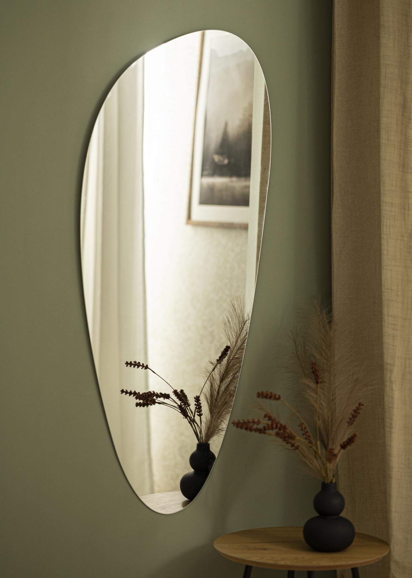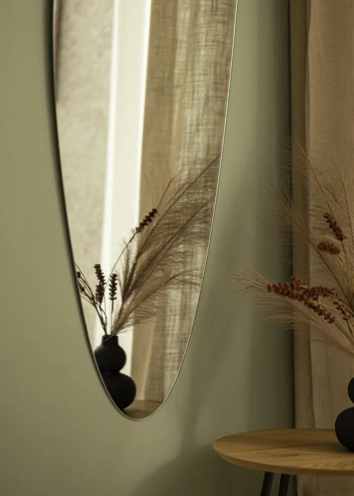 Ovo zidno ogledalo je minimalizam u svom najboljem izdanju – s dizajnom bez okvira i asimetričnim, duguljastim oblikom. Tankoća ogledalnog stakla, od samo 4 mm, dodatno pojačava elegantni minimalistički osjećaj.