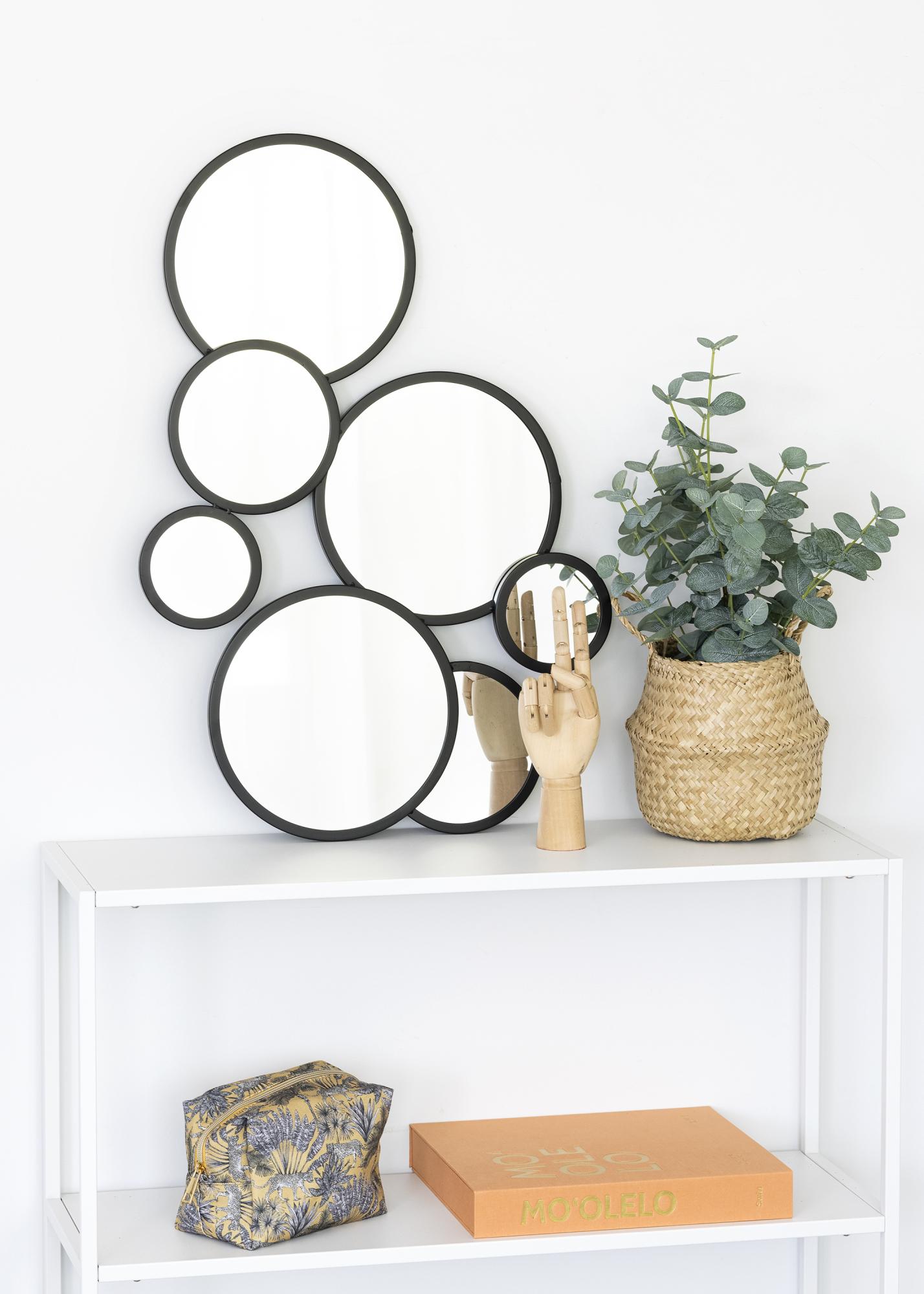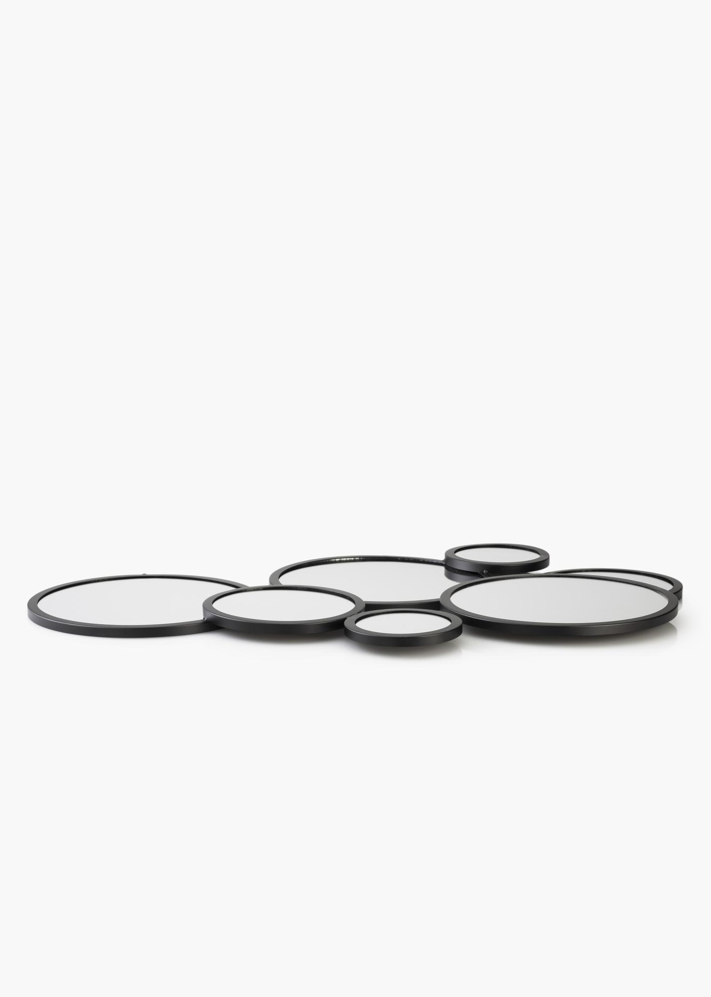 Bubbles je lijepo ogledalo u jedinstvenom dizajnu s mnogo manjih zrcala u obliku kruga složenih u jedno. Ogledalo mjeri 72x43 cm i dolazi u trendovskoj crnoj nijansi. Zidni nosaÄi postoje za vodoravno vjeÅ¡anje, ali ogledalo se takoÄer može lijepo nasloniti na zid okomito. Ogledalo je izraÄeno od metala.