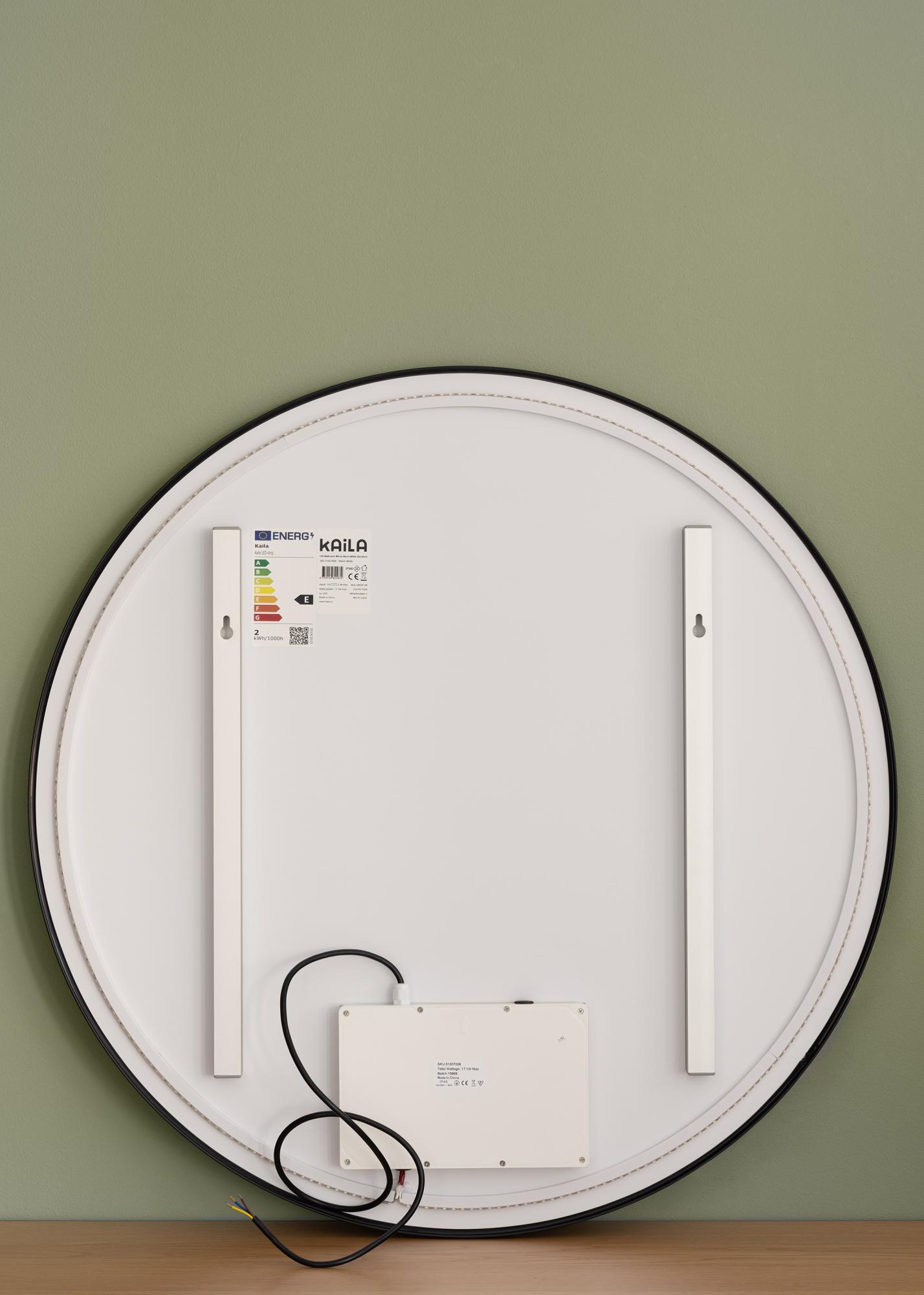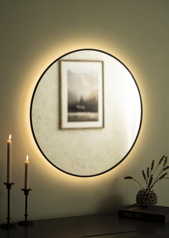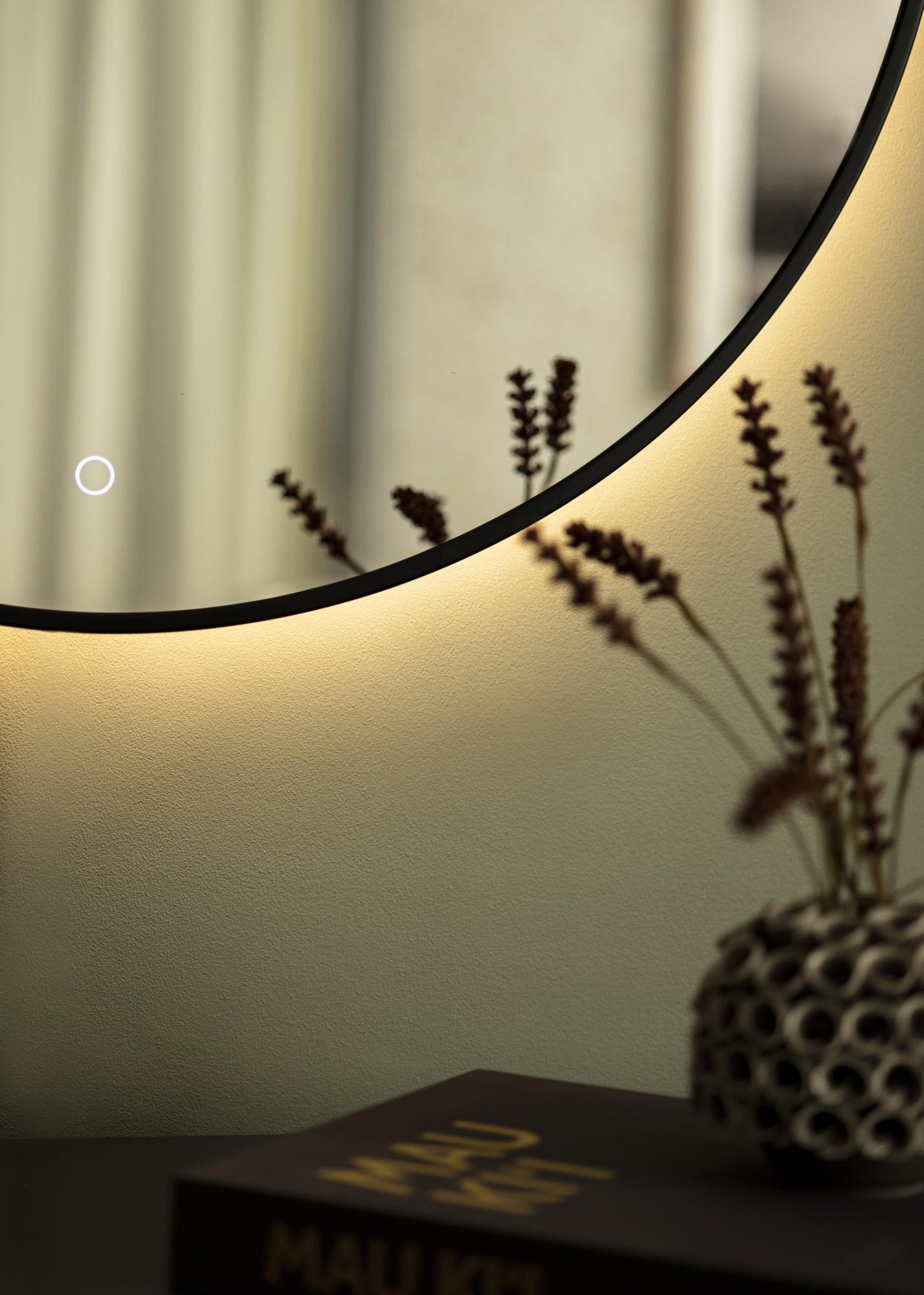 Ovo je elegantno ogledalo s LED rasvjetom, koje je jednako lijepo u hodniku kao i u kupaonici. Ogledalo ima klasiÄan okrugli oblik i metalni okvir u sofisticiranoj crnoj boji. Integrirana LED rasvjeta ogledala u 3000K može se priguÅ¡iti od 10% do 100% svjetline. To vam omoguÄava jednostavno postavljanje rasvjete na željenu svjetlinu i promjenu ako se vaÅ¡e potrebe promijene. Za priguÅ¡ivanje svjetla držite na dodirnoj tipki na donjem dijelu povrÅ¡ine ogledala nekoliko sekundi. LED rasvjeta je postavljena na stražnjoj strani ogledala, Å¡to daje svjetlu mekÅ¡i dojam.