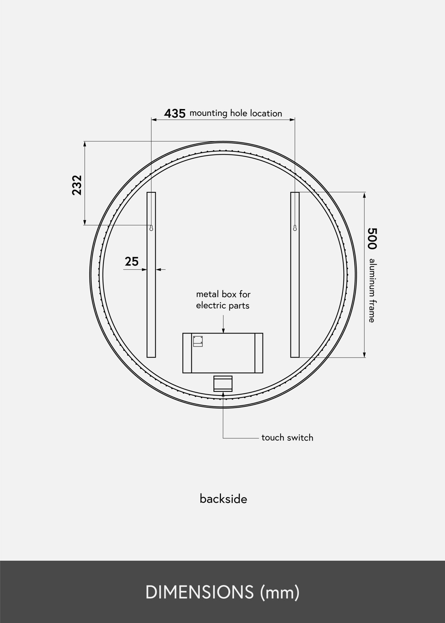 Zidno ogledalo ima povrÅ¡inu ogledala s promjerom od 78,5 cm. Namijenjeno je za fiksnu instalaciju i spaja se na prekidaÄ. Da bi ogledalo ispravno radilo, treba ga spojiti na obiÄan prekidaÄ, a ne na prekidaÄ sa priguÅ¡ivaÄem.