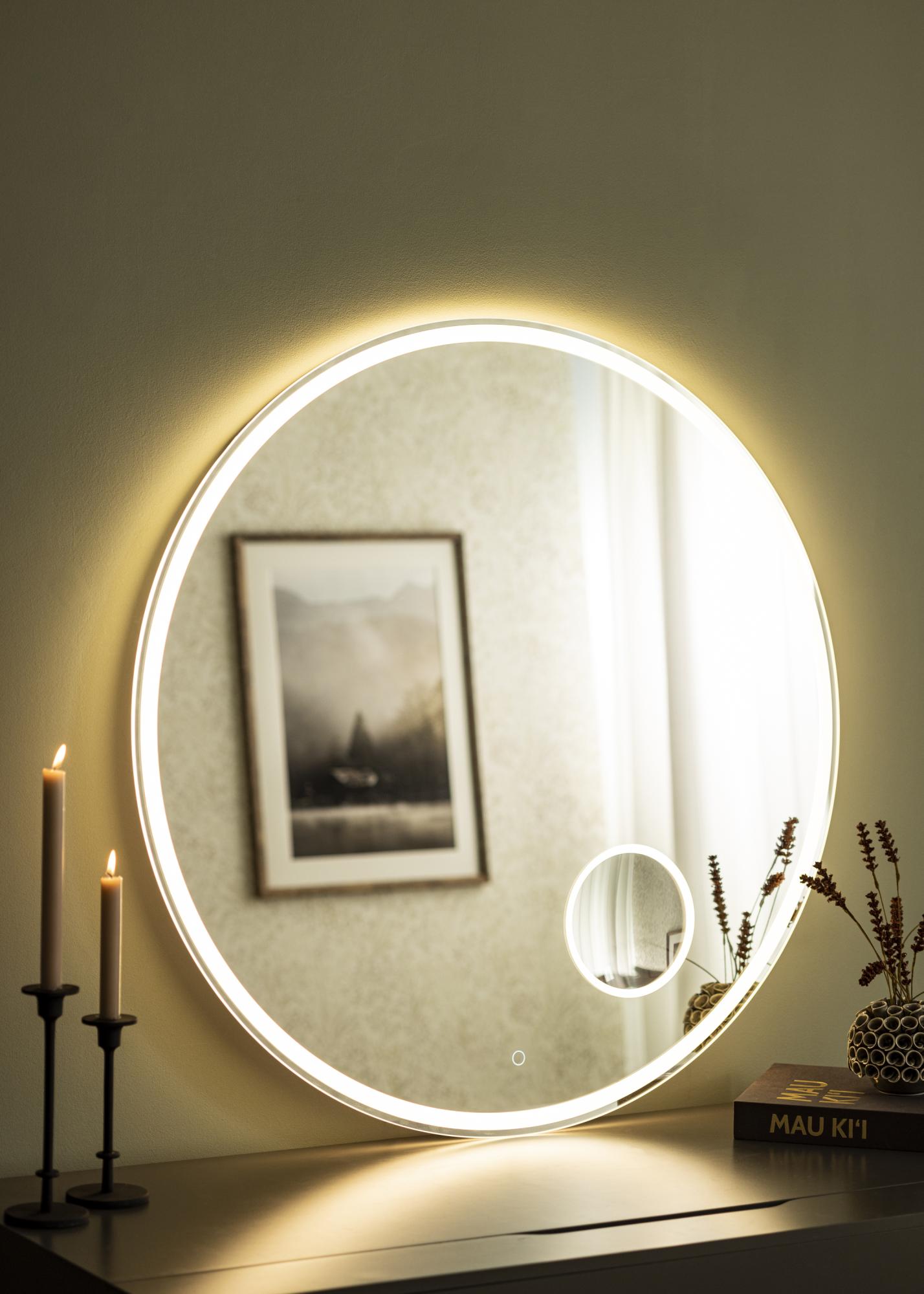 Tražite li elegantno kupaonsko ogledalo s ugraÄenim LED osvjetljenjem i poveÄalom? Onda je ovo ogledalo za vas! Ogledalo ima klasiÄan okrugli oblik i LED traku duž rubova povrÅ¡ine ogledala. Opremljeno je obiÄnim staklom za ogledalo i ima manje ogledalo s 3x poveÄalom, takoÄer s LED osvjetljenjem koje uokviruje povrÅ¡inu ogledala. Svjetlost ima ugodnu nijansu od 3000K koju lako možete podesiti od 10-100% svjetline. Da biste prilagodili svjetlinu, držite touch gumb na donjem rubu ogledala nekoliko sekundi.