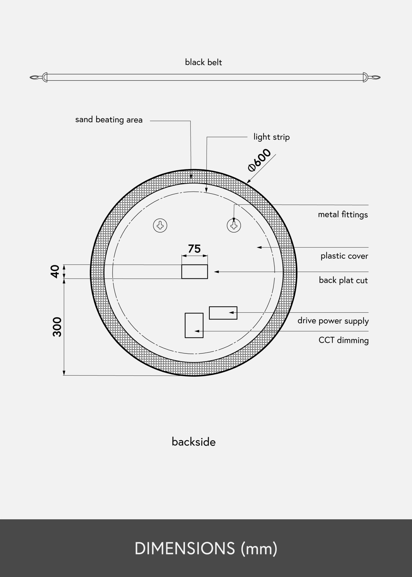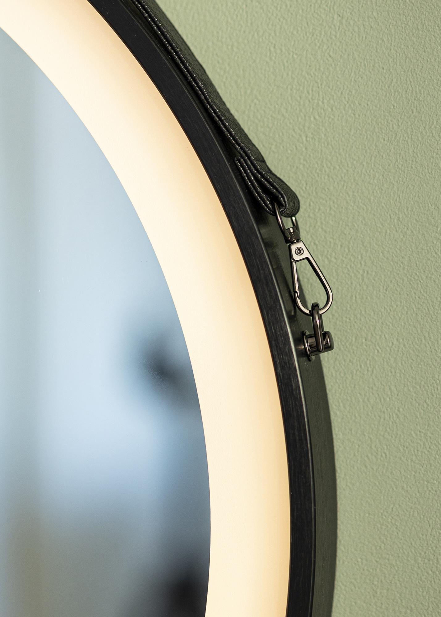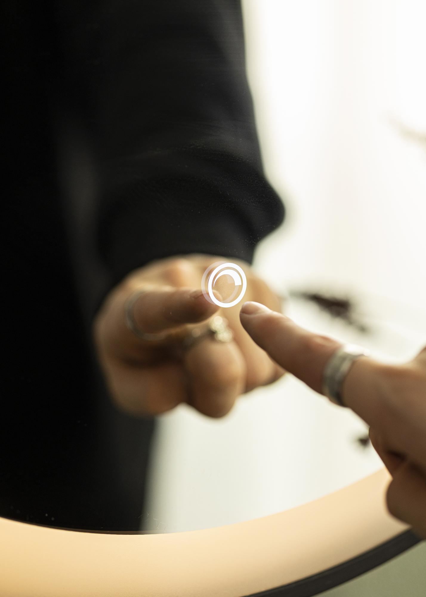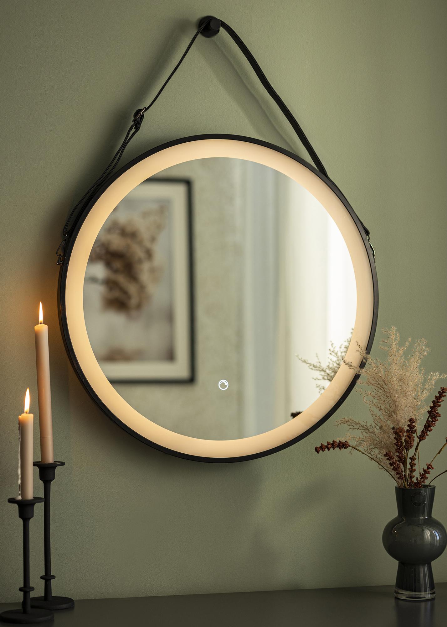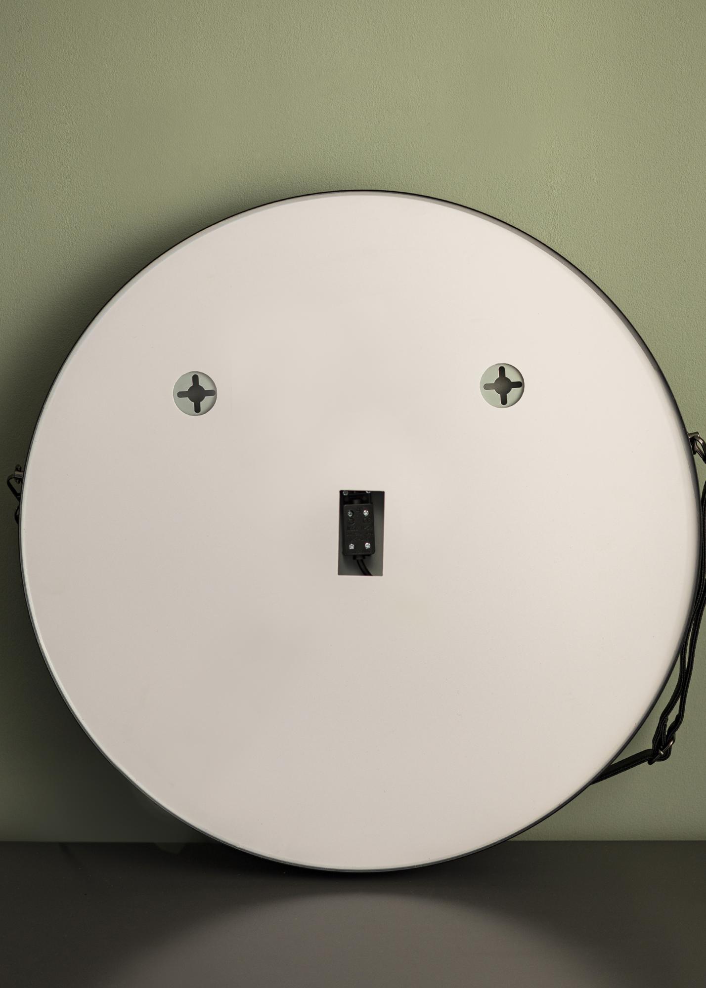 Ovo ogledalo za kupaonicu dolazi u industrijskom dizajnu s crnom nijansom i modernim okruglim oblikom. Ogledalo ima promjer od 60 cm i dolazi s odgovarajućim remenom od tamnosmeđe kože za vješanje. Oko stakla ogledala ide integrirana LED rasvjeta koja pruža toplo bijelo svjetlo od 3000K. Rasvjeta je prigušiva i lako možete podesiti intenzitet držeći tipku za dodir na ekranu nekoliko sekundi. Ogledalo pamti zadnju postavku svjetla sljedeći put kada ga uključite. To vam omogućuje da se uvijek ogledate u dobrom svjetlu! Ogledalo je odobreno za kupaonice, ali je također lijep detalj u uređenju na ostalim zidovima doma! Ogledalo je namijenjeno za fiksnu ugradnju i spaja se na prekidač. Da bi ogledalo ispravno funkcioniralo, treba ga spojiti na obični prekidač, a ne na prekidač s regulatorom svjetla.