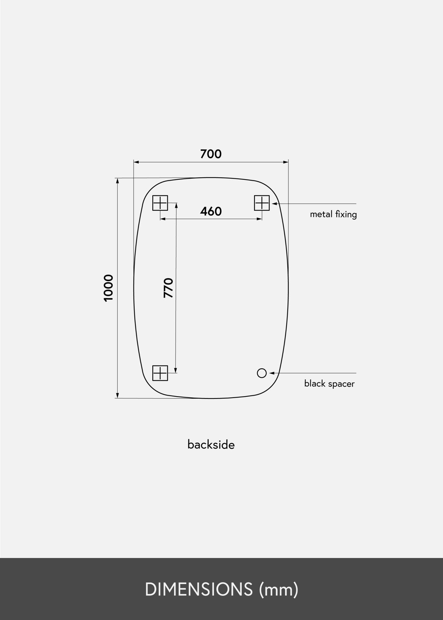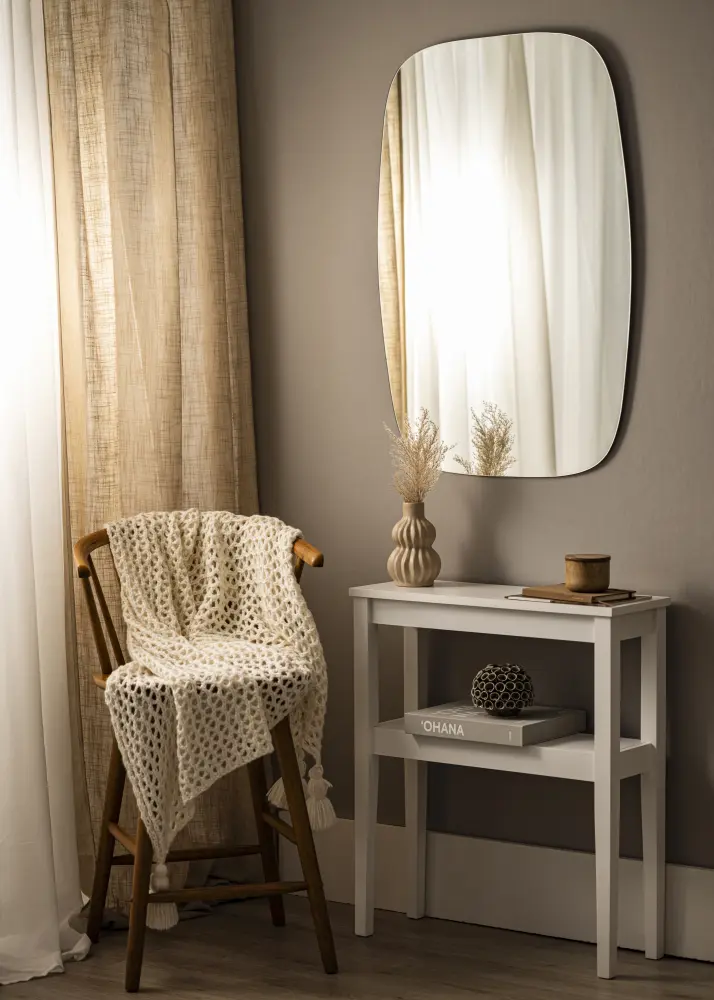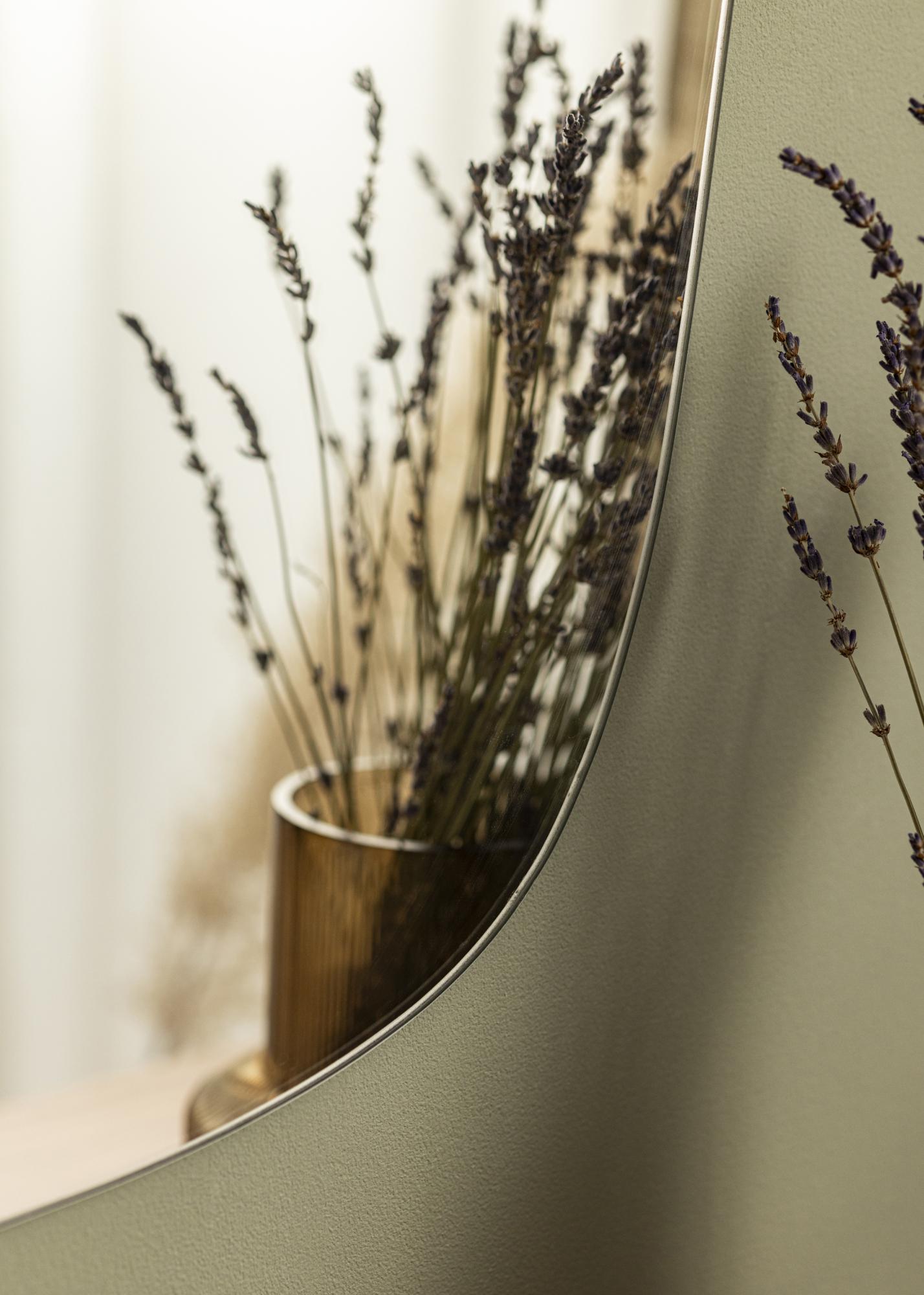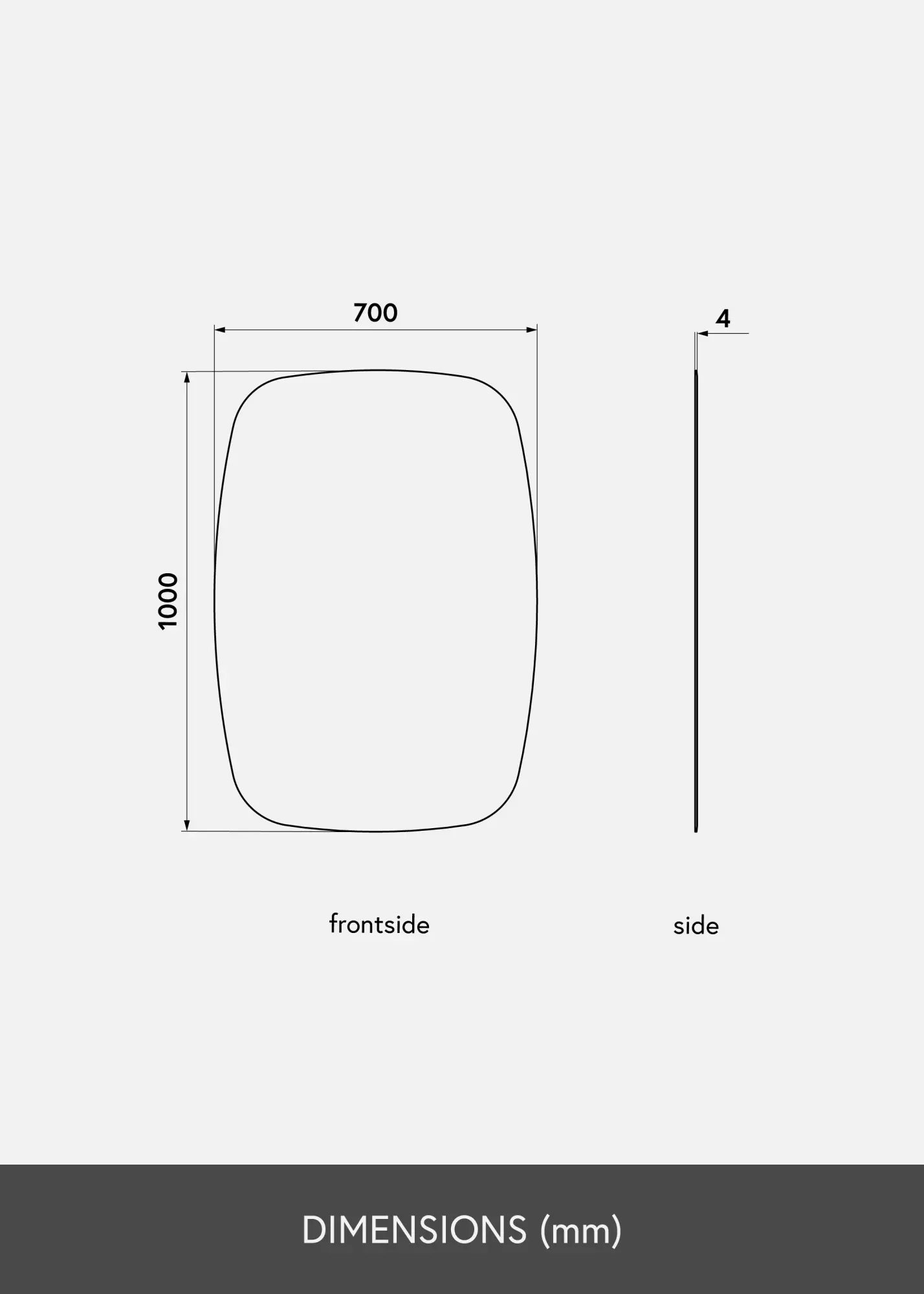 Prekrasno ogledalo iz KAILA, sa zaobljenim uglovima i zakrivljenim stranama koje stvaraju nevjerojatnu eleganciju. Ogledalo ima tanko, bezbojno staklo i nije opremljeno okvirom, što pojačava divan minimalistički osjećaj. Elegantni izgled čini da zidno ogledalo savršeno odgovara svakom domu. Zahvaljujući praktičnom zidnom nosaču, možete pričvrstiti ogledalo na zid. Ogledalo mjeri 70x100 cm.