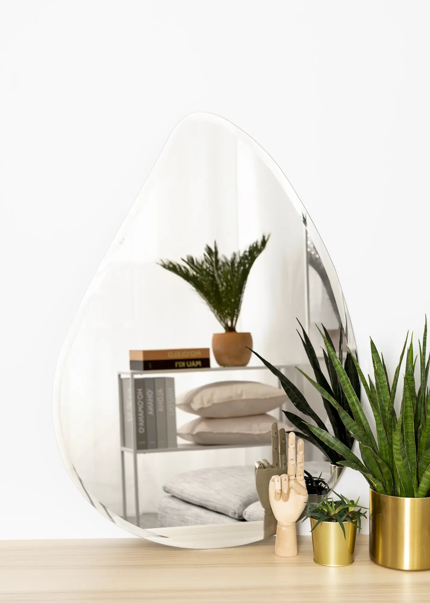 Ovo dekorativno zidno ogledalo ima mnogo stilskih dizajnerskih elemenata! Za početak, ogledalo je oblikovano kao kap, što stvara blag i elegantan dojam. To je dodatno kombinirano s brušenim rubom koji dodatno naglašava luksuzni izgled.