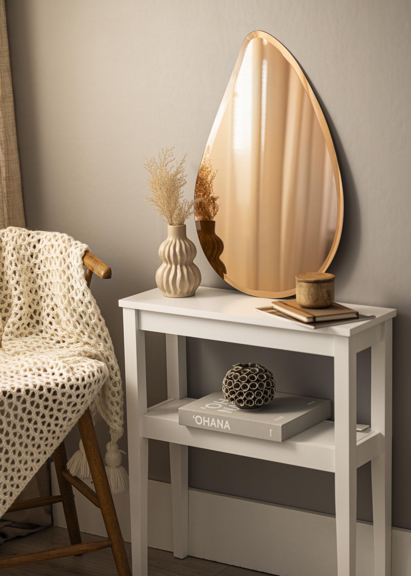 Ovo prekrasno ogledalo ima oblik kapljice, što mu daje nježan i elegantan izgled. Ogledalo je također opremljeno facetirano rezanim rubom – nešto što također pojačava ekskluzivni osjećaj. No ono što možda najviše čini ovo ogledalo doista trendi detaljem interijera je efektno i moderno rosé zlatno tonirano ogledalo!