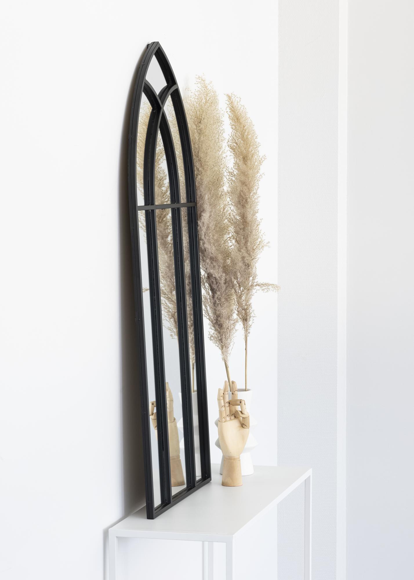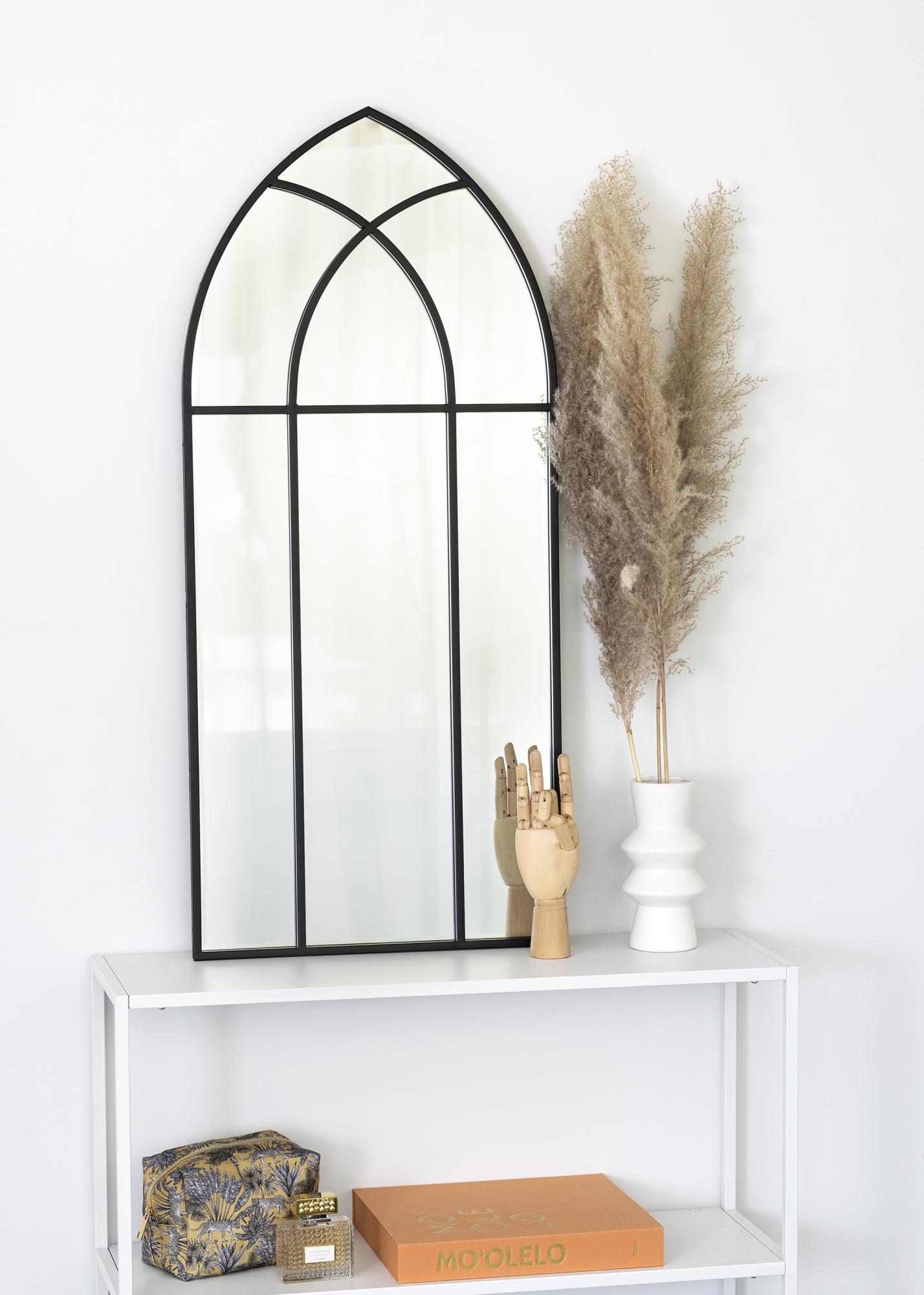 Ovo je vrlo dekorativno ogledalo koje odmah stvara romantiÄniju atmosferu u prostoru gdje je postavljeno! Ogledalo je oblikovano tako da podsjeÄa na vrtni prozor i ima malo gotiÄki karakter. Uzbudljiv oblik ogledala uÄinit Äe ga srediÅ¡njom toÄkom u vaÅ¡em domu! Ogledalo mjeri 45x100 i ima dekorativni uzorak od crnih tankih linija u metalu.