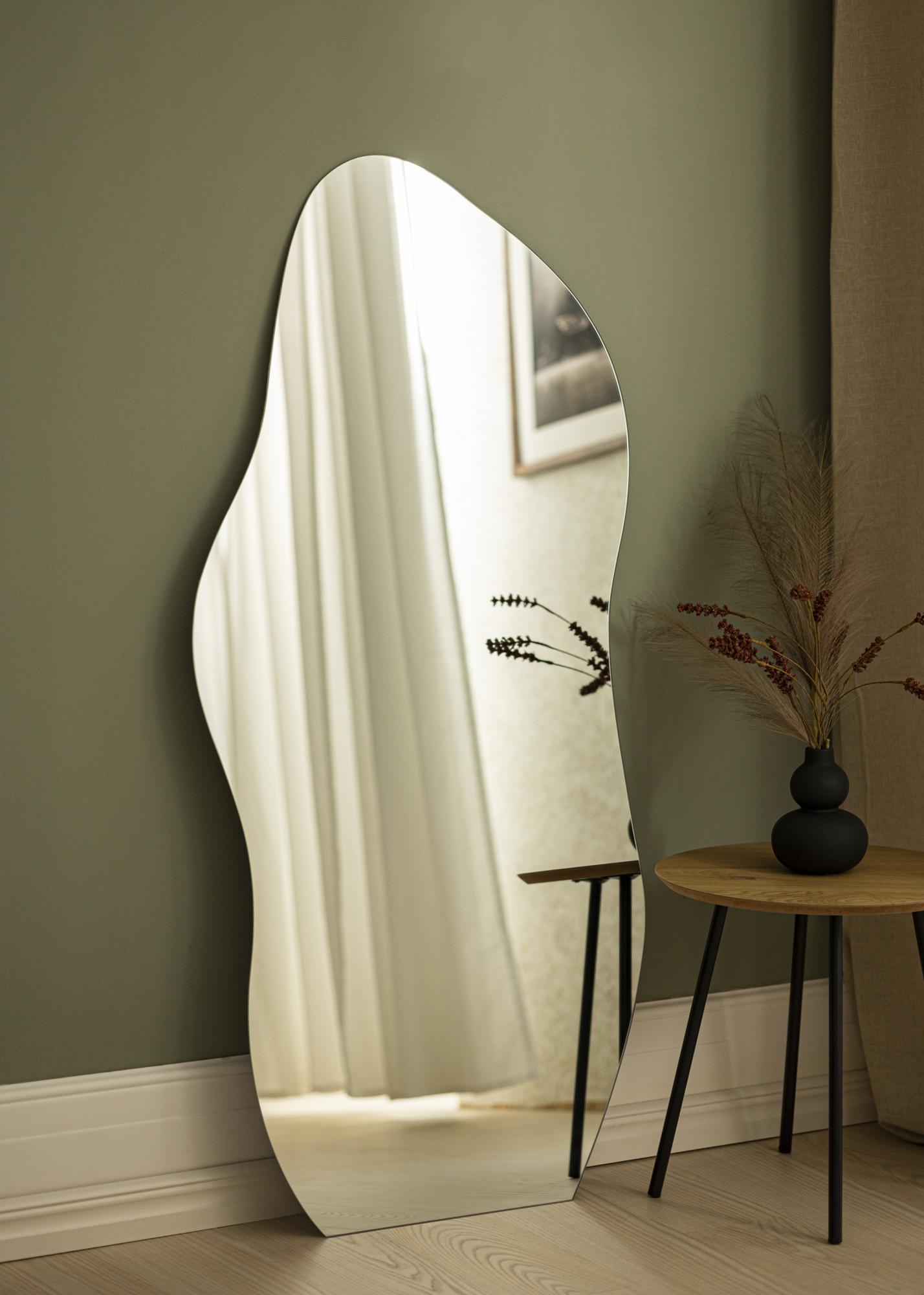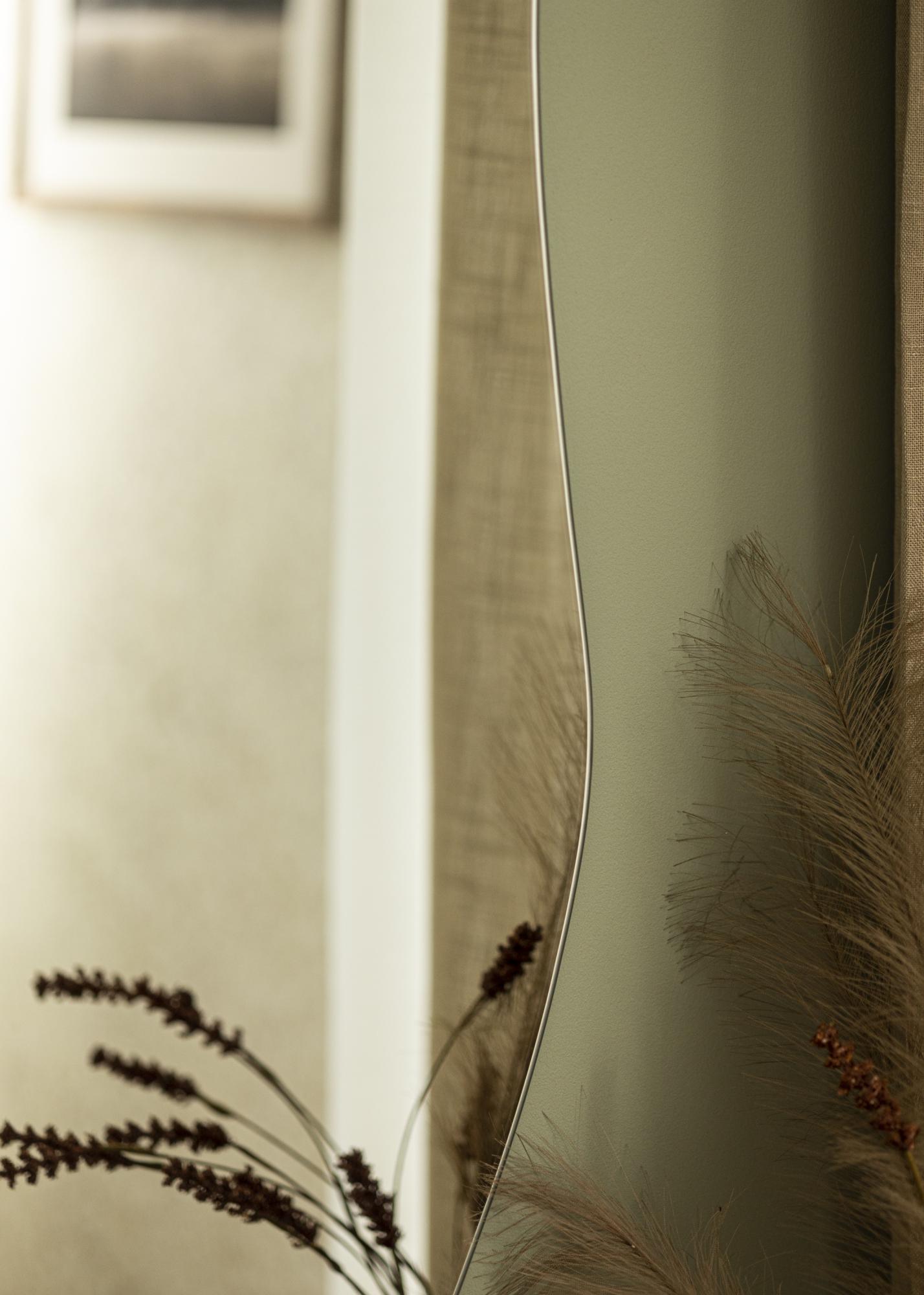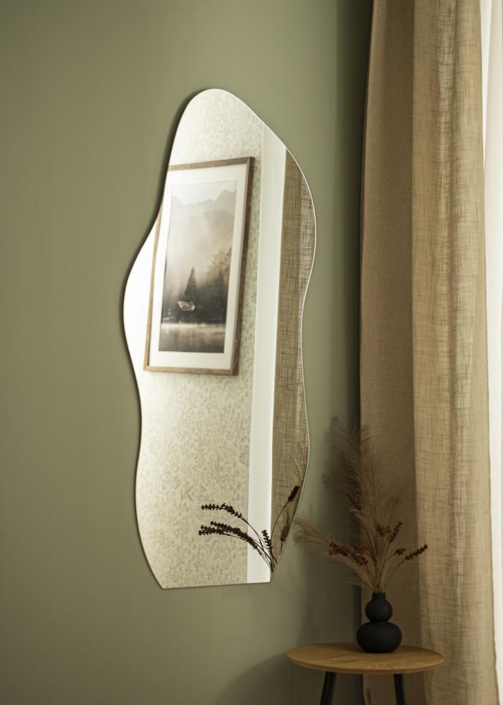 Ovo je zidno ogledalo u trendi dizajnu, sa stranama s mekim valovitim oblikom. Donji rub je ravan, Å¡to Äini ogledalo posebno elegantnim za objesiti iznad namjeÅ¡taja, gdje donji rub ogledala postaje paralelna linija s gornjom stranom komode ili pomoÄnog stola. Ogledalo ima zidne nosaÄe na stražnjoj strani i postavlja se na zid u uspravnom položaju.