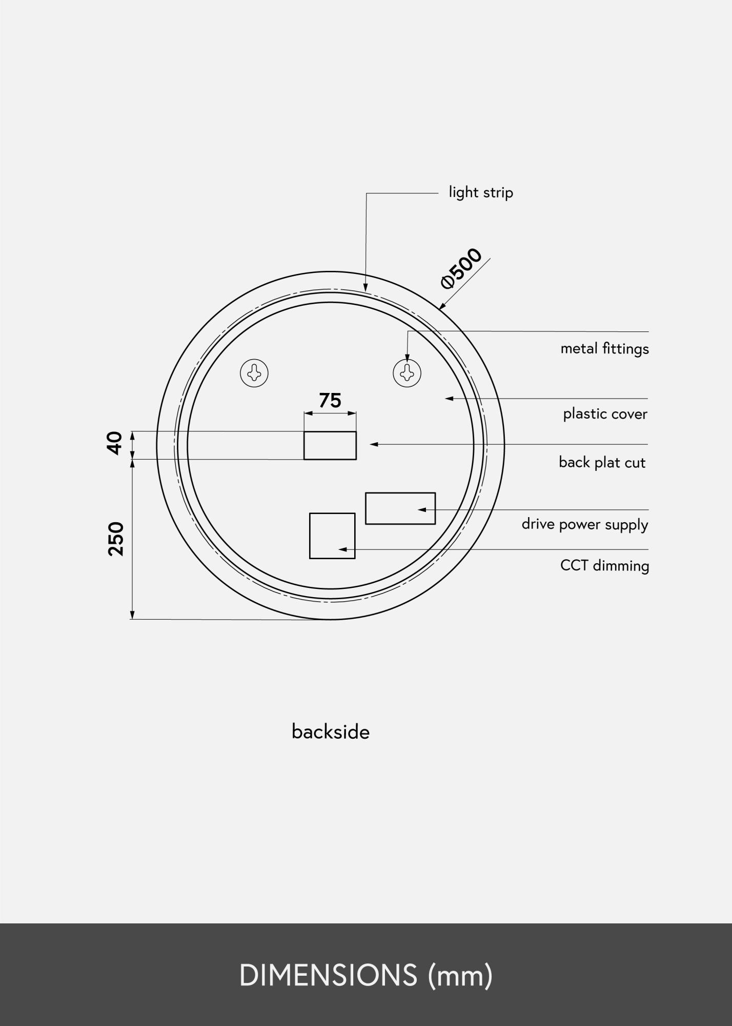 Ogledalo je odobreno za kupaonicu, ali njezin bezvremenski i elegantan dizajn takoÄer dobro izgleda na drugim zidovima u domu. Ogledalo ima promjer od 50 cm, samo je 3 cm duboko i ima zidne nosaÄe. Ogledalo je namijenjeno za fiksnu instalaciju i povezuje se na prekidaÄ. Da bi ogledalo ispravno radilo, treba ga povezati na obiÄni prekidaÄ, a ne na priguÅ¡ni prekidaÄ.