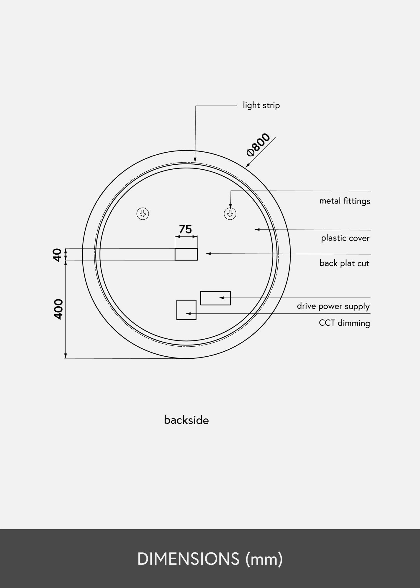 Ogledalo je odobreno za kupaonicu, ali njegov bezvremenski i elegantni dizajn takoÄer se lijepo uklapa na druge zidove u kuÄi. Ogledalo ima promjer od 80 cm, duboko je samo 3 cm i ima zidne nosaÄe. Ogledalo je namijenjeno za fiksnu ugradnju i spaja se na prekidaÄ. Da bi ogledalo ispravno funkcioniralo, treba biti povezano na obiÄan prekidaÄ, a ne na prekidaÄ za priguÅ¡ivanje.