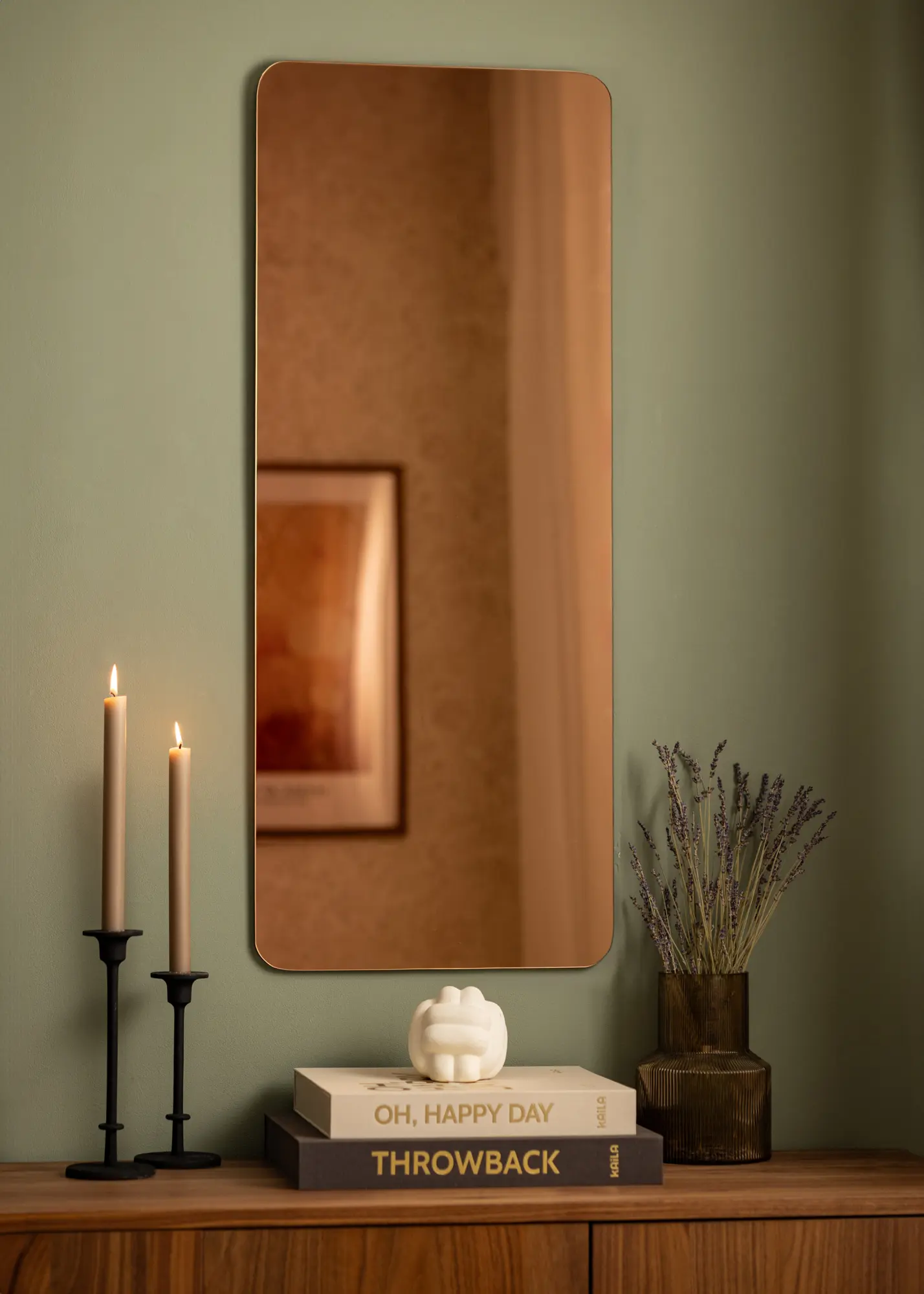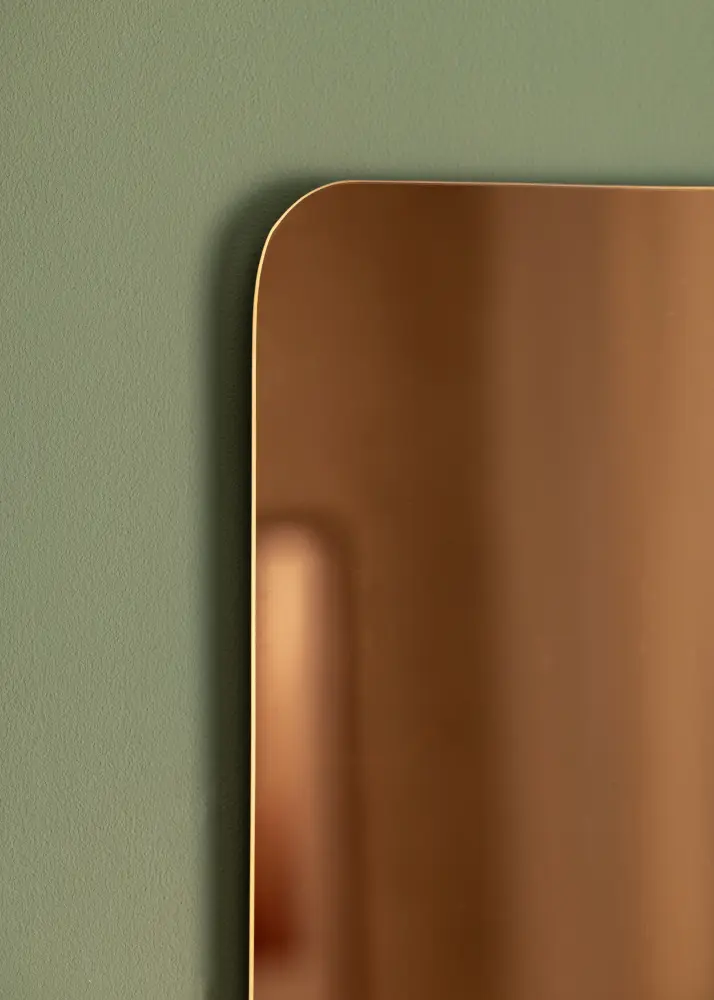 Pravokutno ogledalo s nježno zaobljenim kutovima koje dodaje mnogo elegancije cijelom izgledu! Ogledalo također ima staklo u tonovima ružičastog zlata što ga čini vrlo upadljivim na vašem zidu – dok istovremeno zadržava svoj elegantan izgled. Ovo trendi ogledalo je također vrlo tanko i nije opremljeno okvirom, što dodatno pojačava osjećaj stilskog dizajna.