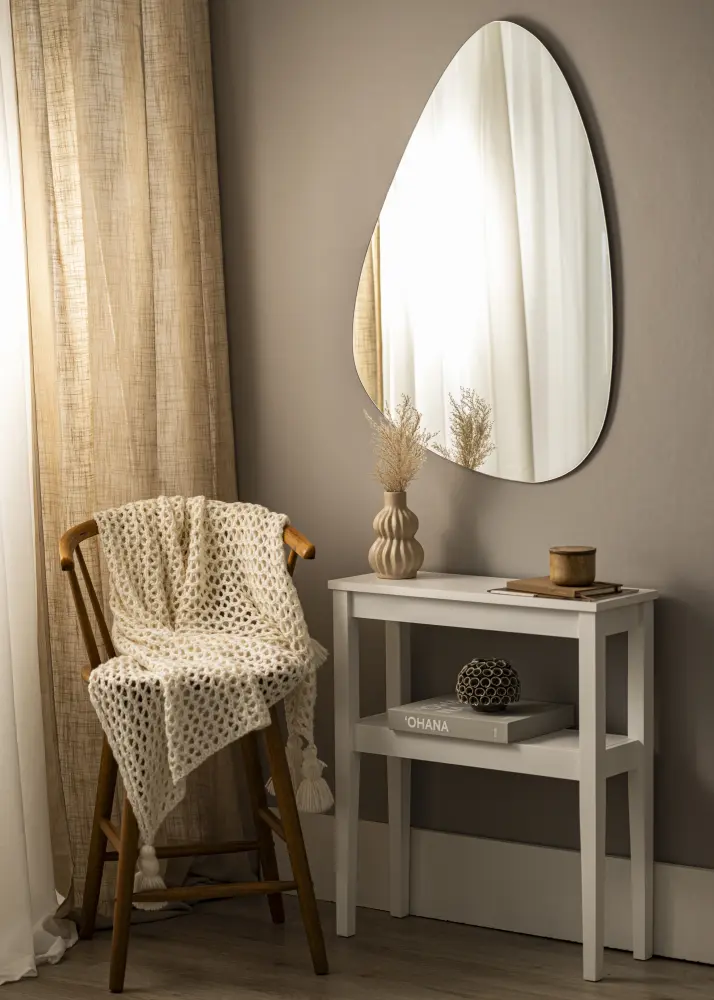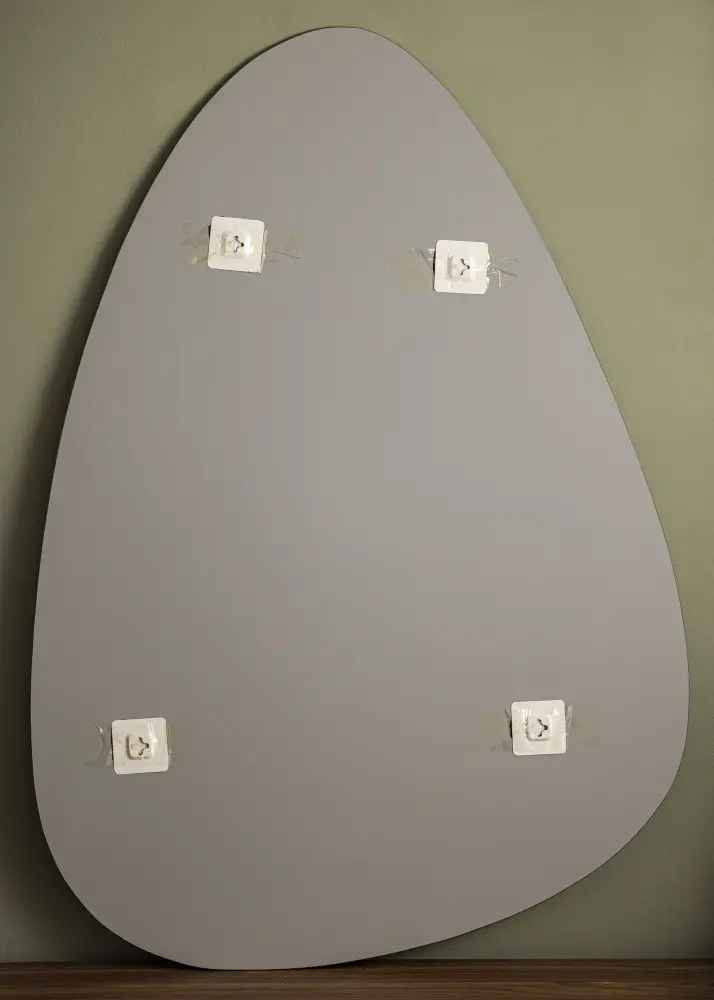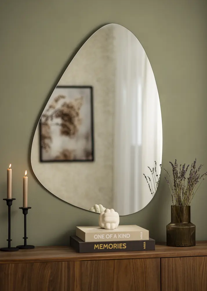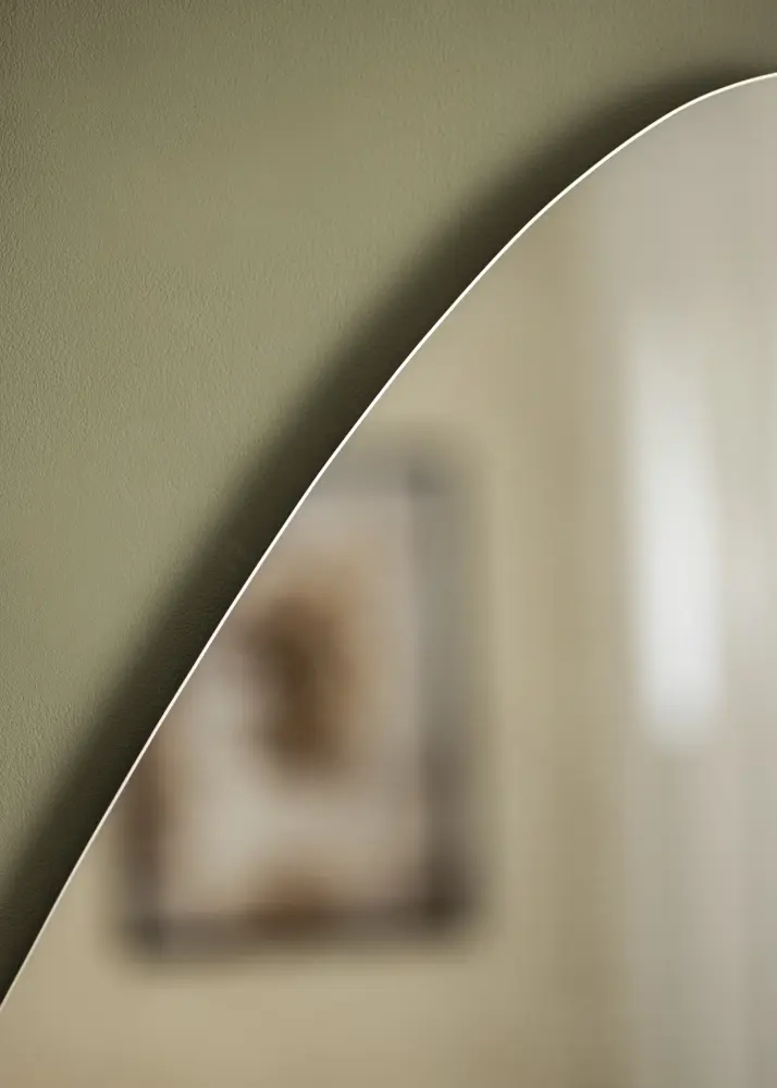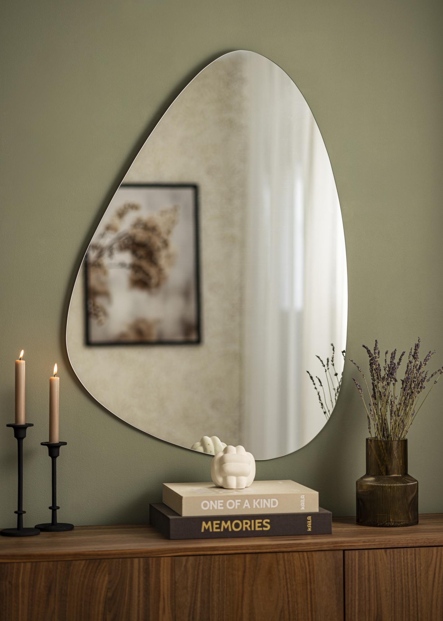Ovo ogledalo ima trendi i asimetričan oblik – gotovo poput jajeta. Mekan i elegantan oblik koji stvara laganu i privlačnu atmosferu u prostoriji u kojoj se nalazi. Ogledalo je također vrlo tanko, što pojačava profinjen i elegantan izgled.