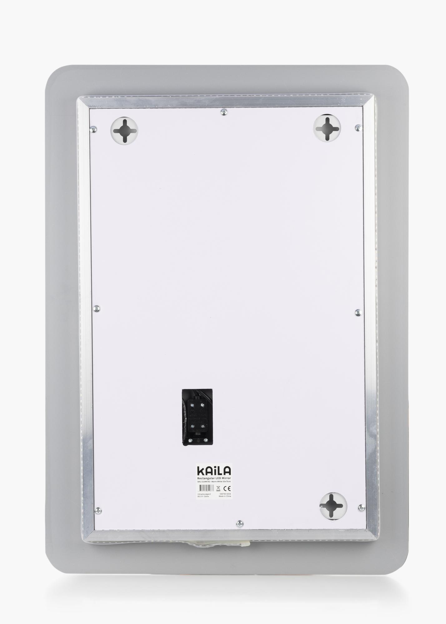 Ovo ogledalo za kupaonicu iz KAILA-e pravokutnog oblika ima meke rubove i mjeri 50x70 cm. Ogledalo ima integrirano LED osvjetljenje koje svijetli iza ruba i daje lijep sjaj naprijed. Osvjetljenje daje svjetlo od 3000K koje je topla bijela nijansa. Savršeno za nanošenje, primjerice, šminke! Osvjetljenje je podesivo, a jednostavno podesite jačinu držeći tipku na zaslonu nekoliko sekundi. Ogledalo ima funkciju koja pamti posljednju postavku osvjetljenja sljedeći put kad ga upalite.