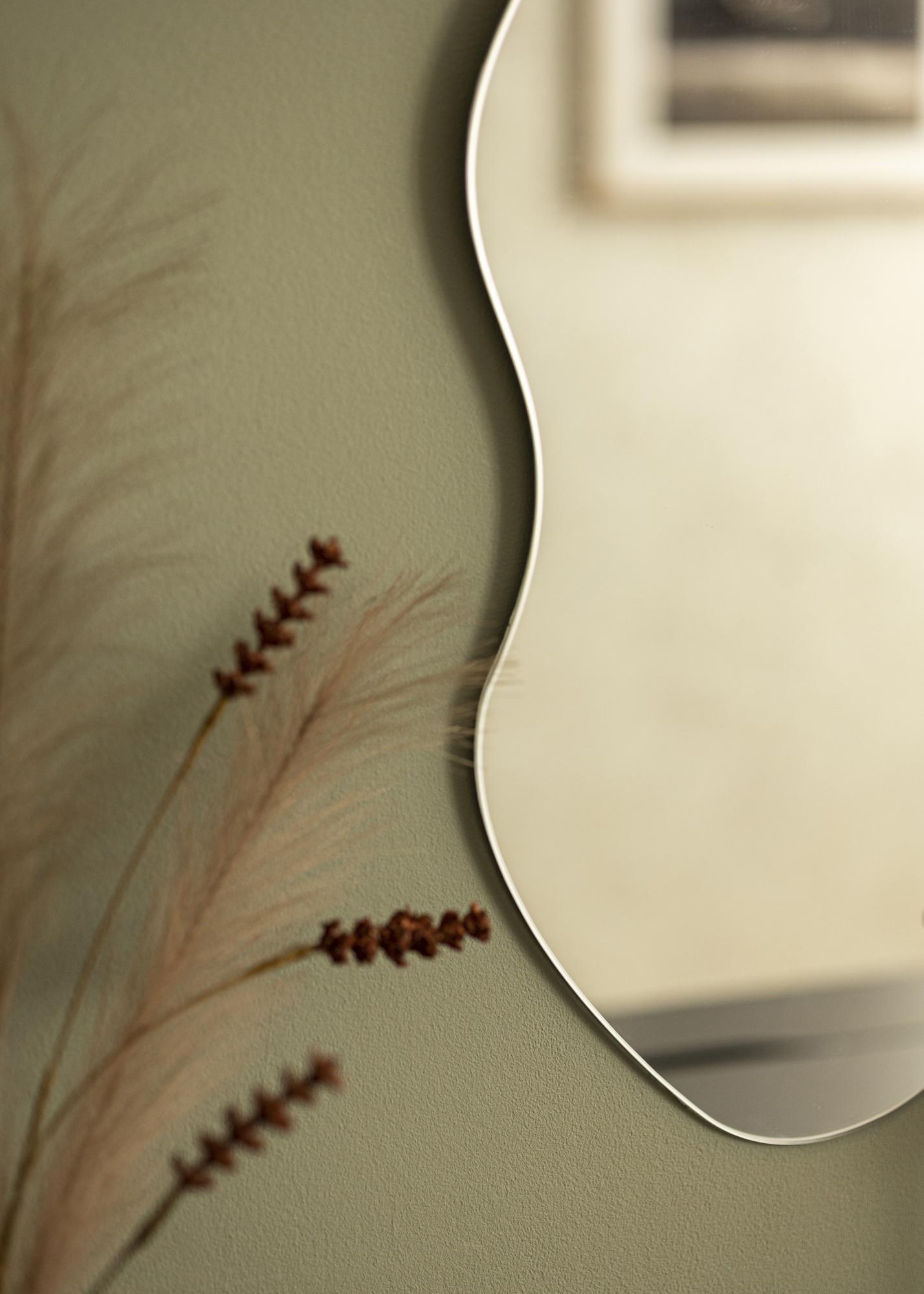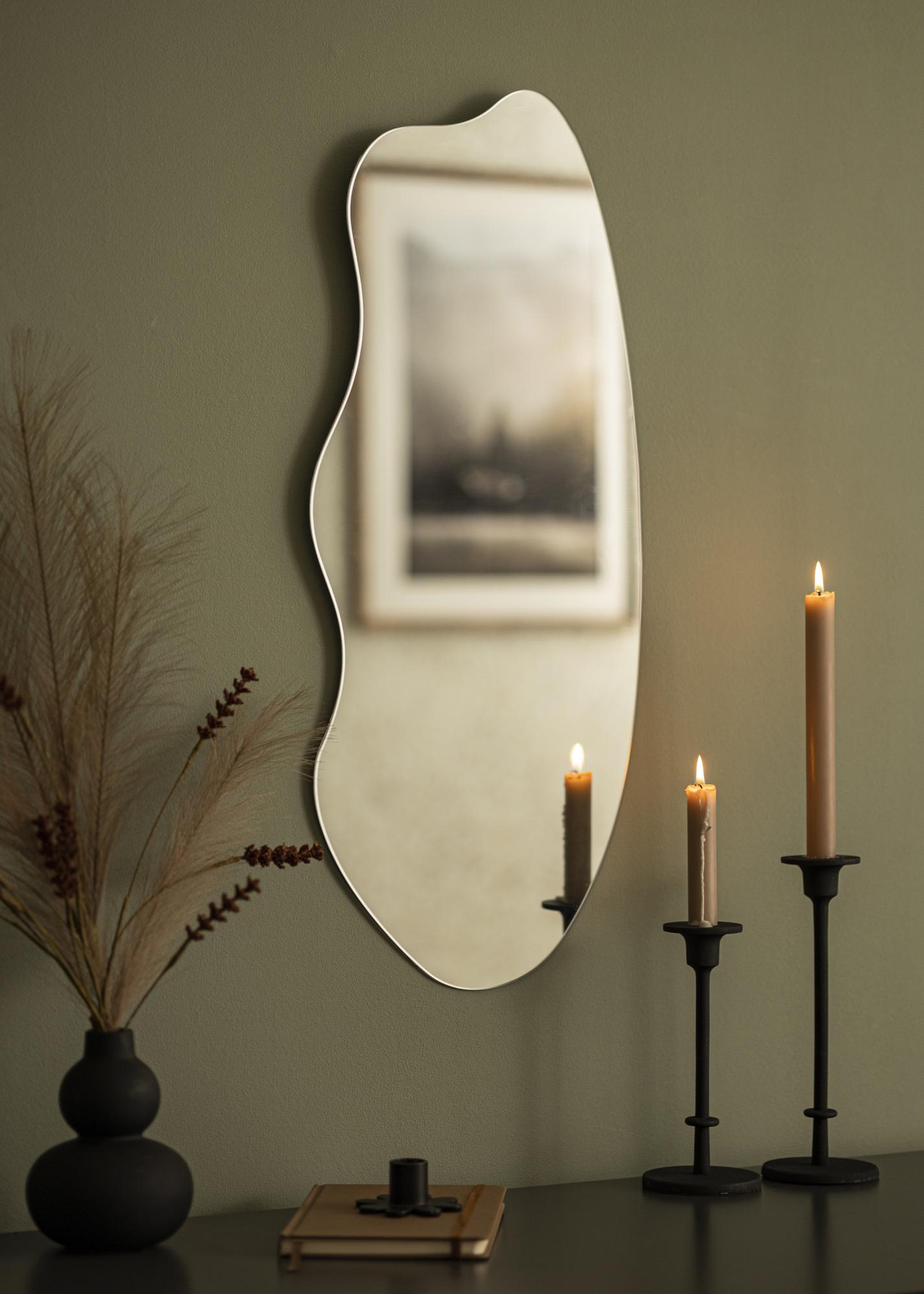 Asimetrično zidno ogledalo postaje upečatljiv element u svakom domu. Ovo ogledalo ima jedinstven oblik, pri čemu je jedna duga strana zaobljena, a druga ima valovit oblik. Zajedno tvore uzbudljivu i elegantnu cjelinu. Ogledalo jednako dobro pristaje u hodniku kao i u dnevnom boravku, a funkcionira i kao trendi kupaonsko ogledalo.