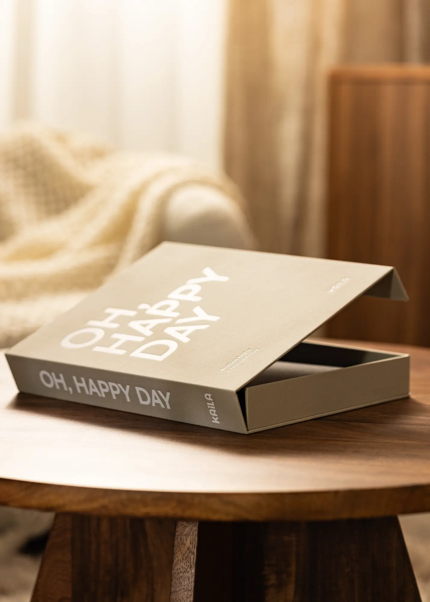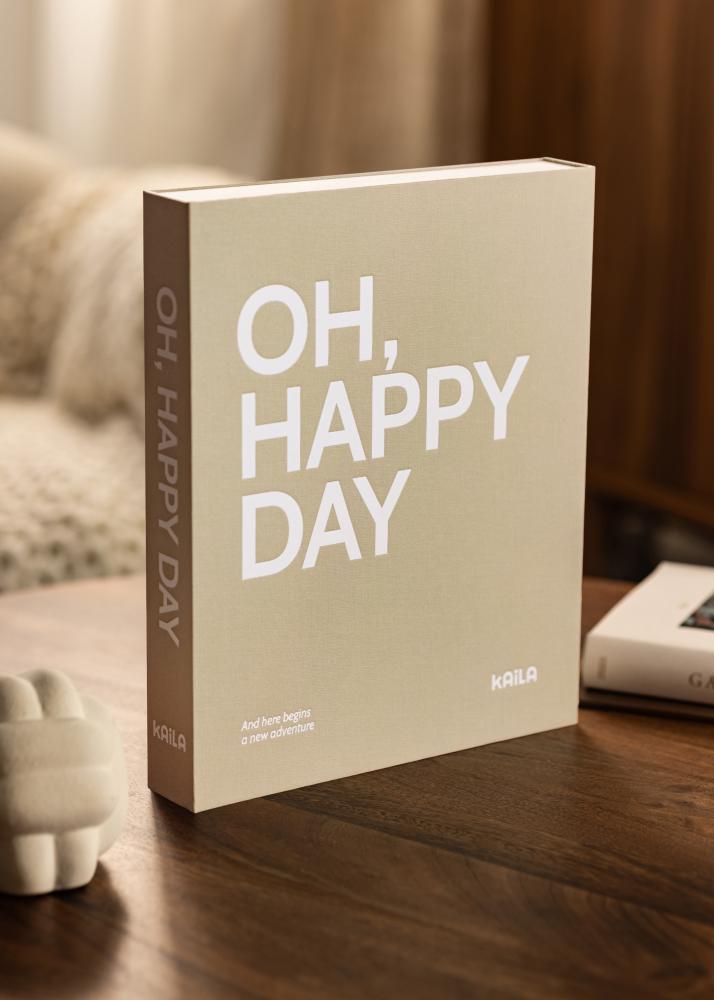Ovdje je savršeni foto album za vaše najsretnije uspomene od KAILA! Pohranite ih sa stilom u lagani tekstilni album koji također postaje elegantan detalj interijera u vašem domu. Ovaj album ima naslov „OH, HAPPY DAY” otisnut na prednjoj strani velikim bijelim slovima i podnaslov „I ovdje počinje nova pustolovina”.