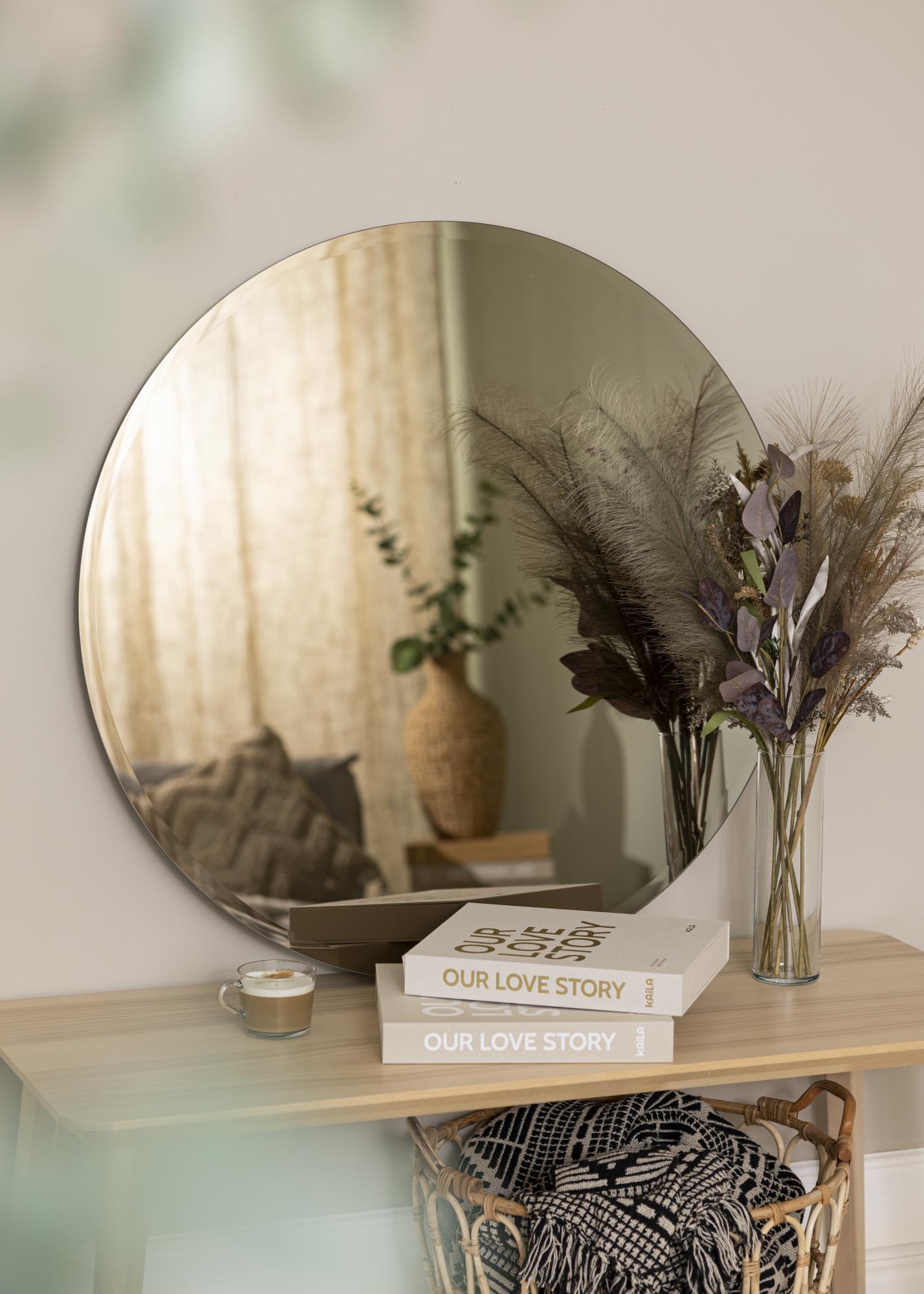 Zrcalo u tamnijoj brončanoj nijansi bit će ekskluzivan detalj u vašem domu. Ovo zidno zrcalo ima mekani okrugli oblik i elegantno brončano zrcalno staklo. Ekskluzivni dojam nadopunjuje brušeni fasetirani rub. Zrcalo funkcionira jednako dobro samo kao i u kombinaciji s drugim zrcalima različitih veličina i nijansi boja.
