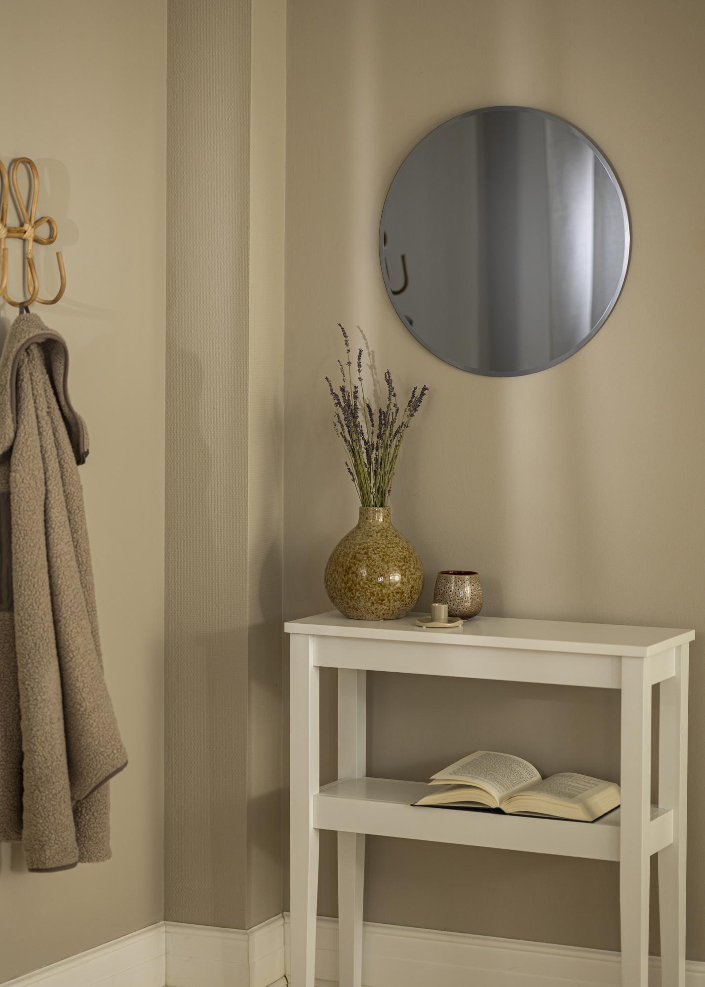 Zrcalo s toniranim staklom je izvrstan ukrasni element s puno karaktera. Ovo je okrugla varijanta s sivo toniranim staklom – prigušena nijansa koja daje luksuzan, hotelski dojam. Siva boja odlično se uklapa u domove uređene u tamnijem stilu, ali također postaje elegantan kontrast na svijetlim zidovima. Ovo zidno zrcalo reflektira svjetlost poput običnog zrcala, ali u mekšoj svjetlosnoj nijansi.