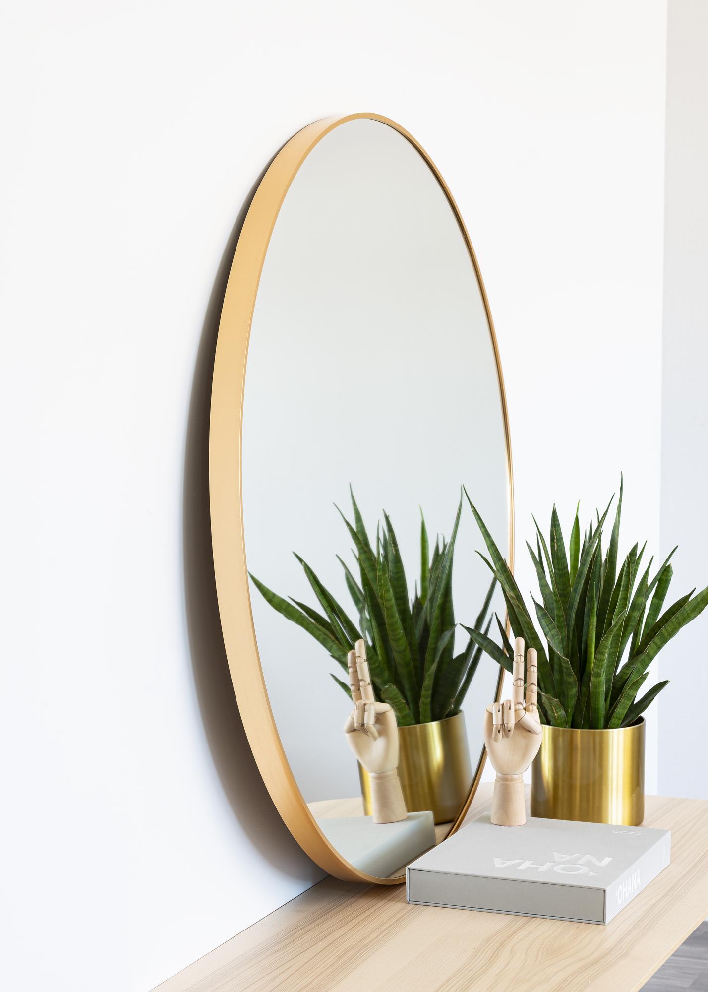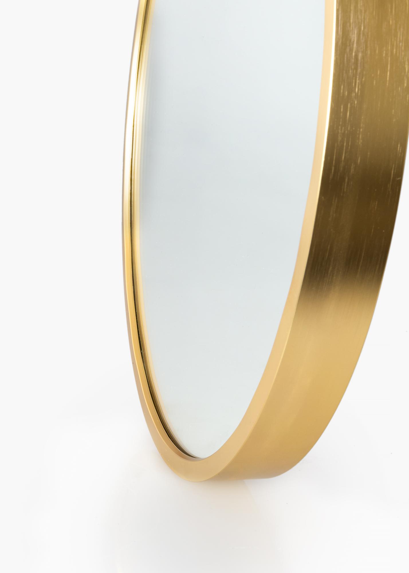 Okruglo ogledalo u elegantnom švedskom dizajnu s metalnim okvirom u prekrasnoj zlatnoj završnoj obradi. Okvir ima brušenu površinu, što daje predivnoj zlatnoj boji pomalo mat izgled. Okvir je također trendi tanak, ali istovremeno – ovisno o veličini – dubok 30-40 mm, što ga čini izbočenim sa zida i stvara upečatljiv 3D efekt. Dubina okvira također čini da ogledalo djeluje čvrsto i robusno, a da pritom ne narušava njegov minimalistički osjećaj.