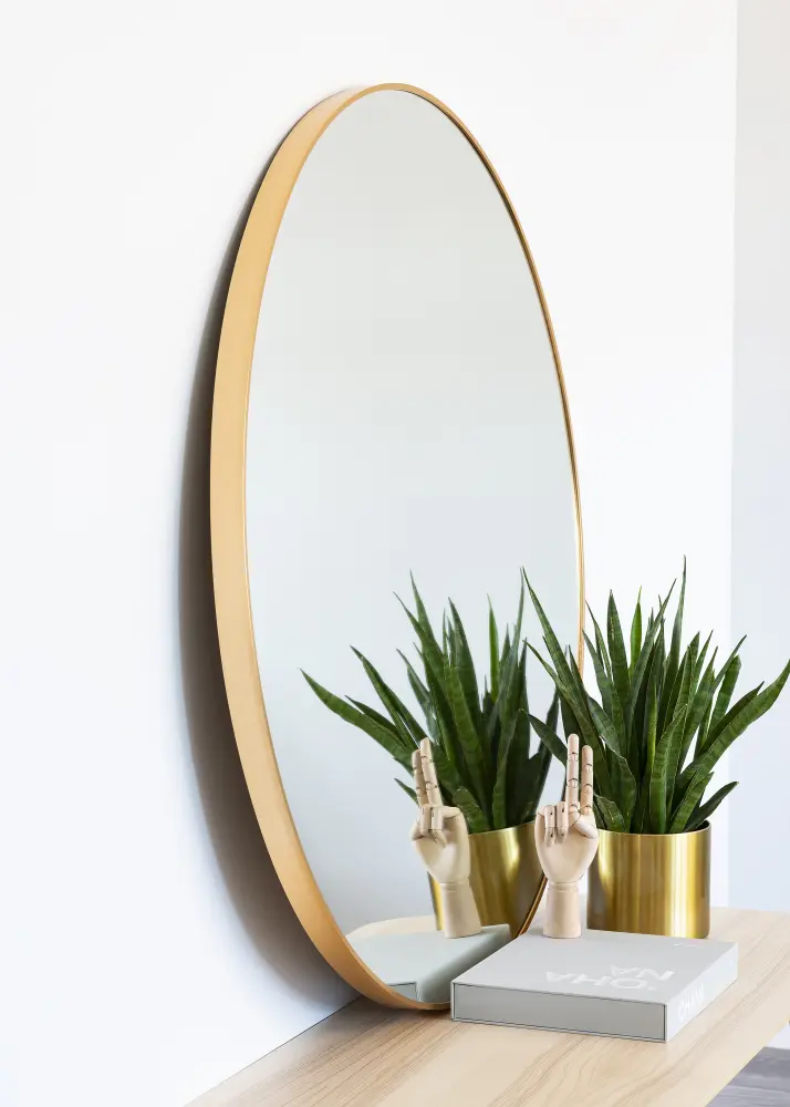 Okruglo ogledalo u elegantnom švedskom dizajnu s metalnim okvirom u prekrasnoj zlatnoj završnici. Okvir ima brušenu površinu, što daje prekrasnoj zlatnoj boji malo matiraniji izgled. Okvir je također moderno tanak, ali istovremeno – ovisno o veličini – ima dubinu između 30-40 mm, što znači da izlazi malo iz zida i stvara impresivan 3D efekt. Dubina okvira također čini da se ogledalo osjeća čvrsto i robusno, bez da gubi svoju minimalističku osjećajnost.